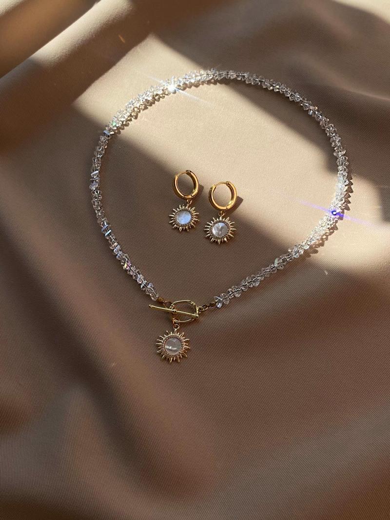 Кольє з космічного кришталю та ланцюжків з перламутровим кулоном