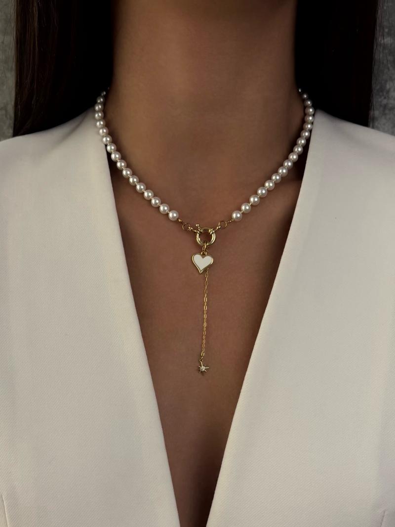 Кольє з натуральних перлин та ланцюжка з білим серцем