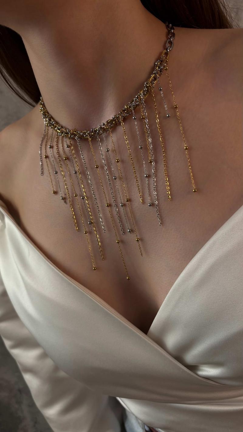 Стильне багатошарове кольє з перлинами та ланцюжками