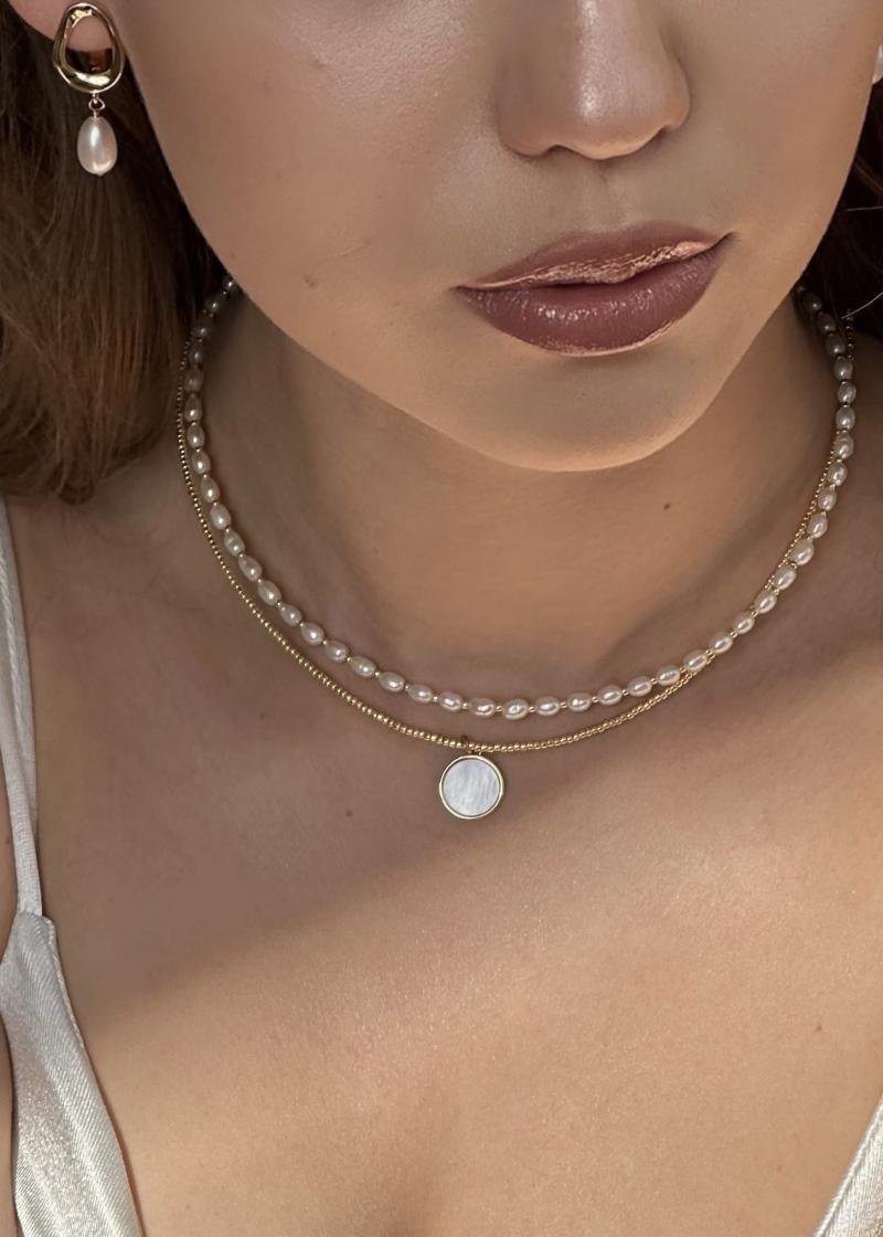 Стильне багатошарове кольє з перлинами та ланцюжками