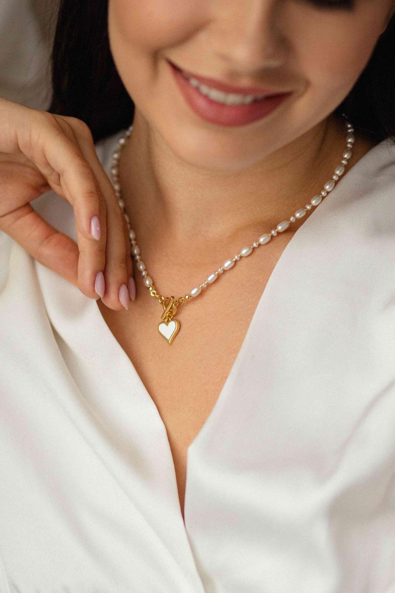 Мінімалістичне кольє з натуральних перлин з кулоном біле серце