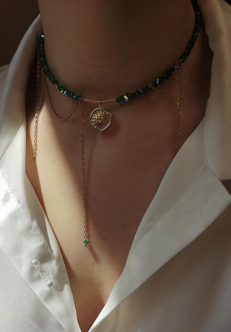 Кольє з відбірного кришталю та ланцюжків з перламутровим сонцем