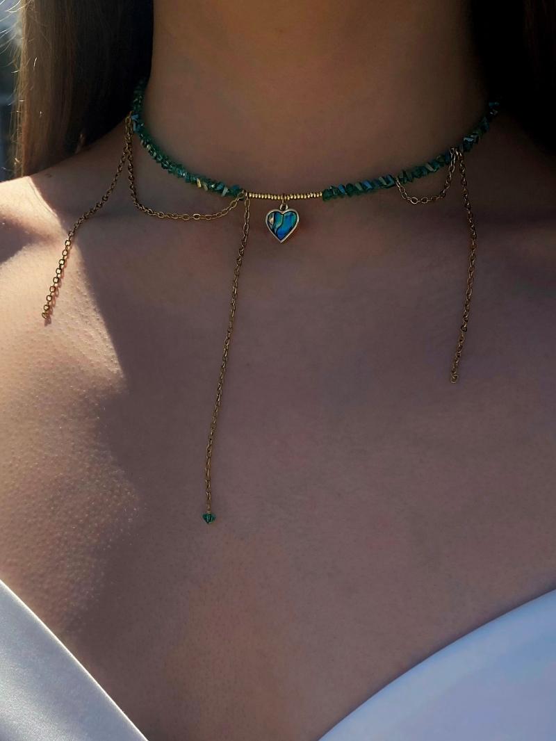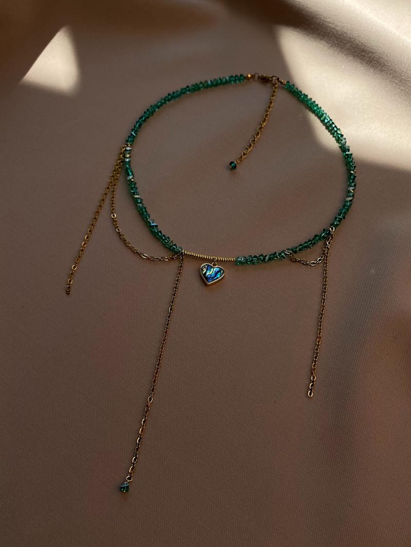 Кольє з зеленого кришталю з перламутровим кулоном