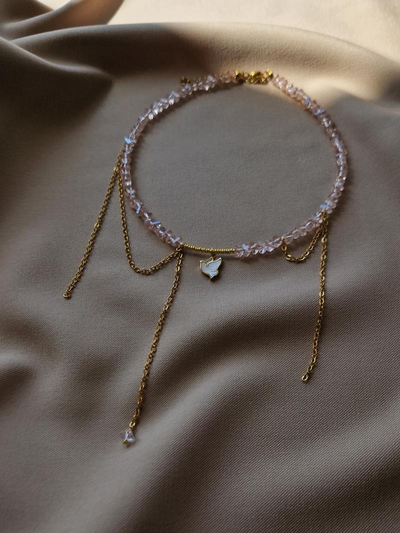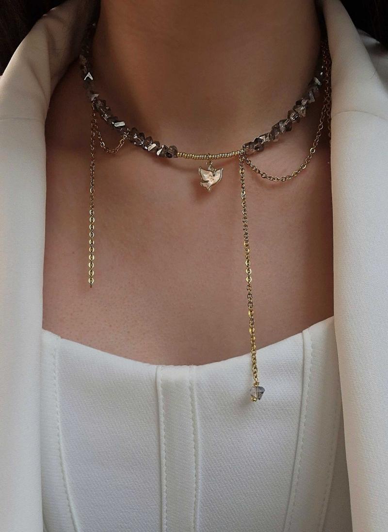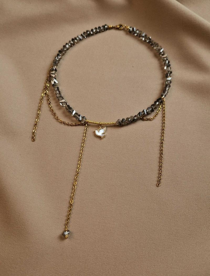 Кольє з сірого кришталю та ланцюжків з перламутровою пташкою