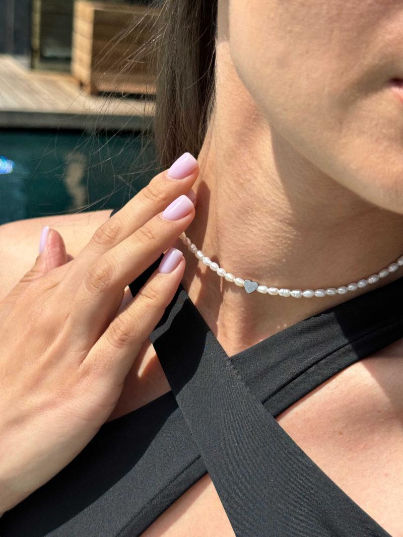 Чокер з натуральних перлин з кулоном серце у фіанітах