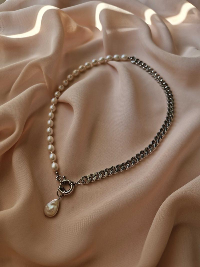 Кольє з гематиту, перлин та ланцюжків