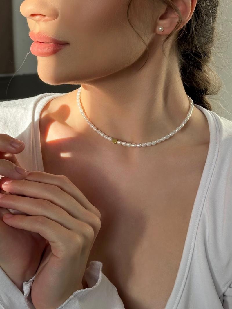 Чокер з натуральних перлин з додаванням позолоченого серця. Матеріал фурнітури ювелірна нержавіюча сталь (у золотому кольорі). Замір шиї моделі 32 см впритул. Стандартна довжина 36 см + 6 см подовжувач.