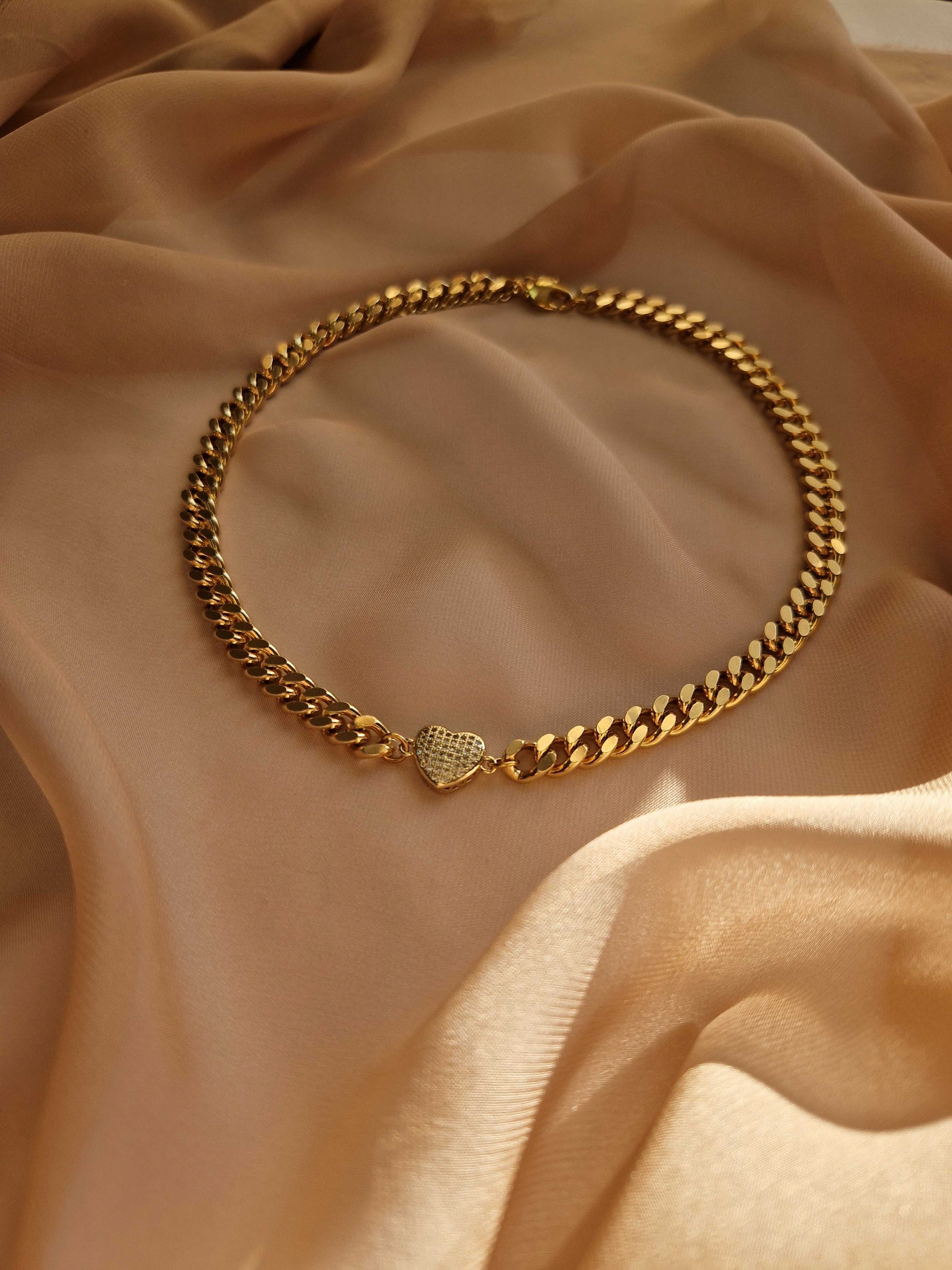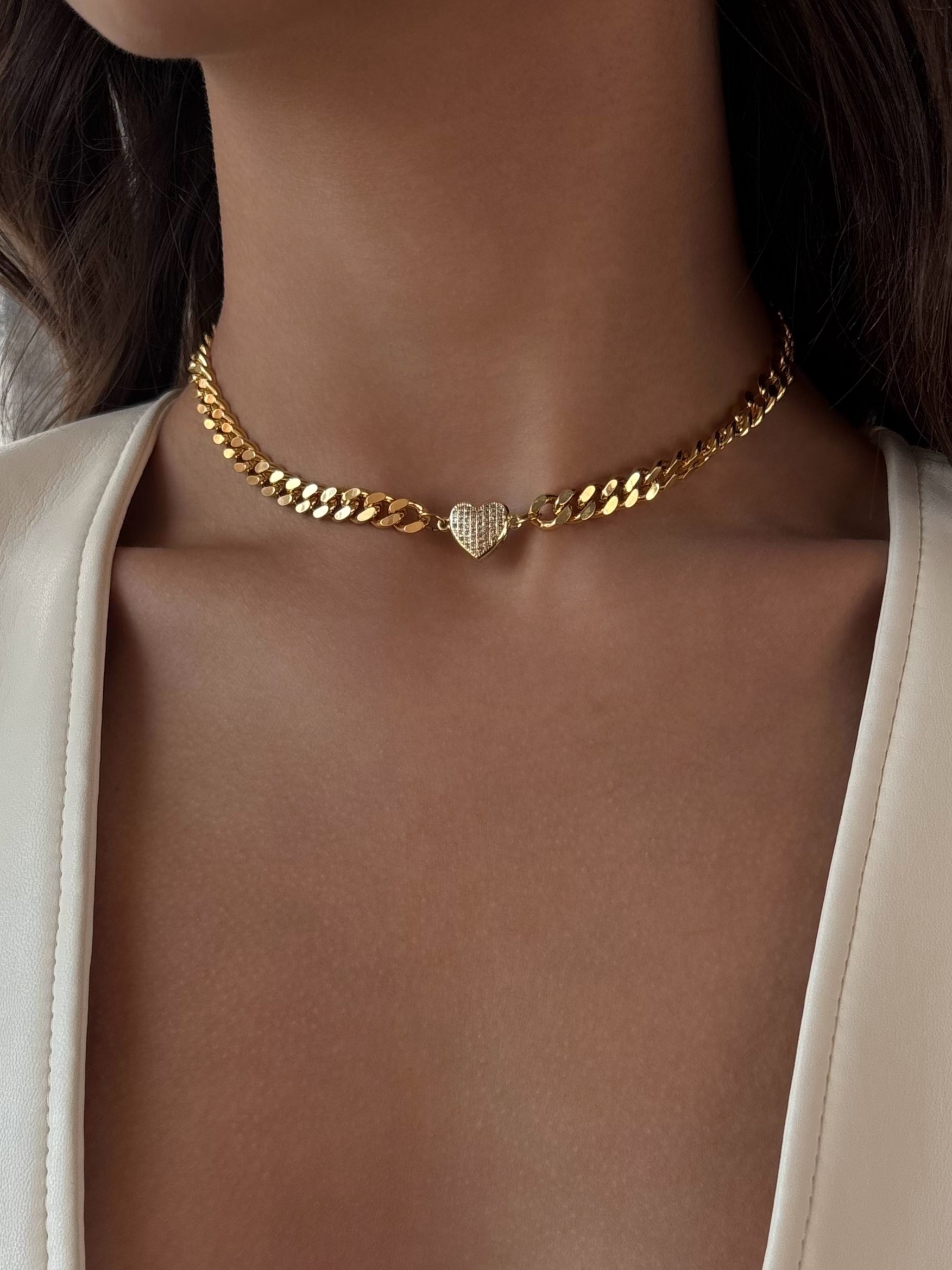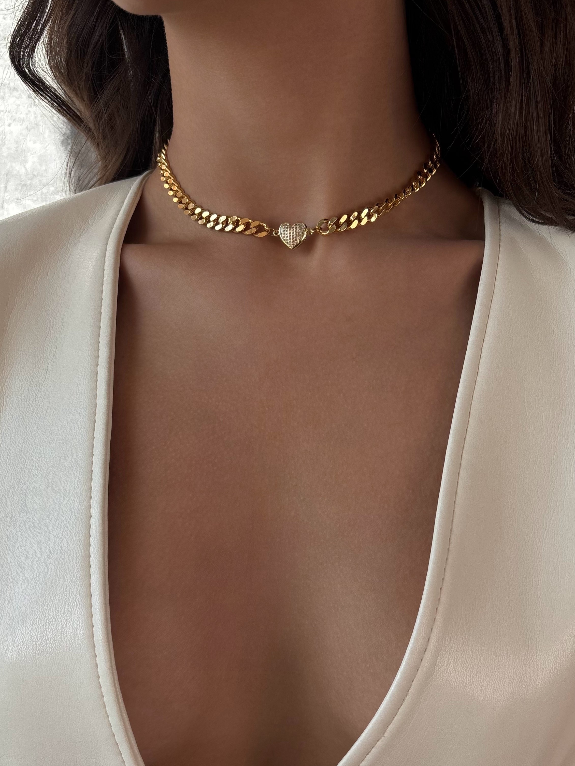 Вкорочене кольє з панцирного ланцюжка із конектором серце. Матеріал фурнітури латунь з покриттям позолоти 18 карат (у золотому кольорі). Серце повністю вкрите фіанітами. Стандартна довжина чокера навколо шиї 38 см та 6 см подовжувач. Замір шиї моделі - 29 см впритул.