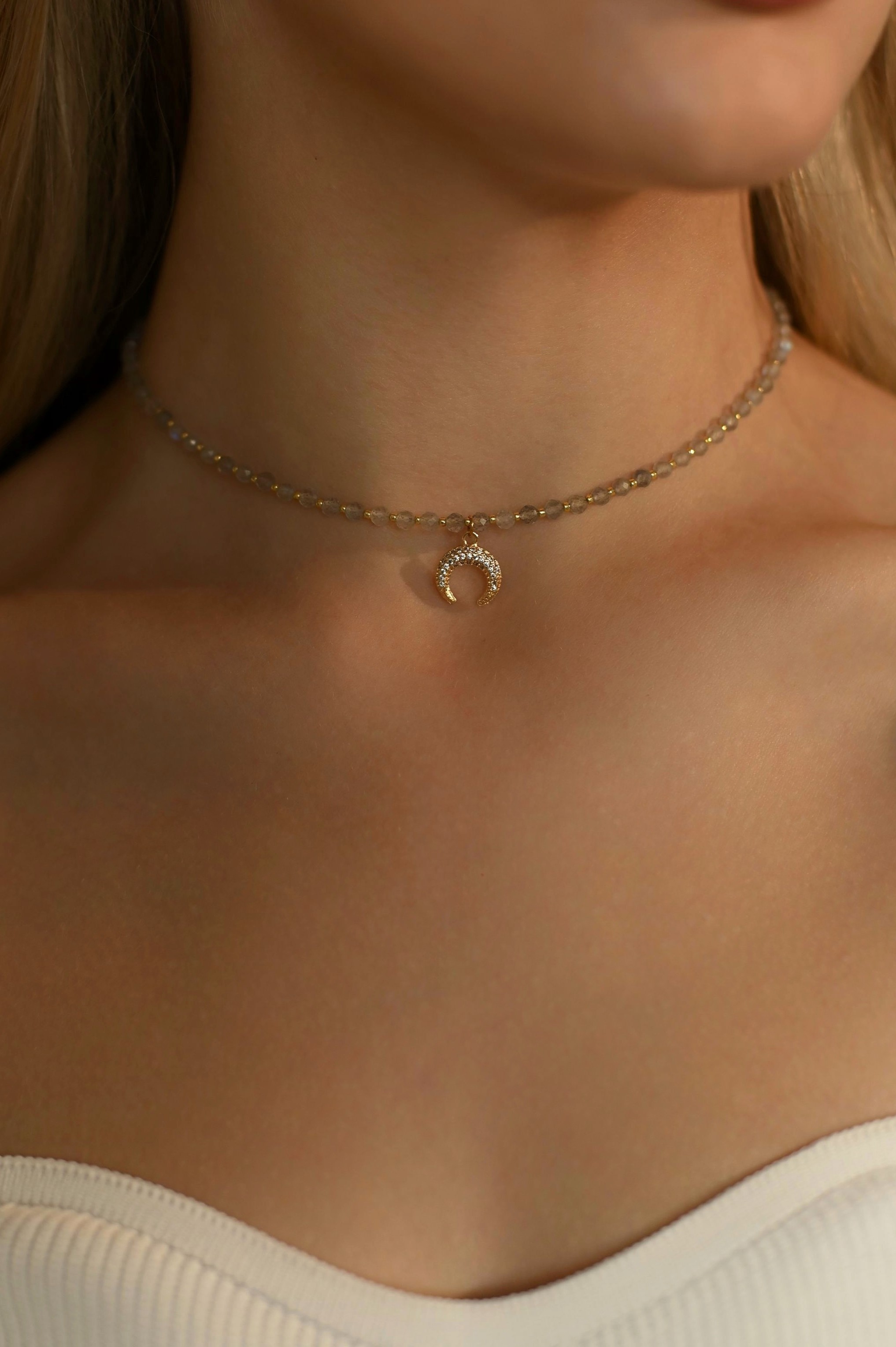 Чокер з натурального лабрадору з кулоном лунниця у фіанітах