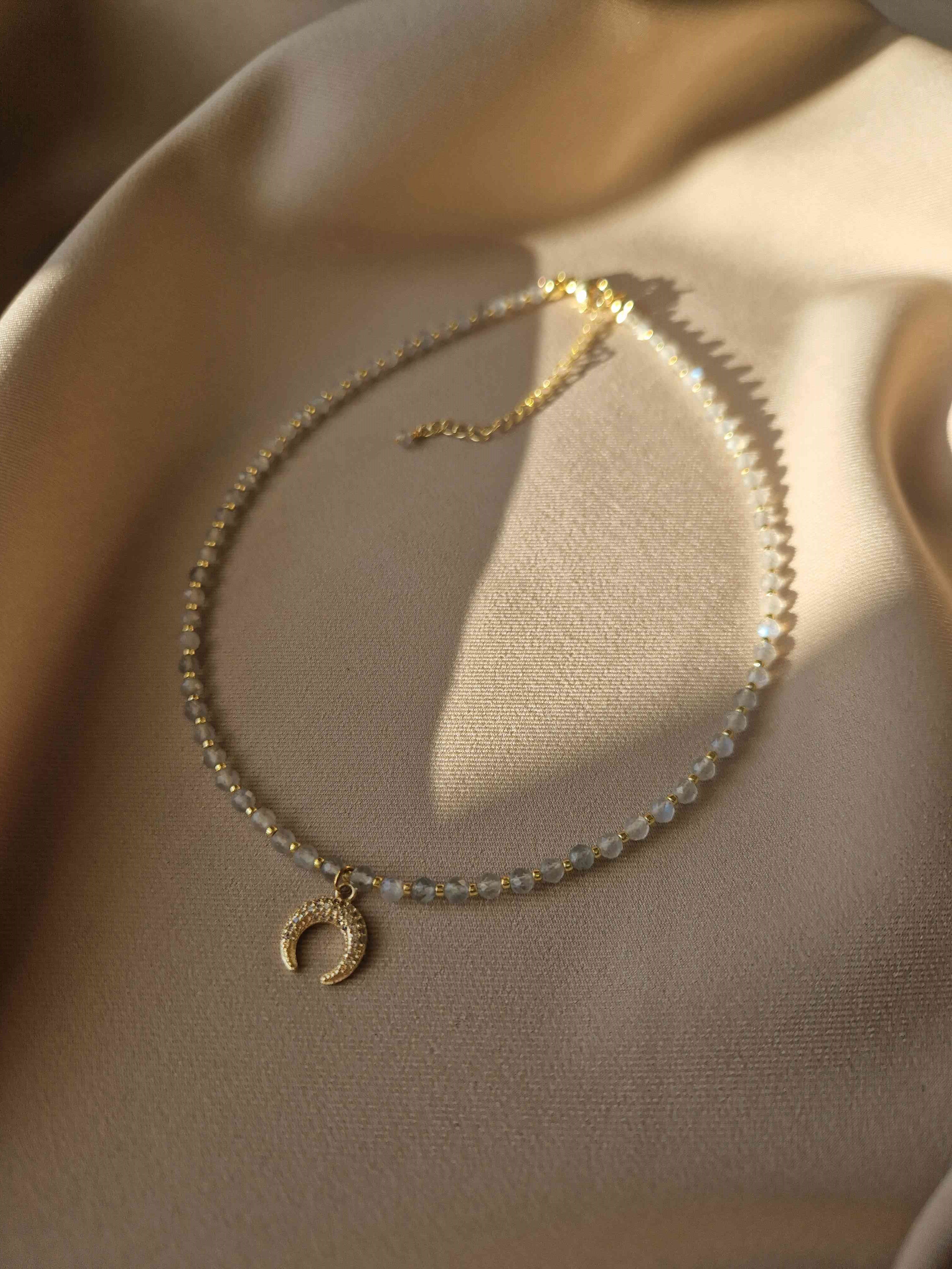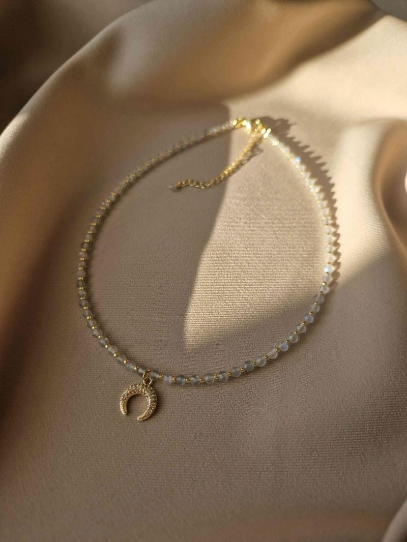 Чокер з неповторного лабрадору з японським бісером. Лунниця вкрита фіанітами. Фурнітура преміум якості: ювелірна нержавіюча сталь та латунь з позолотою 18 карат. Бісер з гальванічним покриттям. Замір шиї моделі 29 см в притул. Стандартна довжина чокера 36 см + 6 см подовжувач.
