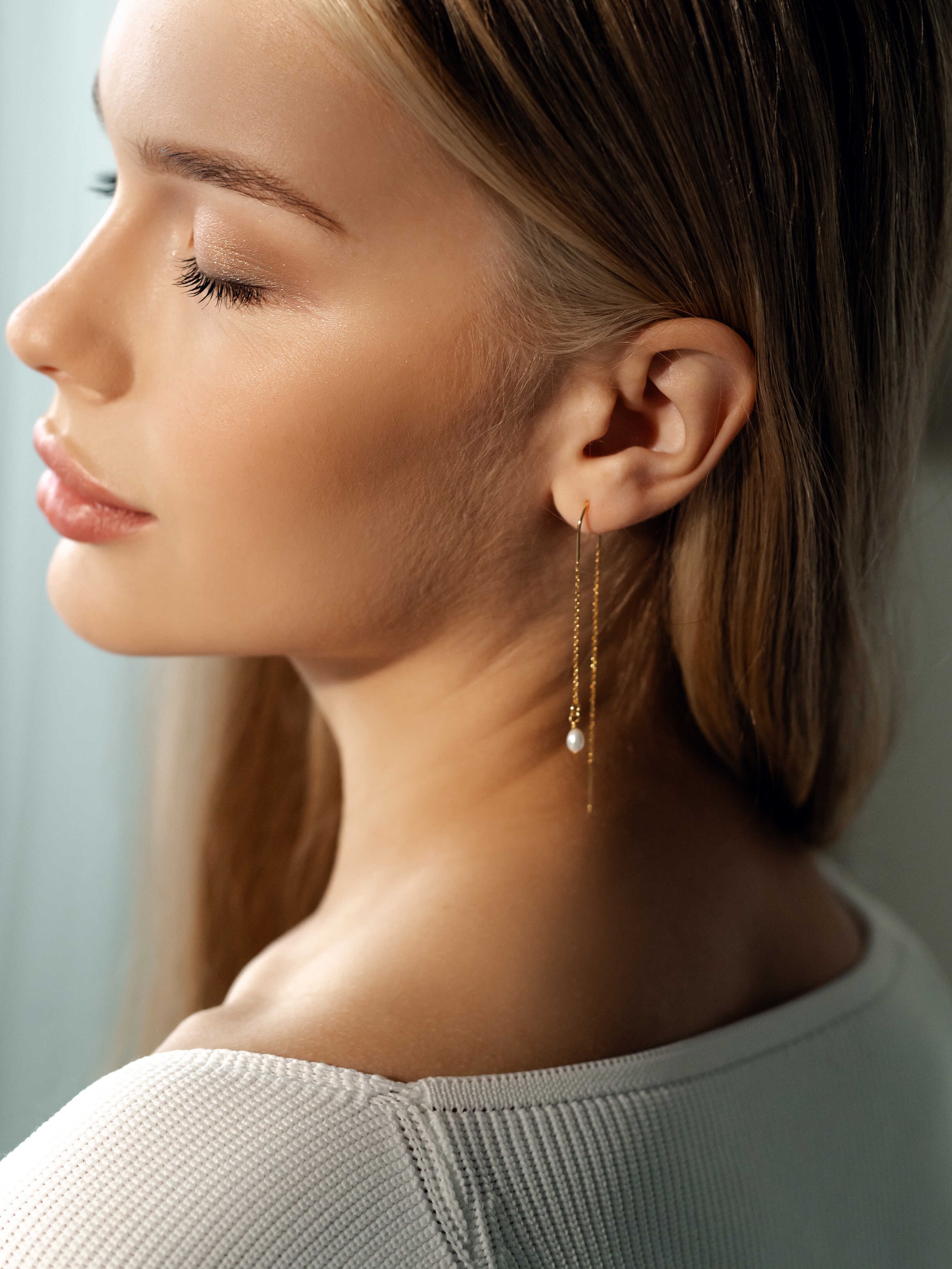 Базові сережки протяжки з натуральними перлинами. Матеріал  латунь з покриттям позолоти 18 карат (у золотому кольорі). Загальна довжина 7.5 см. Дуже легкі, гіппоалергенні.