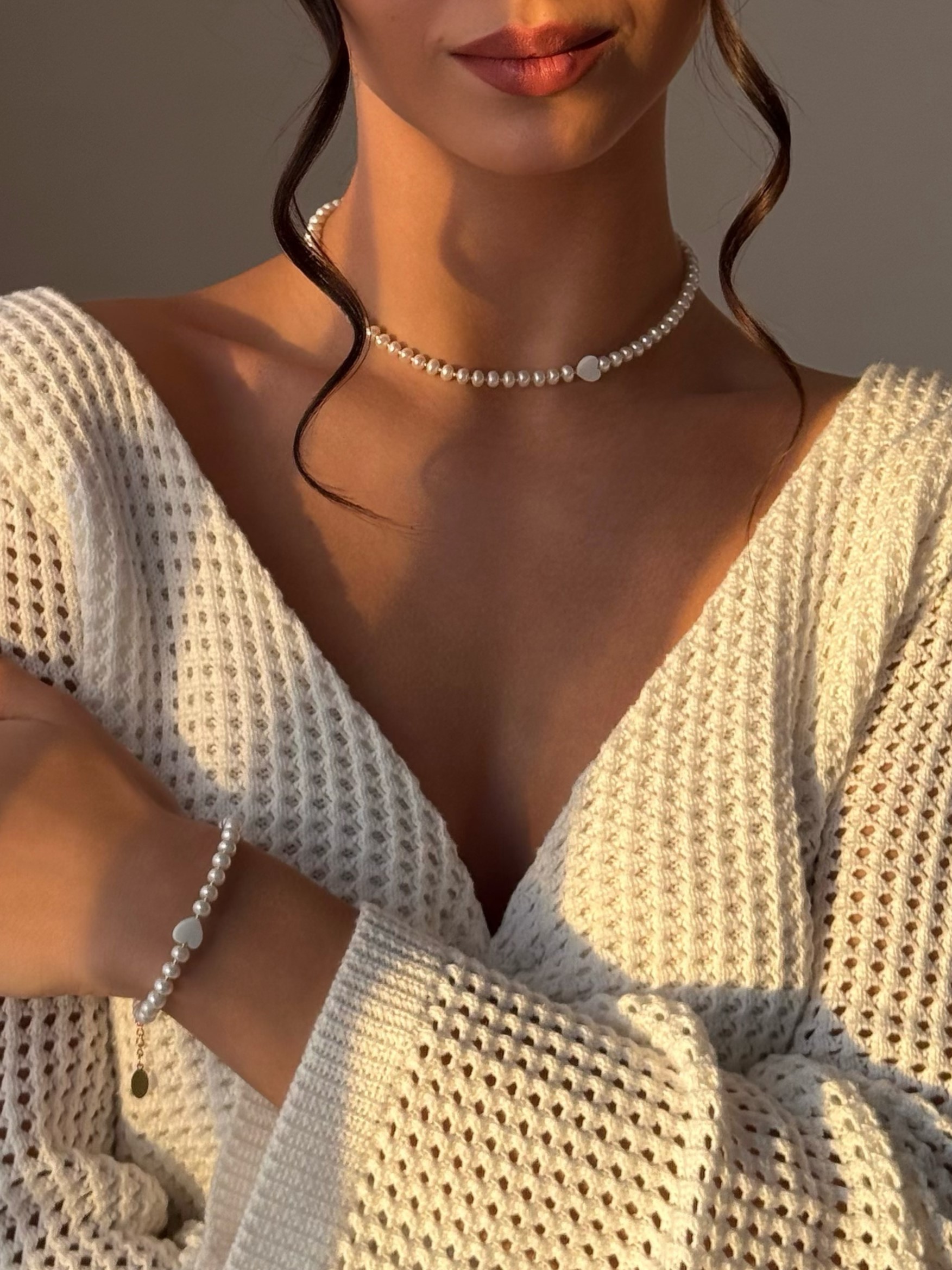 Вишуканий браслет з натуральних перлин з додаванням серця. Матеріал серця - натуральний перламутр. Матеріал фурнітури ювелірна нержавіюча сталь з позолотою (у золотому кольорі). Бісер з гальванічним покриттям.