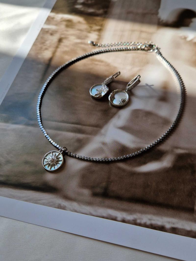 Комплект з гематиту та популярних сережок. Кулон з натуральним перламутром, основа латунь з покриттям родій. Матеріал застібки - ювелірна сталь (у срібному кольорі). Сережки з натуральним перламутром, основа латунь з покриттям родій, інкрустована фіанітами.