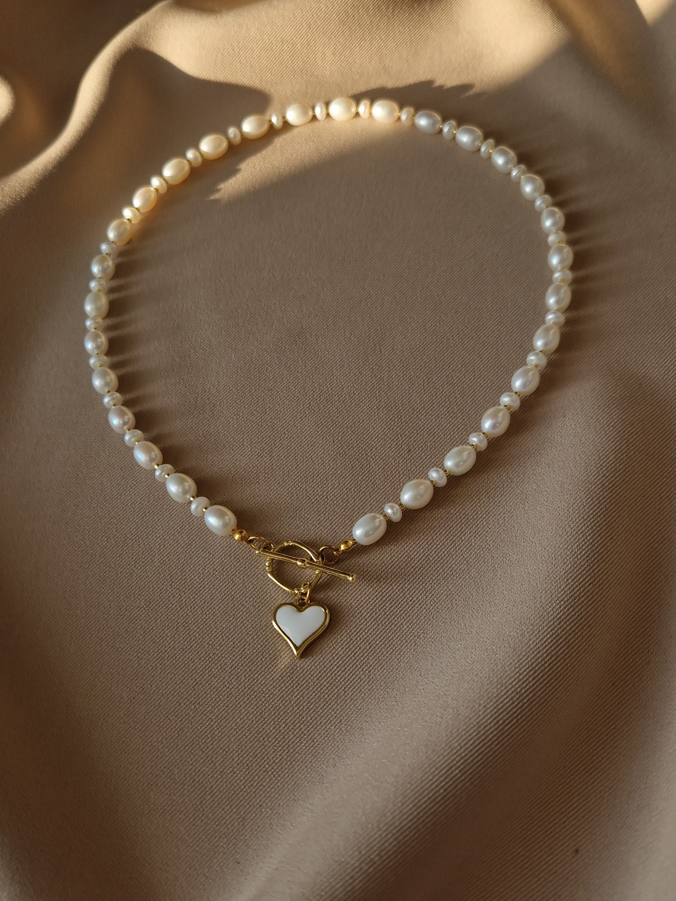Мінімалістичне кольє з натуральних перлин з кулоном біле серце