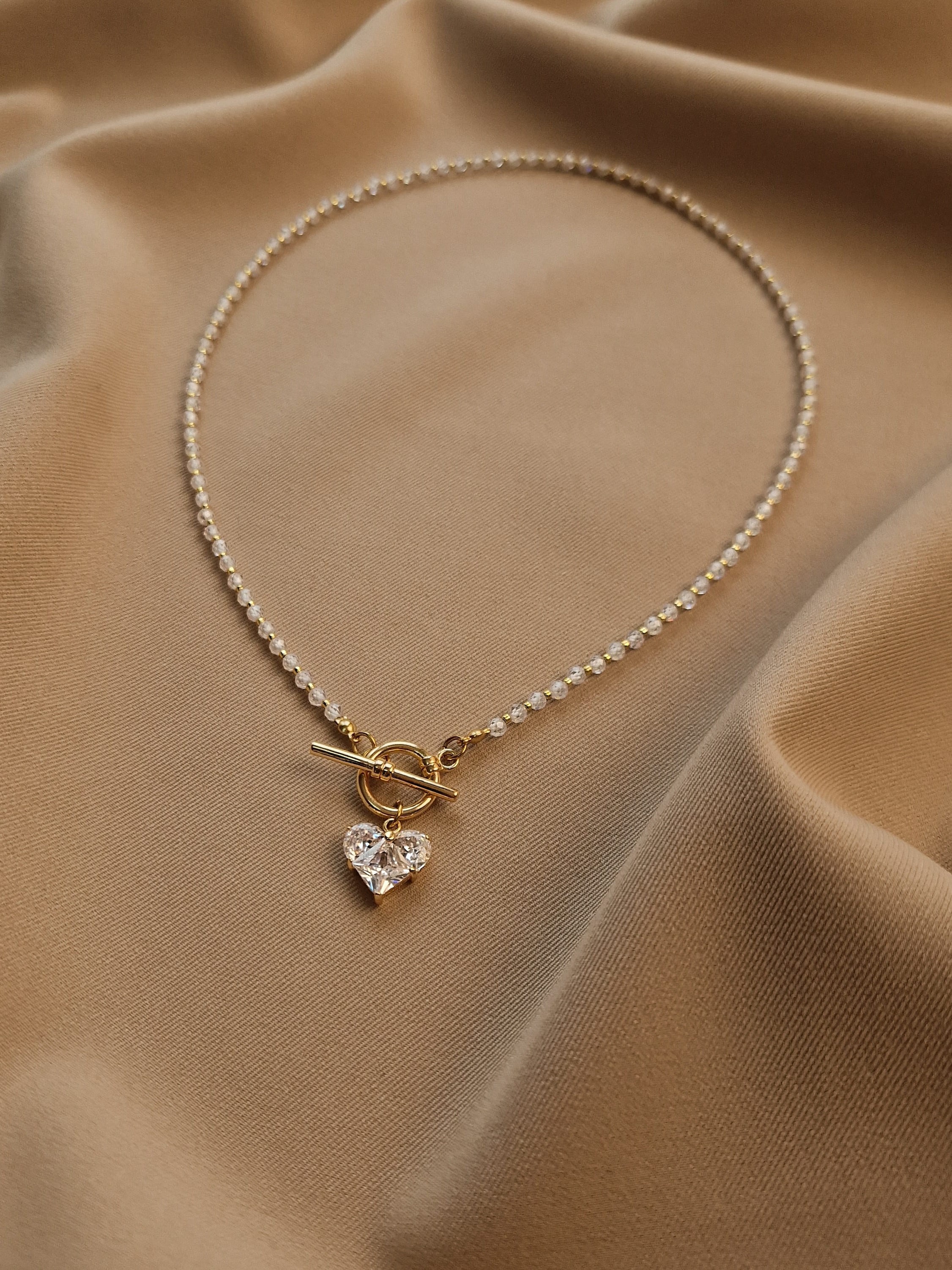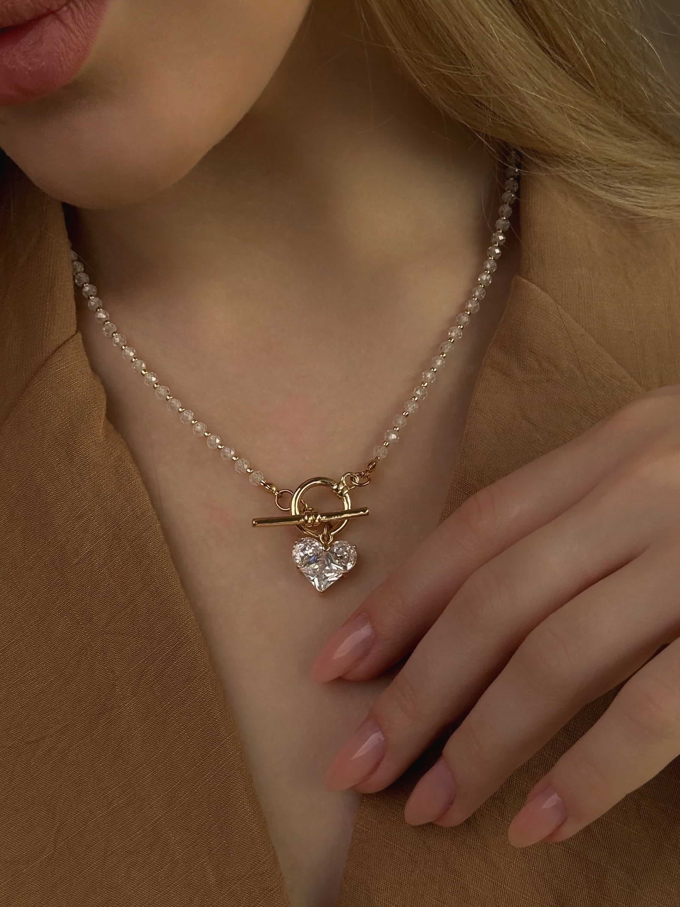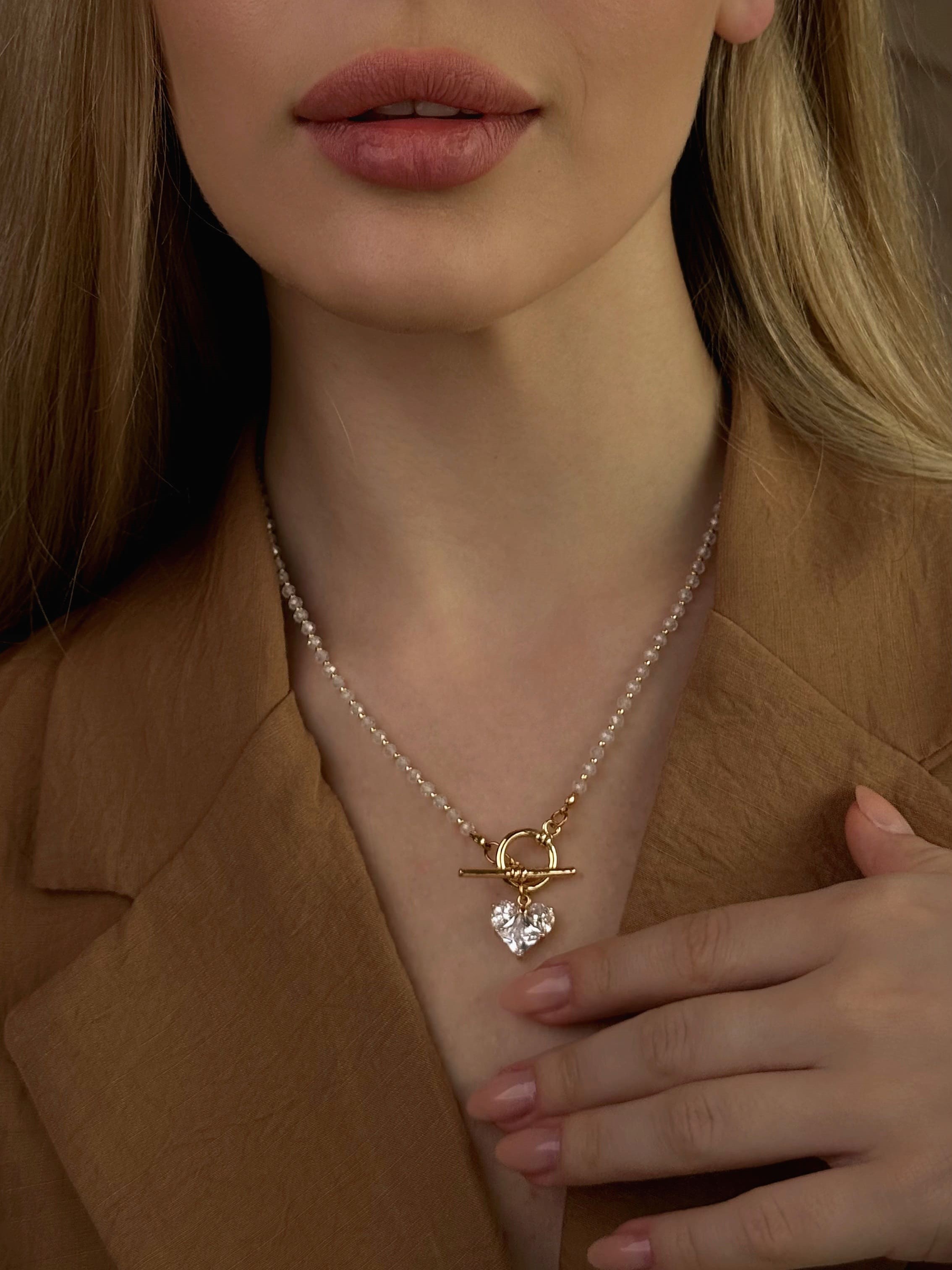 Кольє з фіанітів та японського бісеру з кулоном серце. Матеріал ланцюжка та фурнітури латунь з покриттям позолоти 18 карат (у золотому кольорі). Стандартна довжина 45 см. Замір шиї моделі - 32 см впритул.