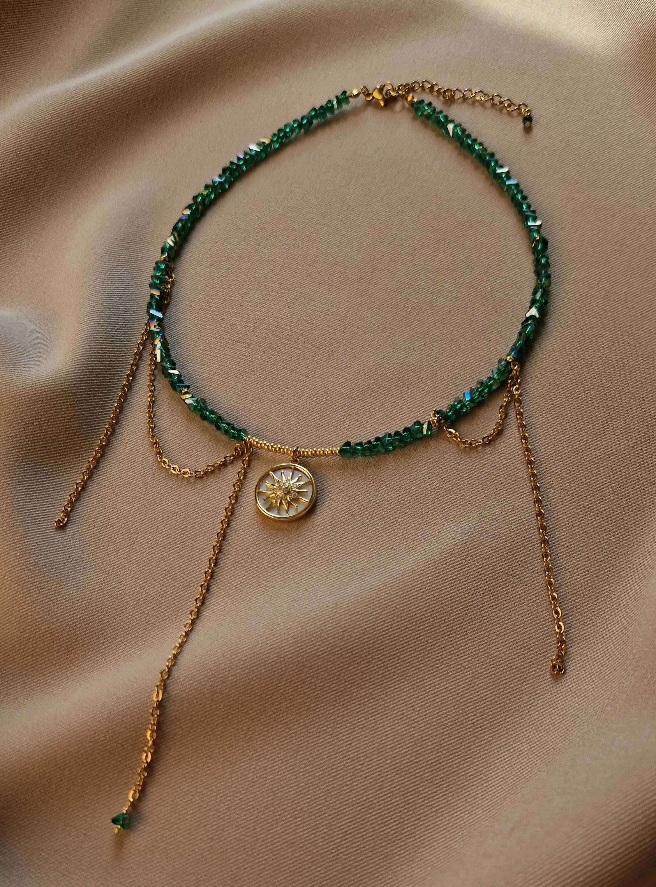Кольє з відбірного кришталю зеленого кольору, з додаванням ланцюжків та перламутрового кулону. Матеріал фурнітури: ювелірна сталь з позолотою (у золотому кольорі) Стандартна довжина 36 см та 6 см подовжувач.