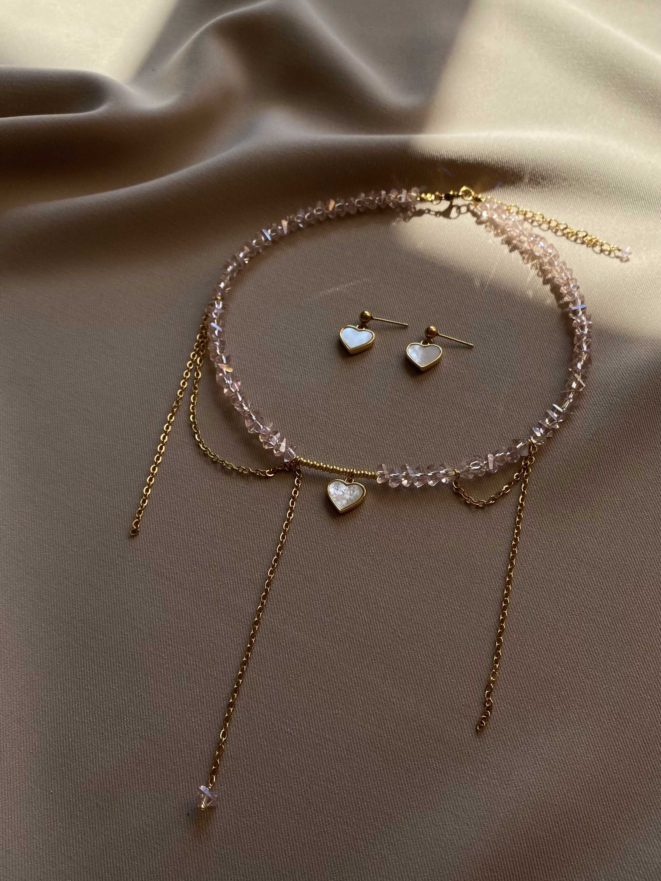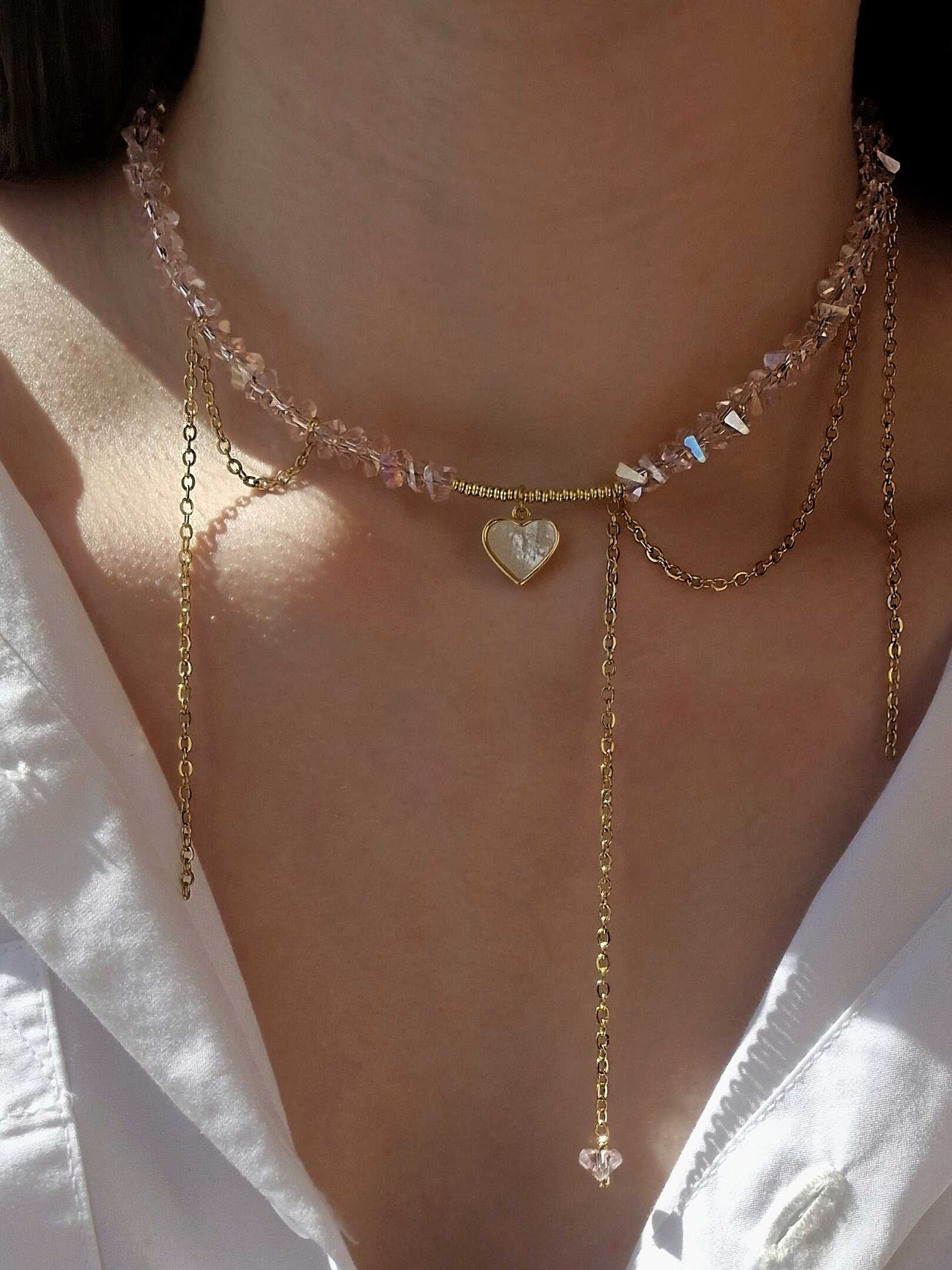 Кольє з рожевого кришталю та ланцюжків з перламутровим серцем