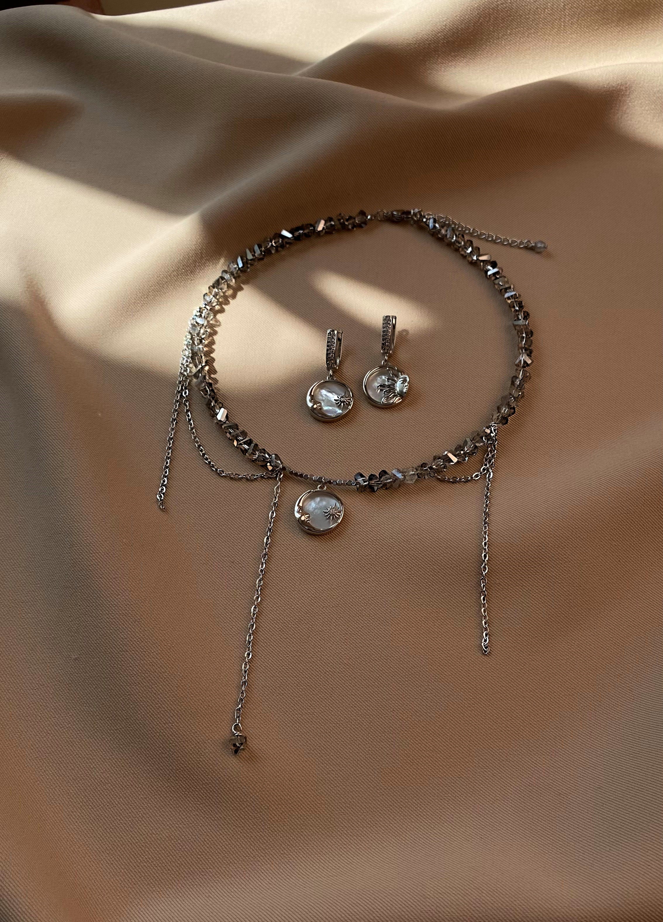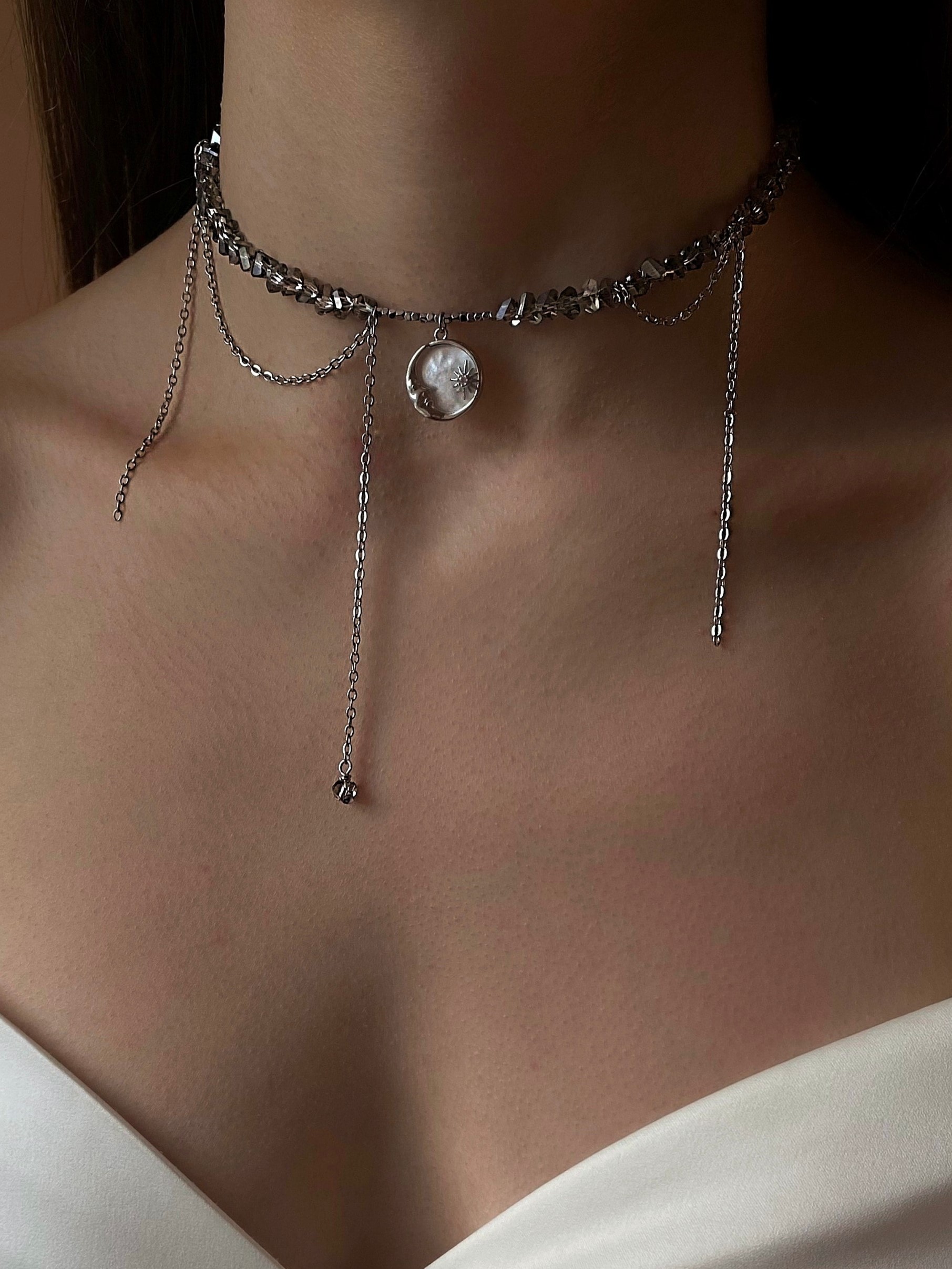 Кольє з відбірного кришталю сірого кольору, з додаванням ланцюжків та сонця. Матеріал фурнітури: ювелірна сталь (у срібному кольорі). Замір шиї моделі 29 см впритул. Стандартна довжина 36 см та 6 см подовжувач.