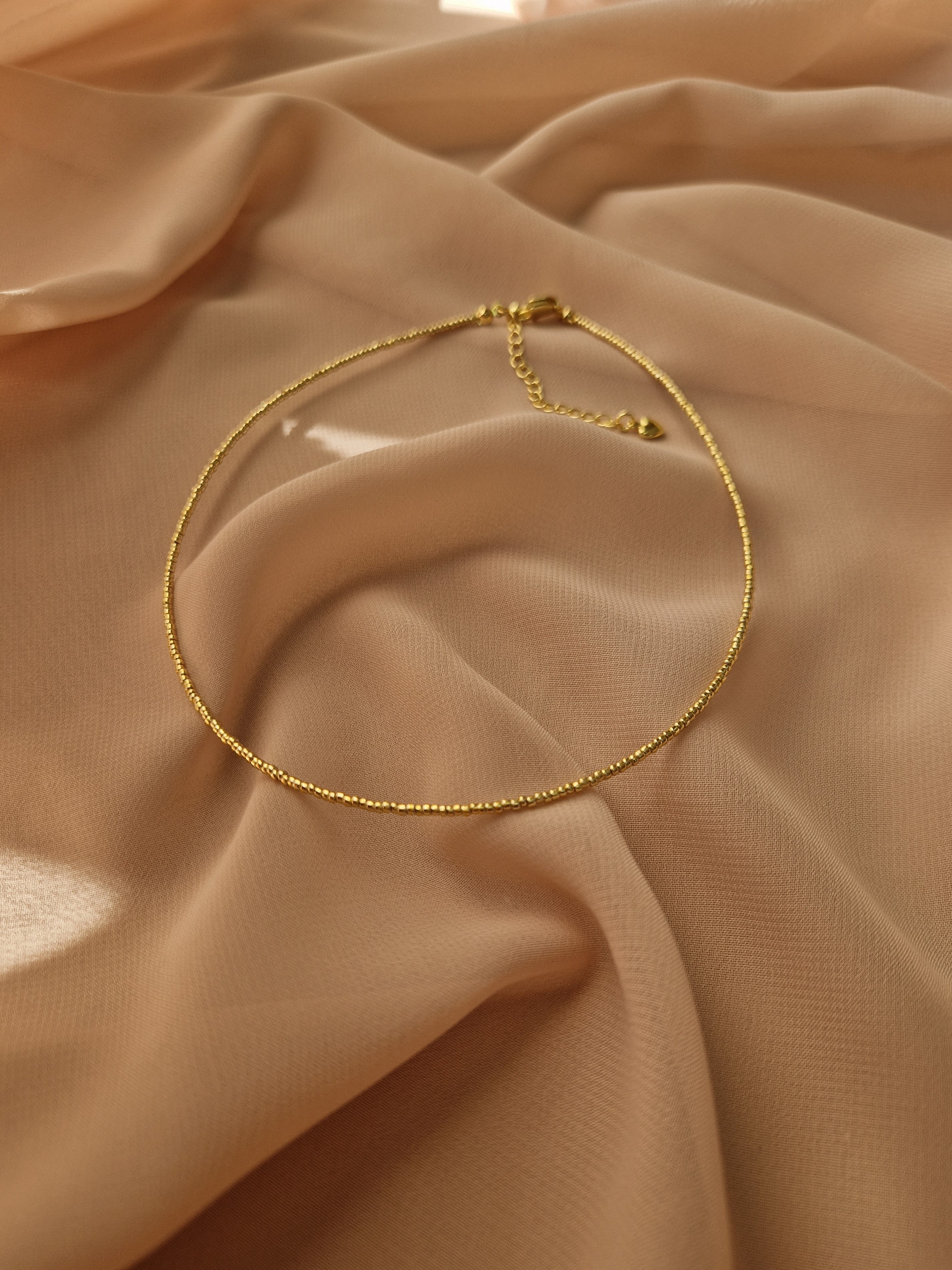 Чокер з японського ювелірного бісеру з гальванічним покриттям. Матеріал фурнітури нержавіюча ювелірна сталь. Стандартна довжина навколо шиї 36 см та 6 см подовжувач (у золотому кольорі). Замір шиї моделі - 32 см впритул.