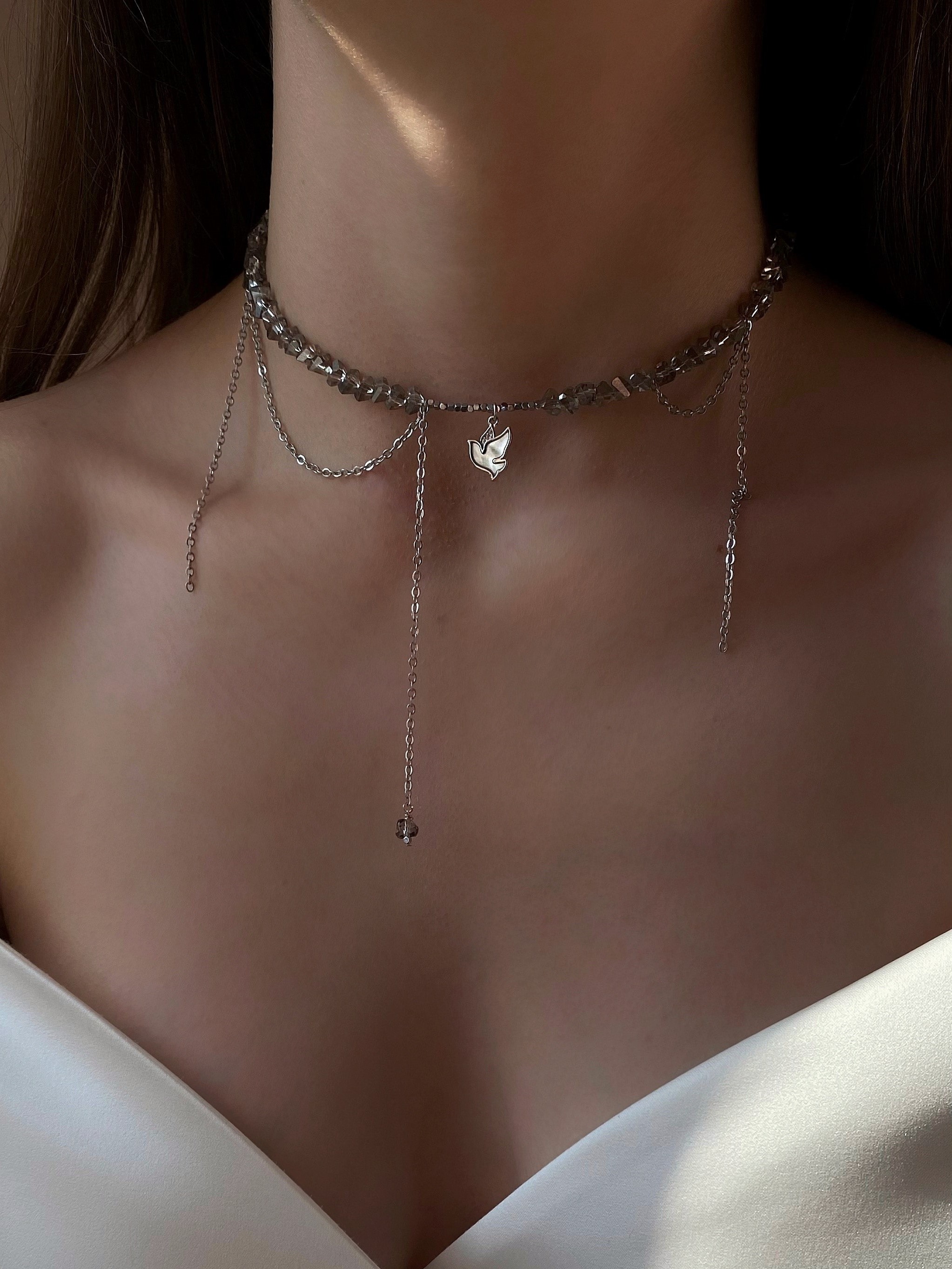 - Комбіноване кольє з відбірного кришталю з ланцюжками та пташкою