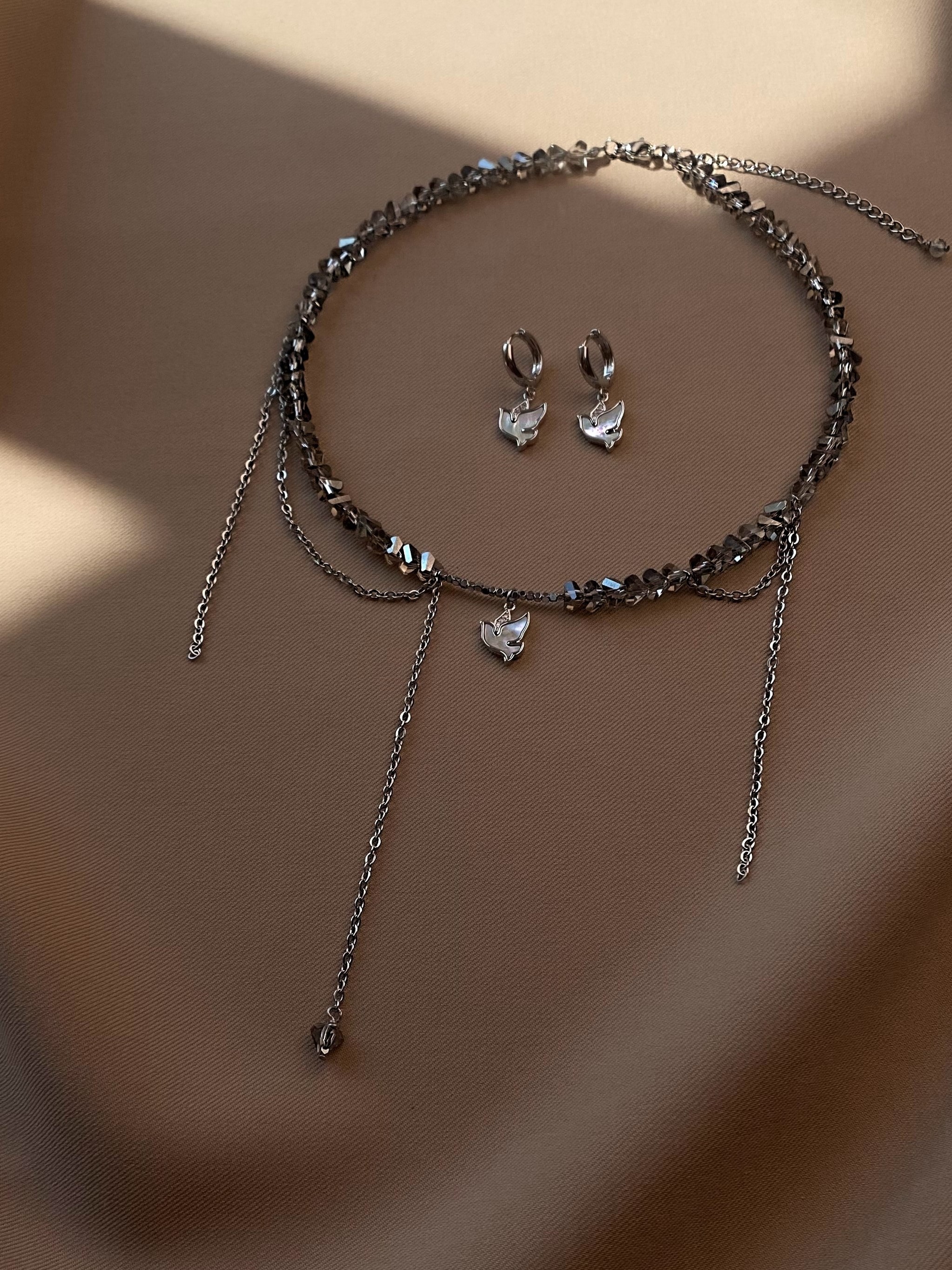 Кольє з відбірного кришталю сірого кольору, з додаванням ланцюжків та перламутрового кулону. Матеріал фурнітури: ювелірна сталь (у срібному кольорі) Стандартна довжина 36 см та 6 см подовжувач.