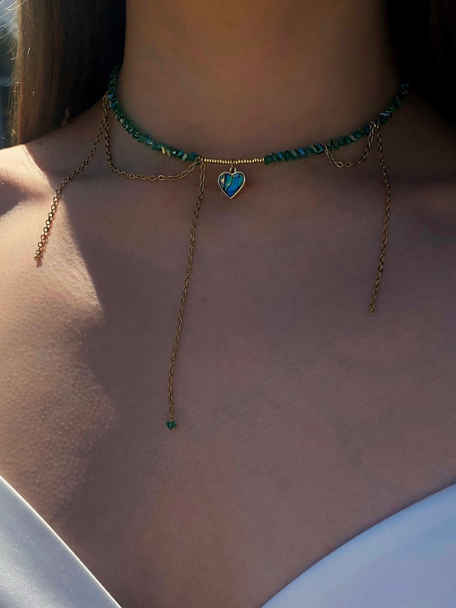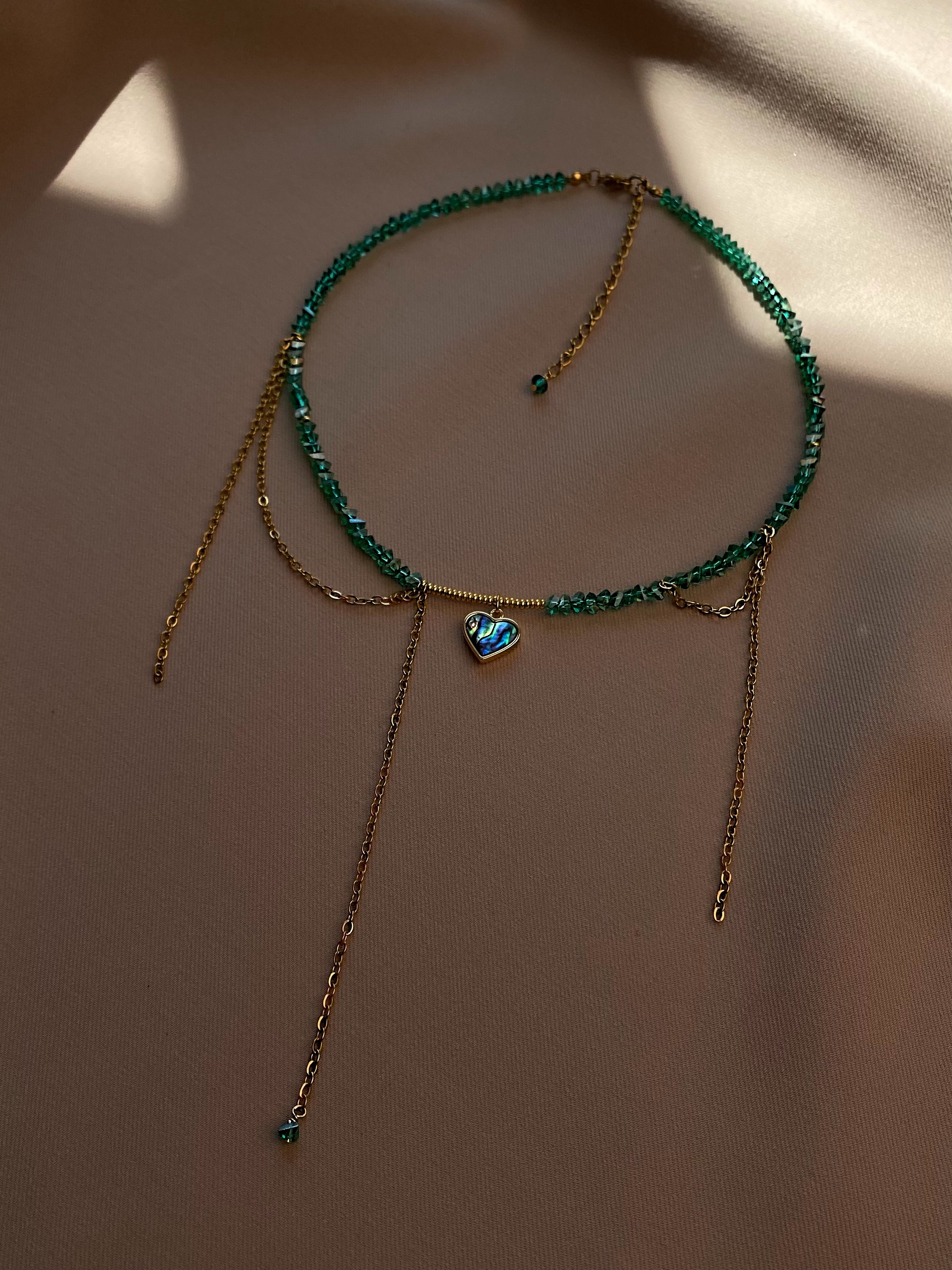 Кольє з відбірного кришталю зеленого кольору, з додаванням ланцюжків та перламутрового кулону. Матеріал фурнітури: ювелірна сталь з позолотою (у золотому кольорі) Стандартна довжина 36 см та 6 см подовжувач.