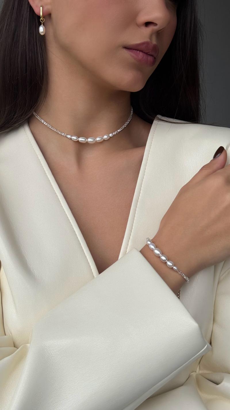 Чокер з прозорого кришталю з додаванням натуральних перлин. Матеріал фурнітури ювелірна нержавіюча сталь (у золотому кольору).