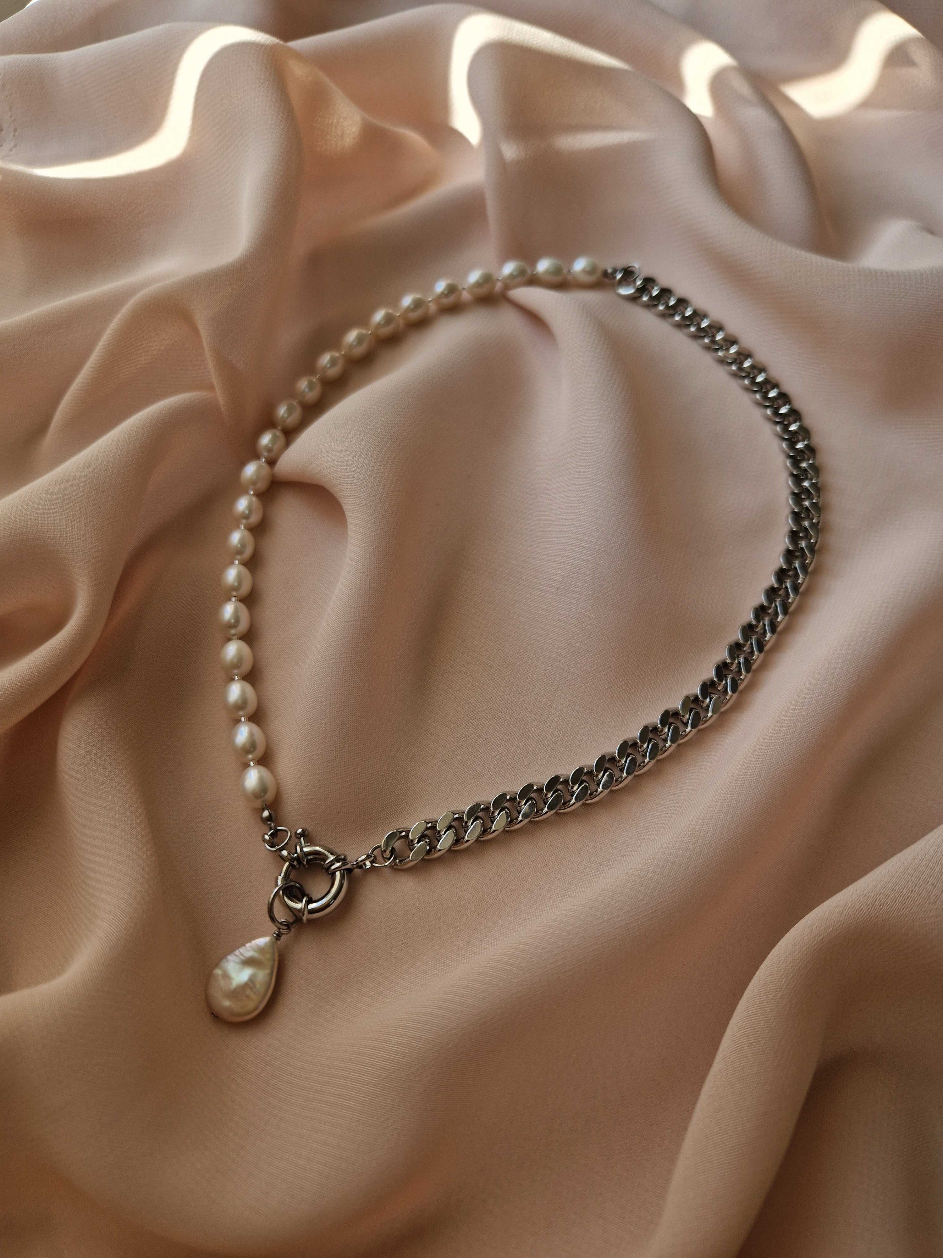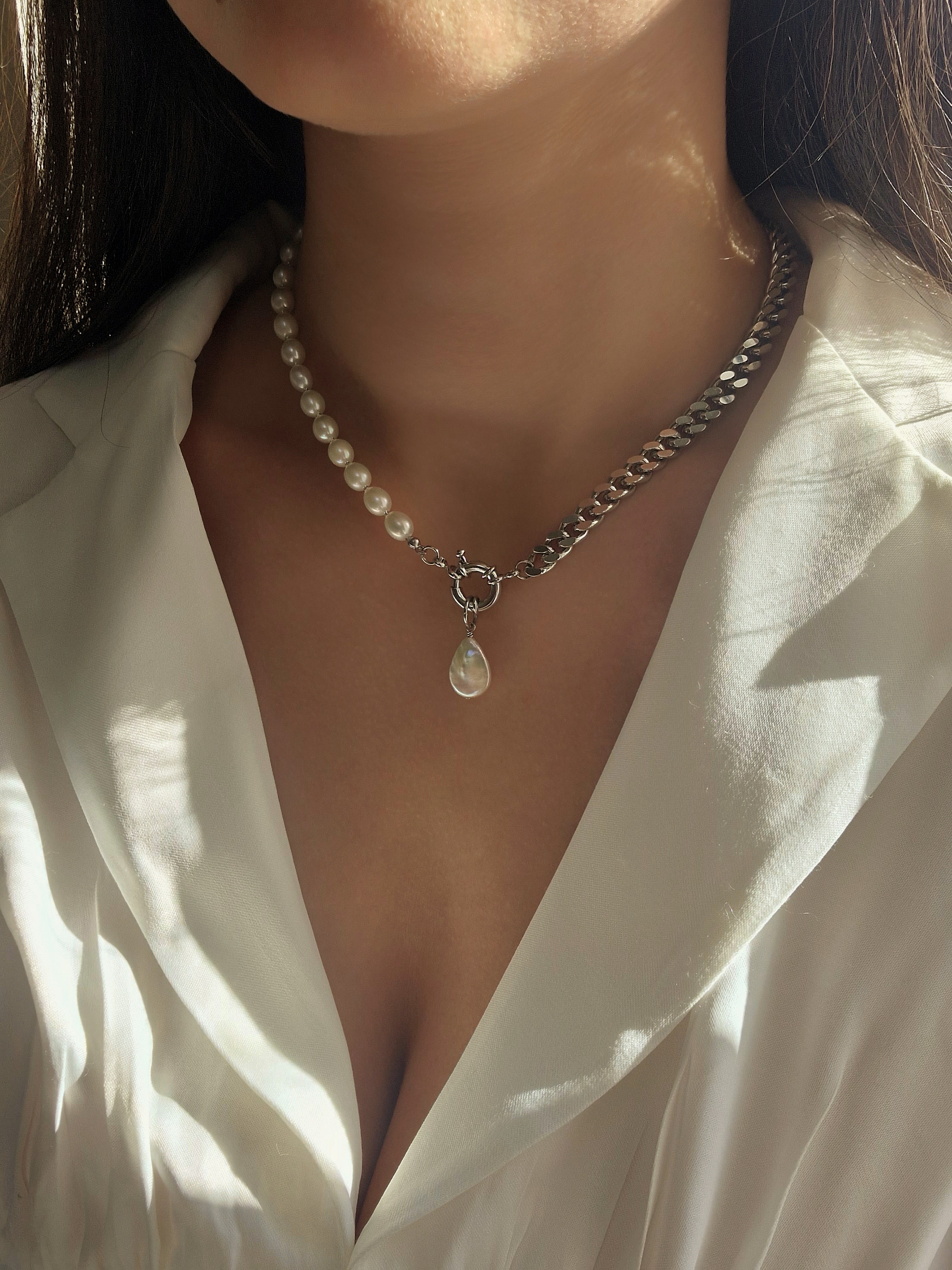 Чарівне кольє з натуральних перлин та панцирного ланцюжка. Матеріал фурнітури латунь із покриттям родій (у срібному кольорі). Стандартна довжина кольє 43 см. Замір шиї моделі - 32 см впритул.