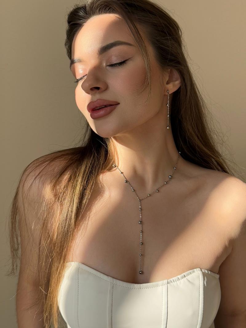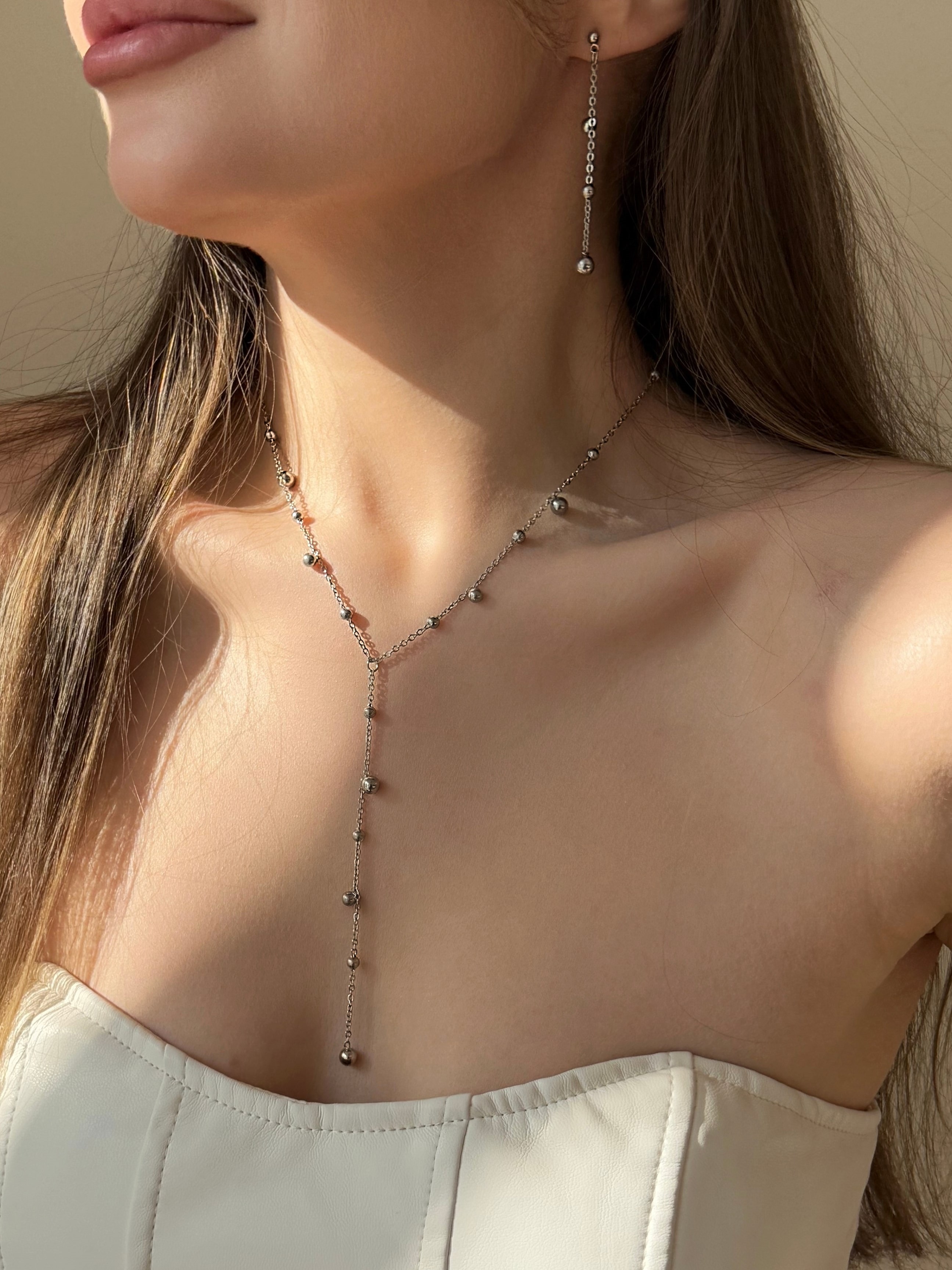 Стильна краватка з ланцюжка з кульками різного розміру. Матеріал нержавіюча ювелірна сталь. Стандартна довжина навколо шиї 40 см + 6 см подовжувач. Звисаюча частина 12 см.