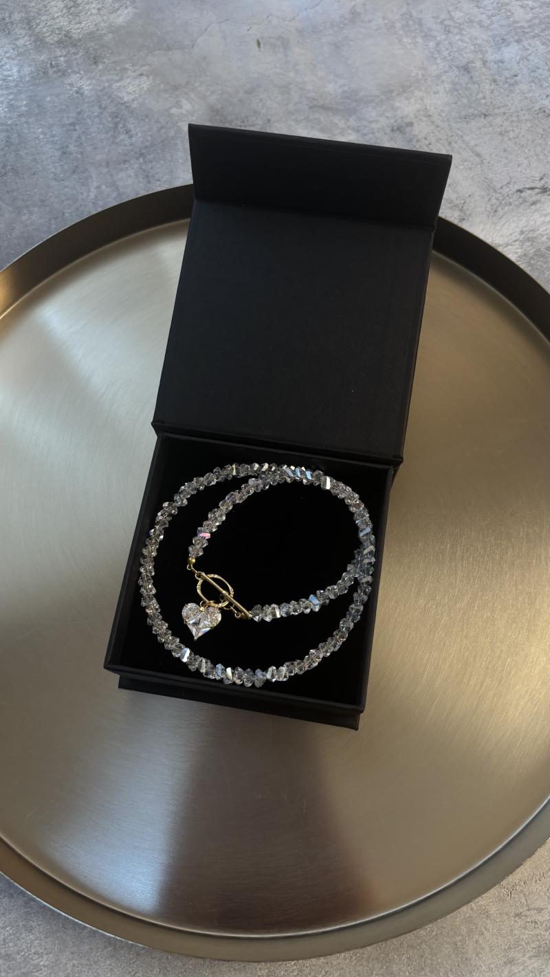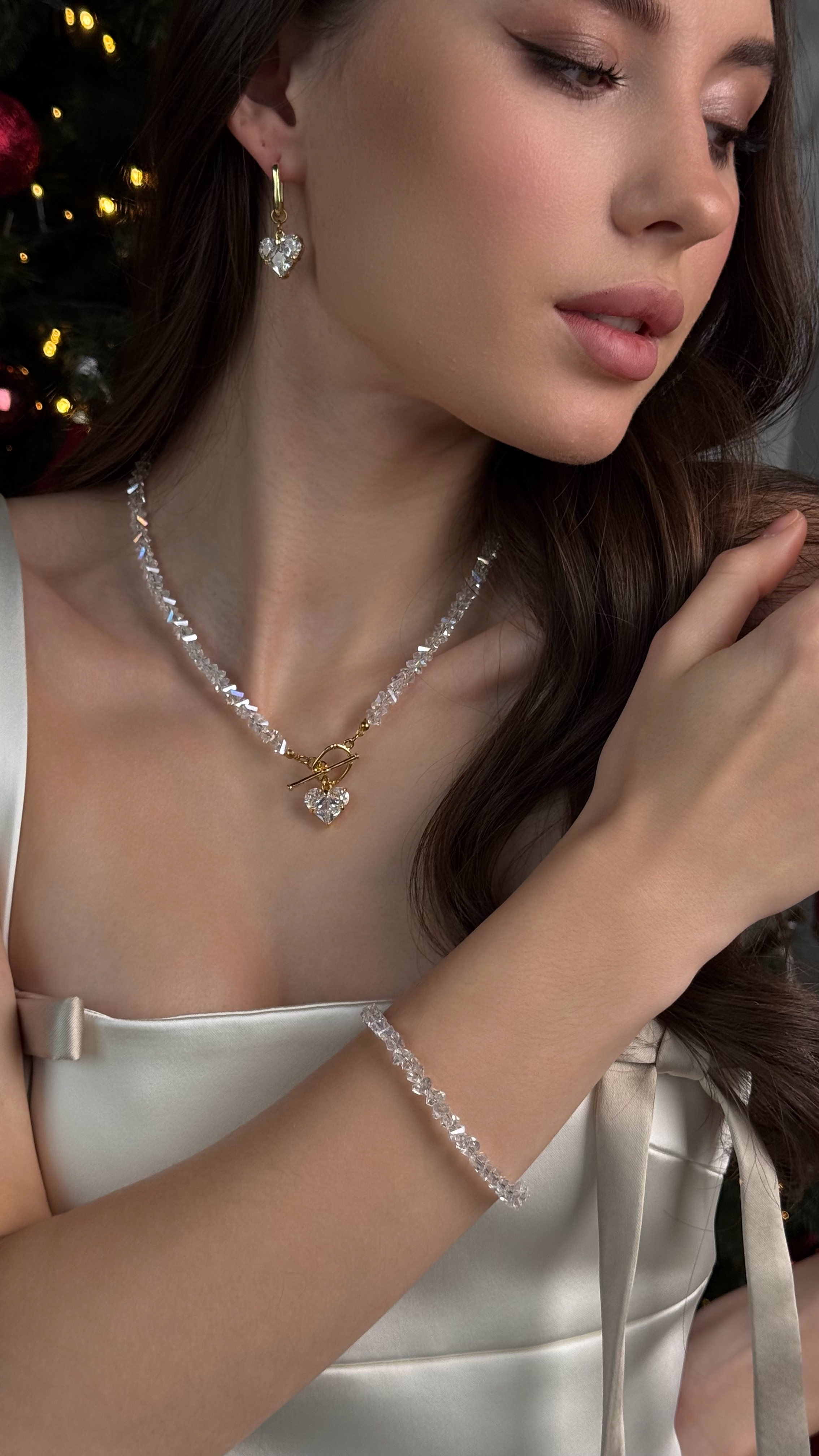 Кольє з відбірного кришталю з серцем. Матеріал фурнітури: латунь з покриттям позолоти (у золотому кольорі). Стандартна довжина 43 см. Замір шиї моделі впритул 29 см.