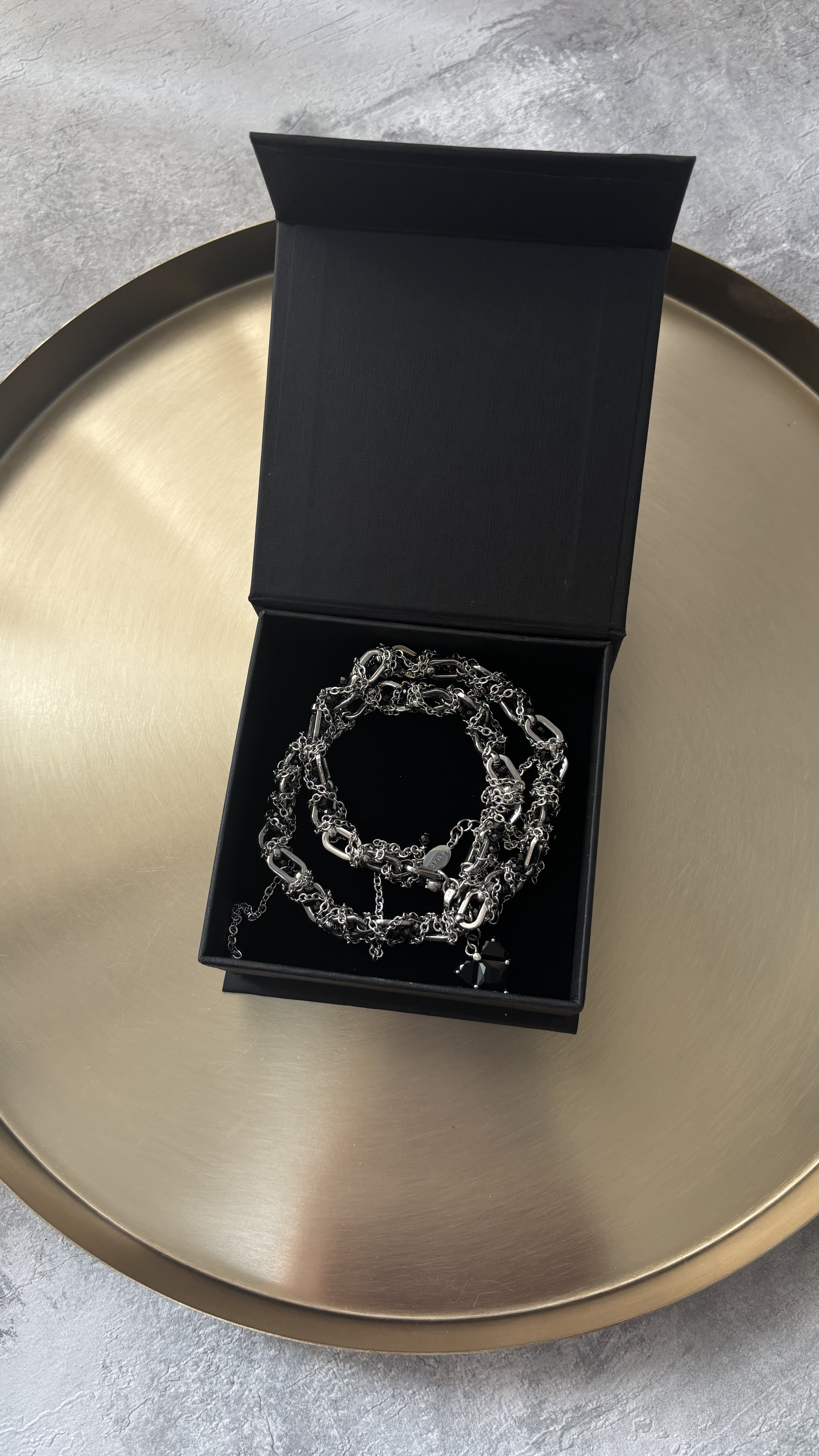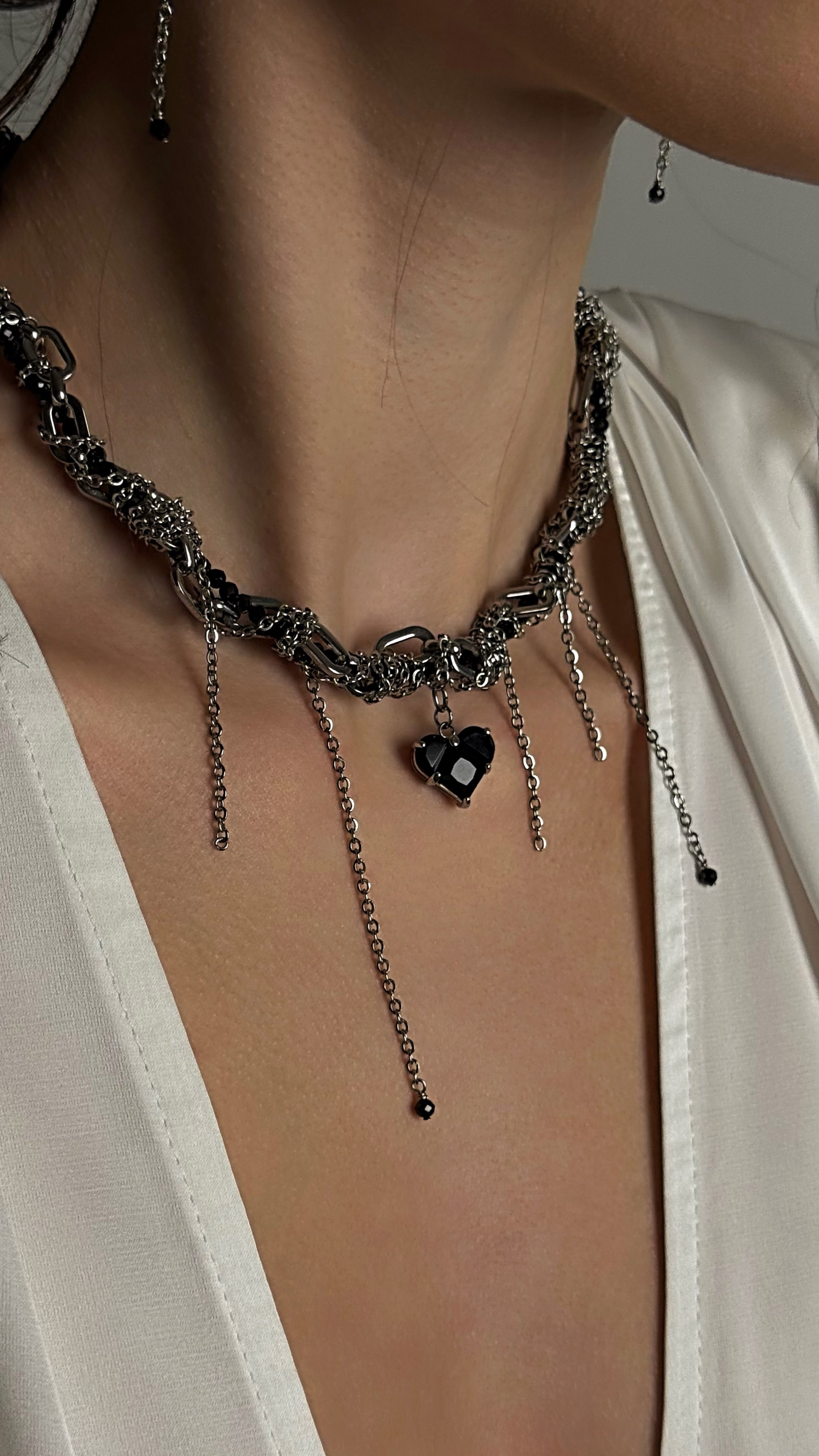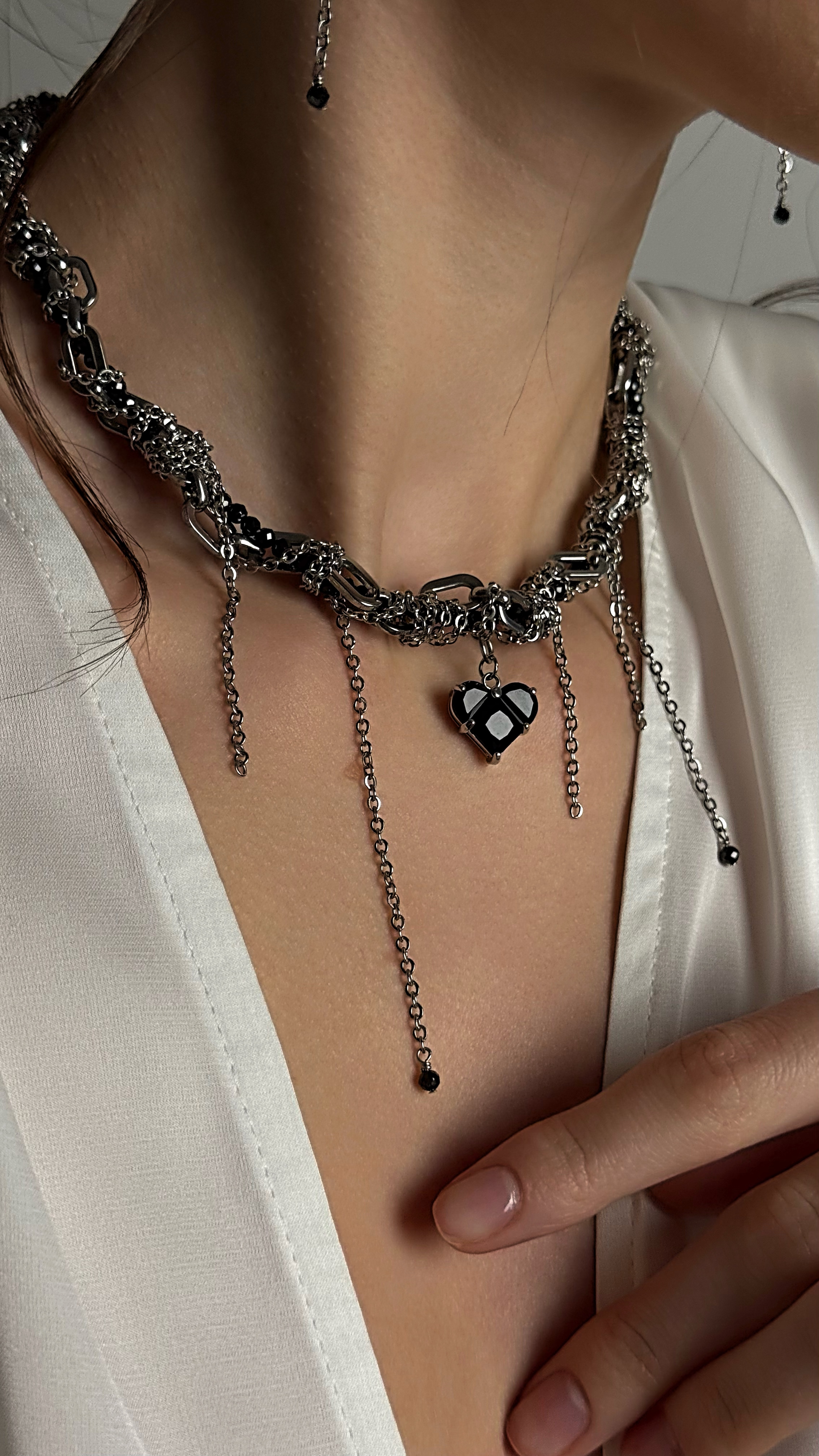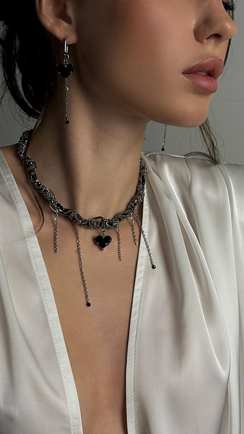 - Кольє з чорних фіанітів та різних ланцюжків з кулоном