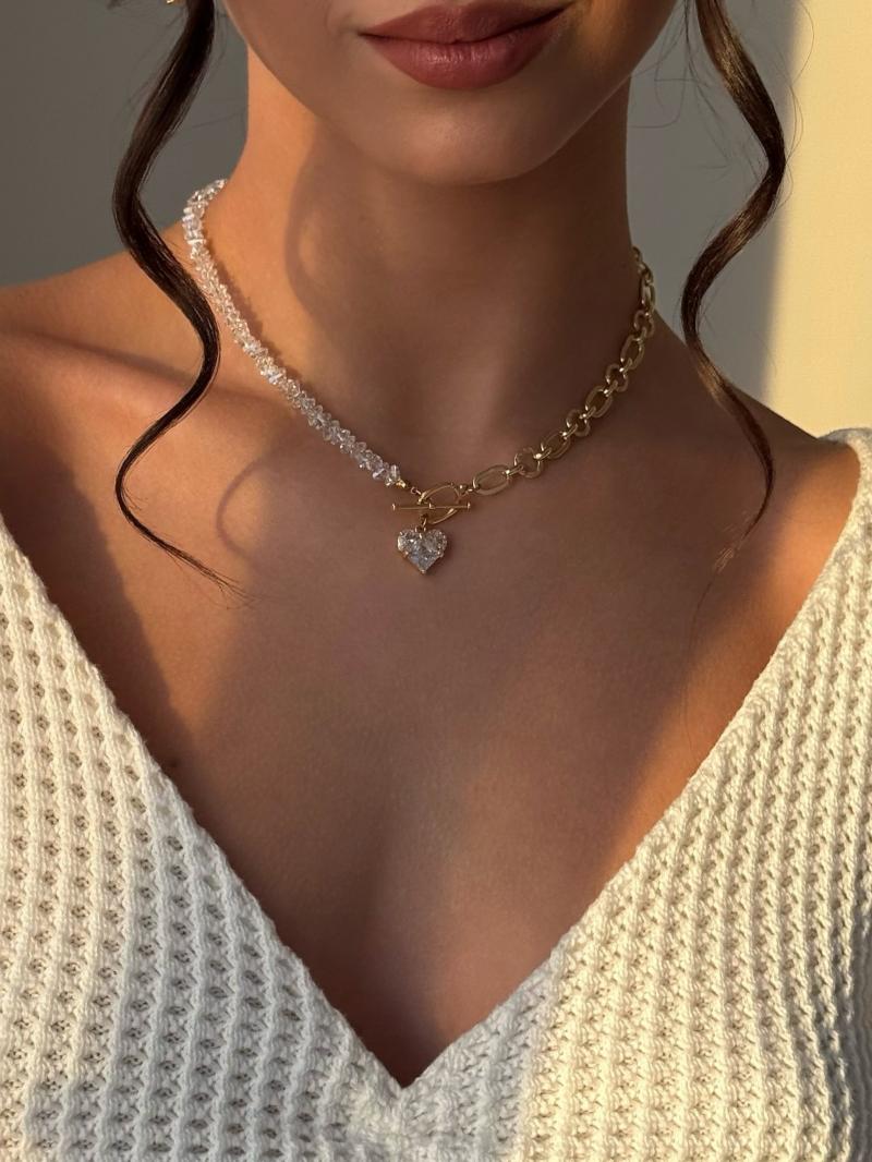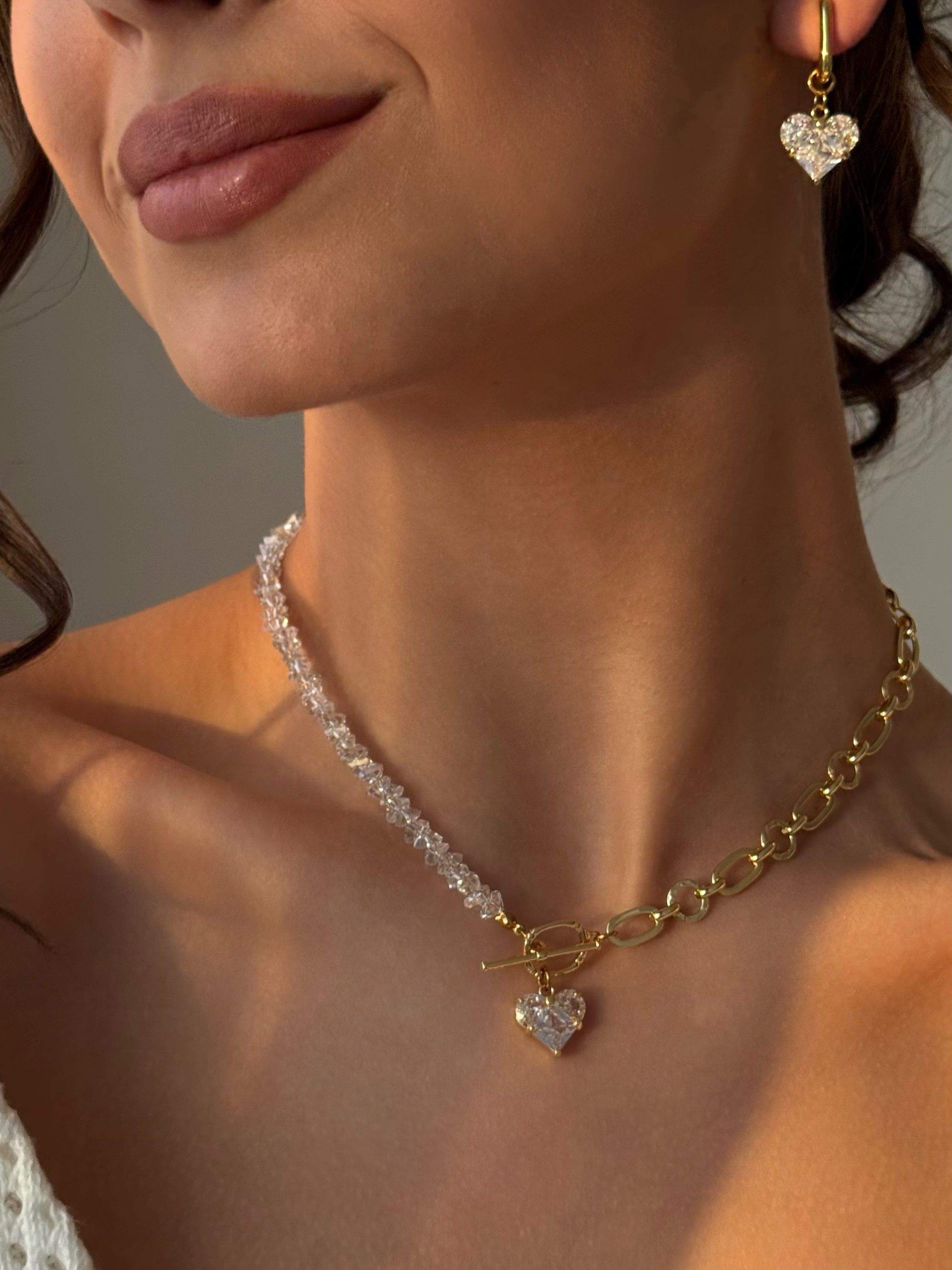 Кольє з прозорого кришталю та красивого ланцюжка. Застібка акцентна з кулоном серце. Матеріал фурнітури латунь з покриття позолоти 18 карат (у золотому кольорі). Стандартна довжина 43 см. Замір шиї моделі впритул 29 см.