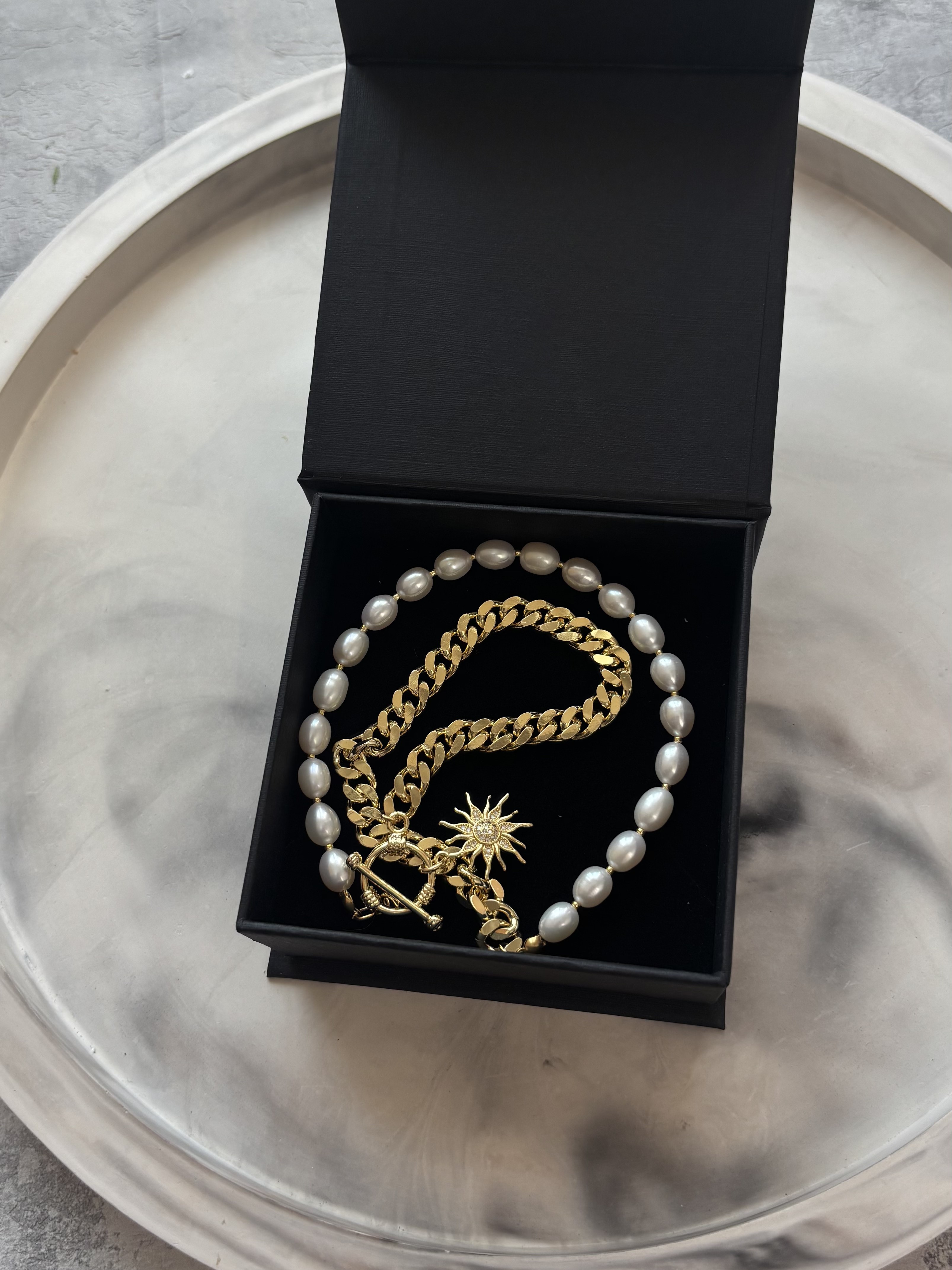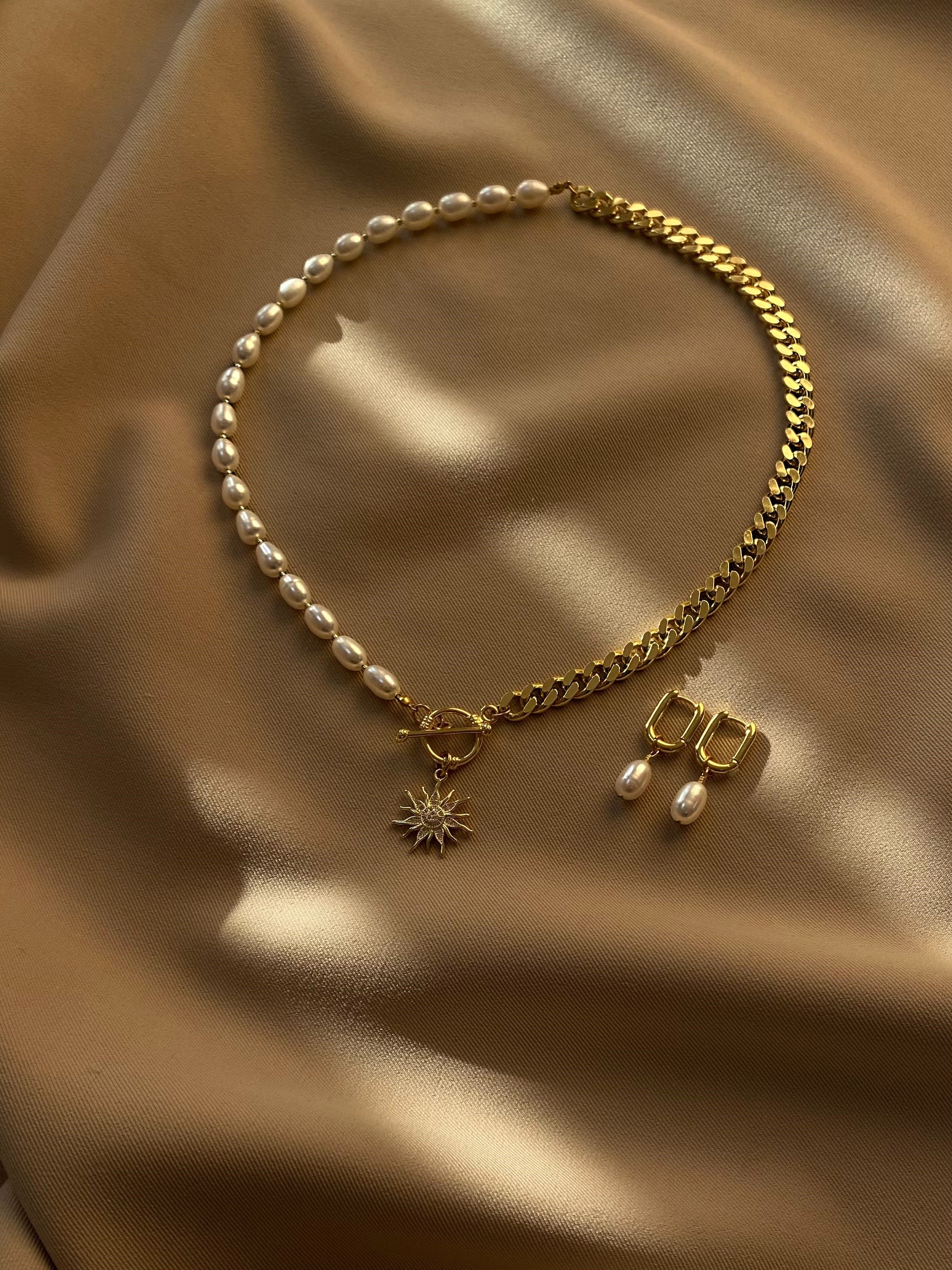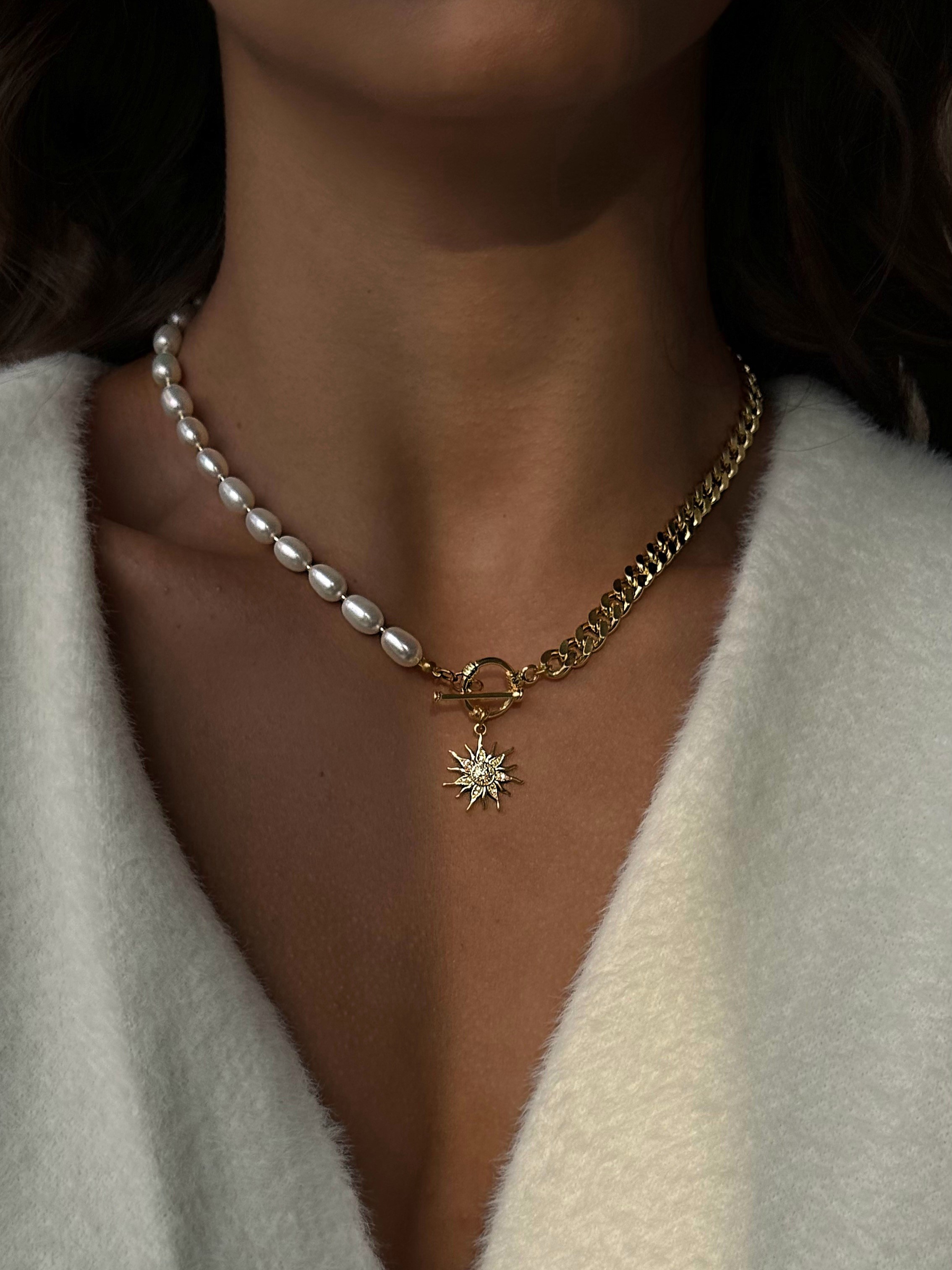 Кольє з натуральних перлин та ланцюжка з акцентною застібкою та кулоном