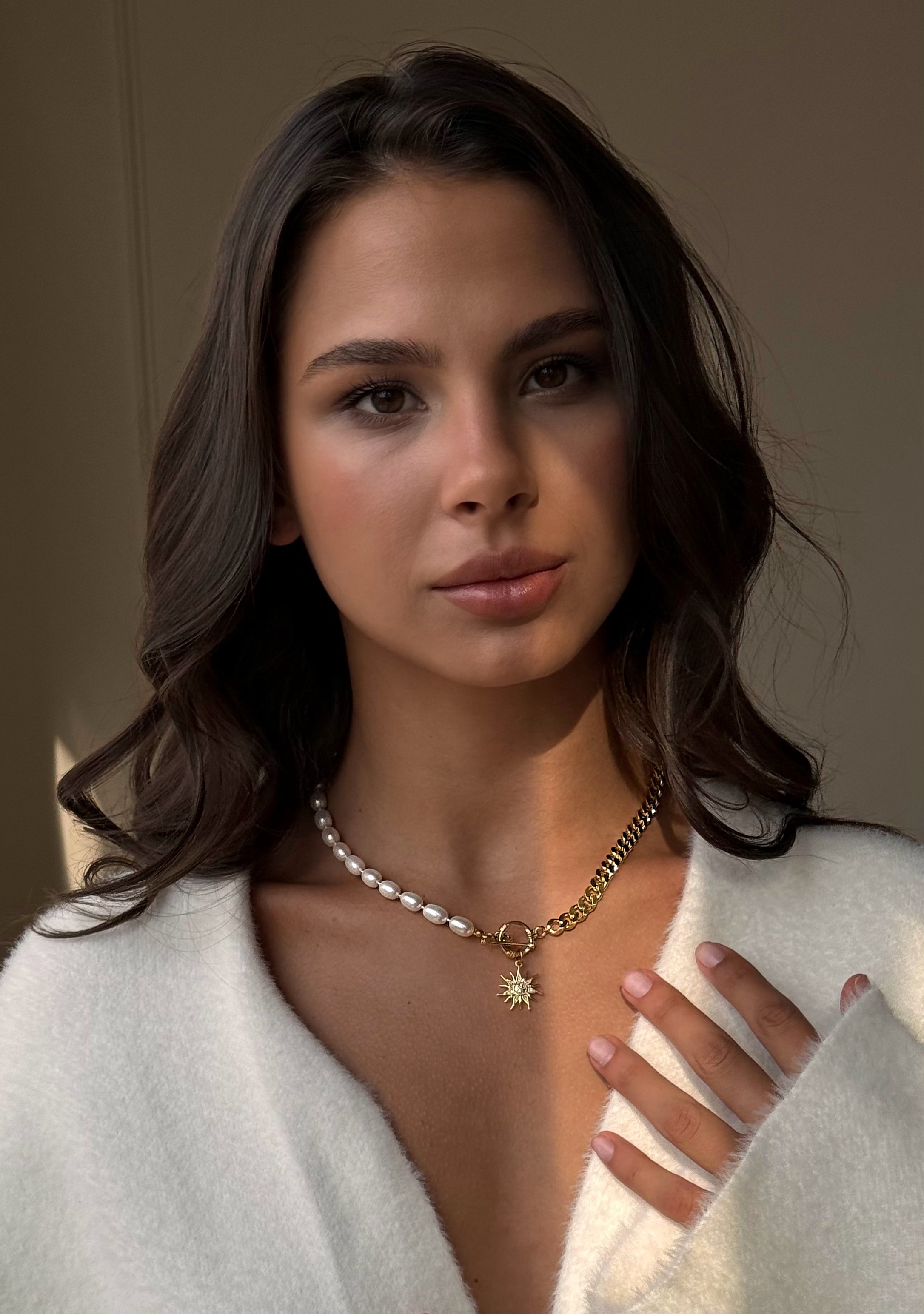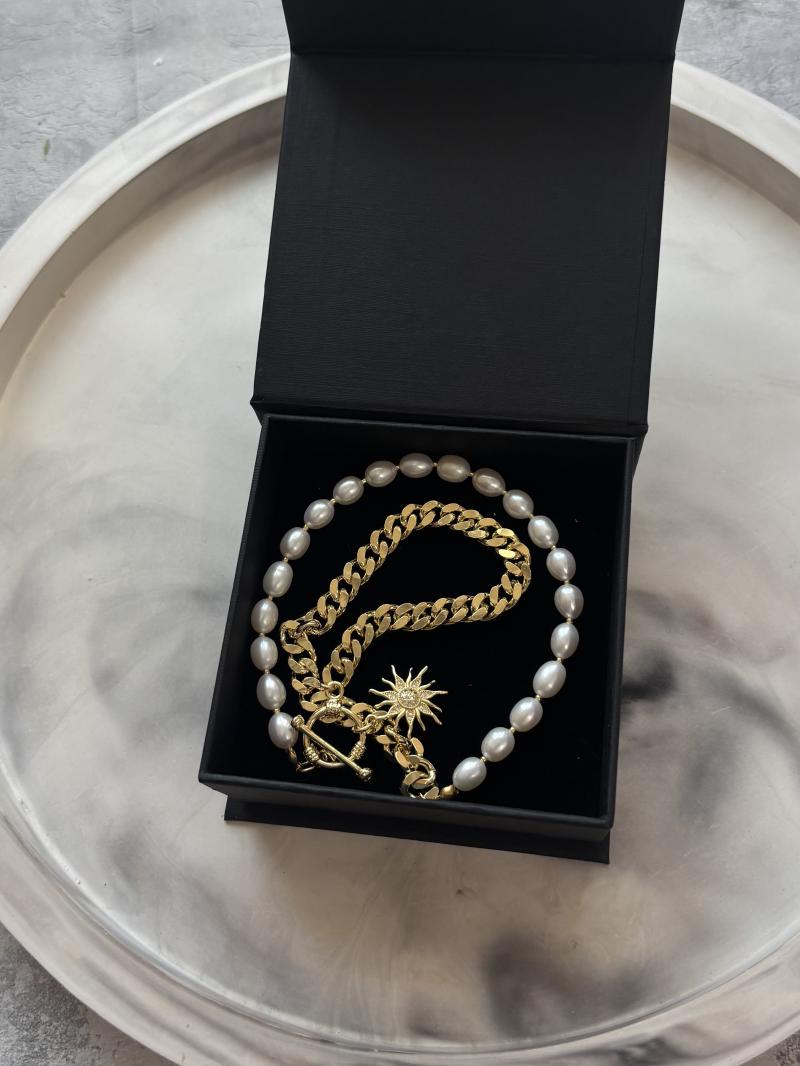 Кольє з натуральних перлин та панцирного ланцюжка. Матеріал ланцюжка та фурнітури латунь з покриття позолота 18 карат (у золотому кольорі). Стандартна довжина кольє 45 см. Замір шиї моделі - 29 см впритул.