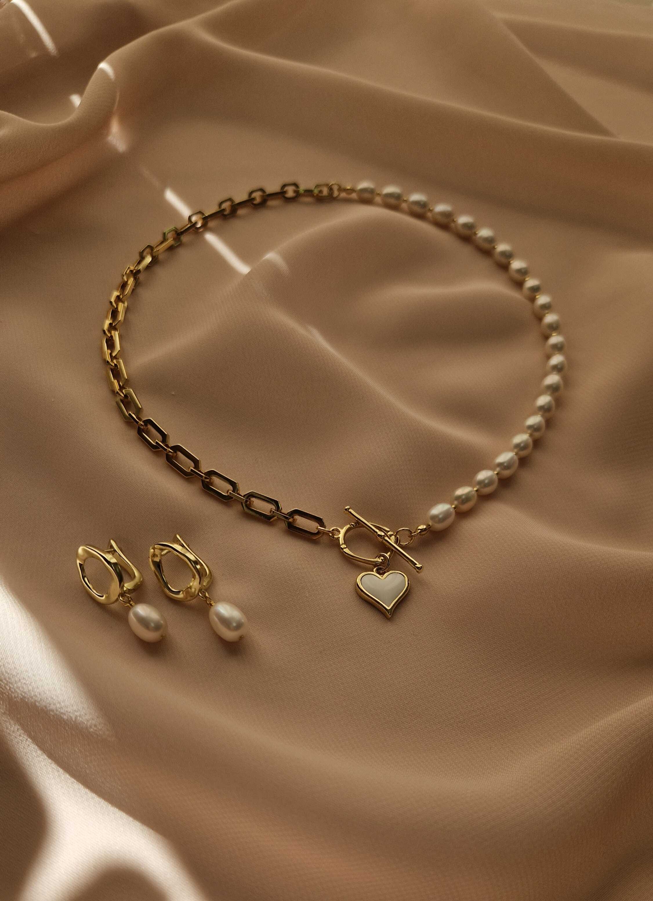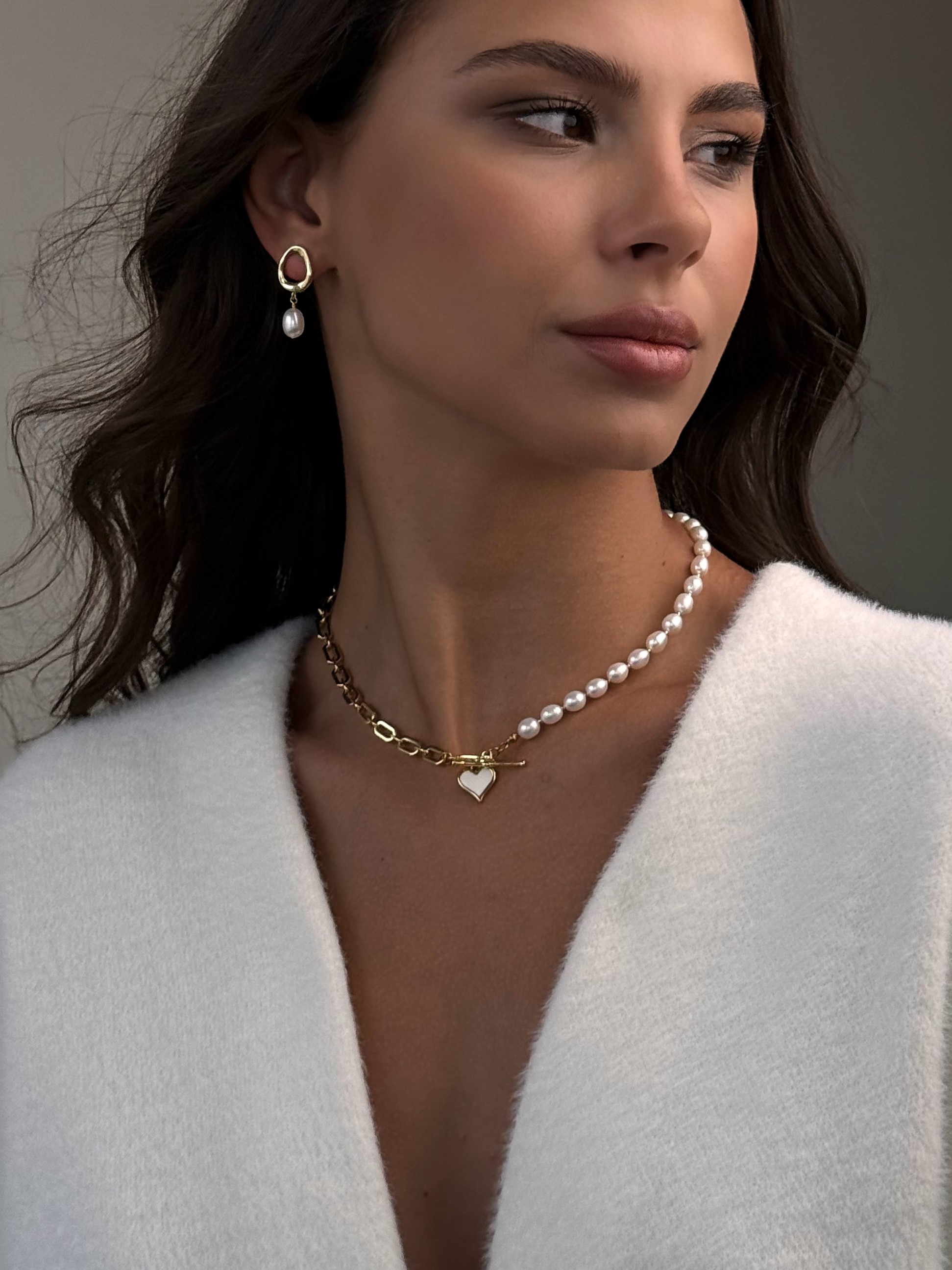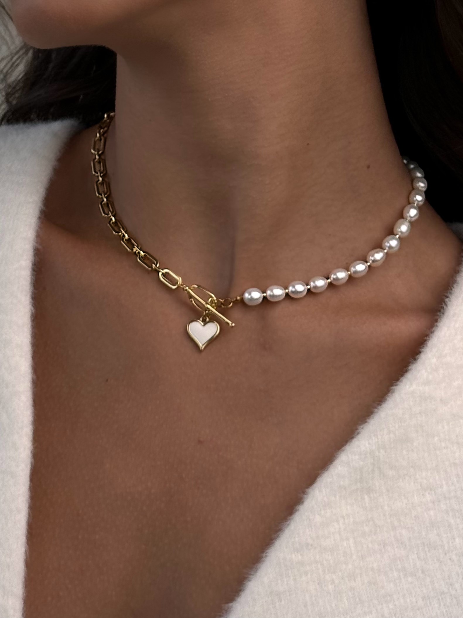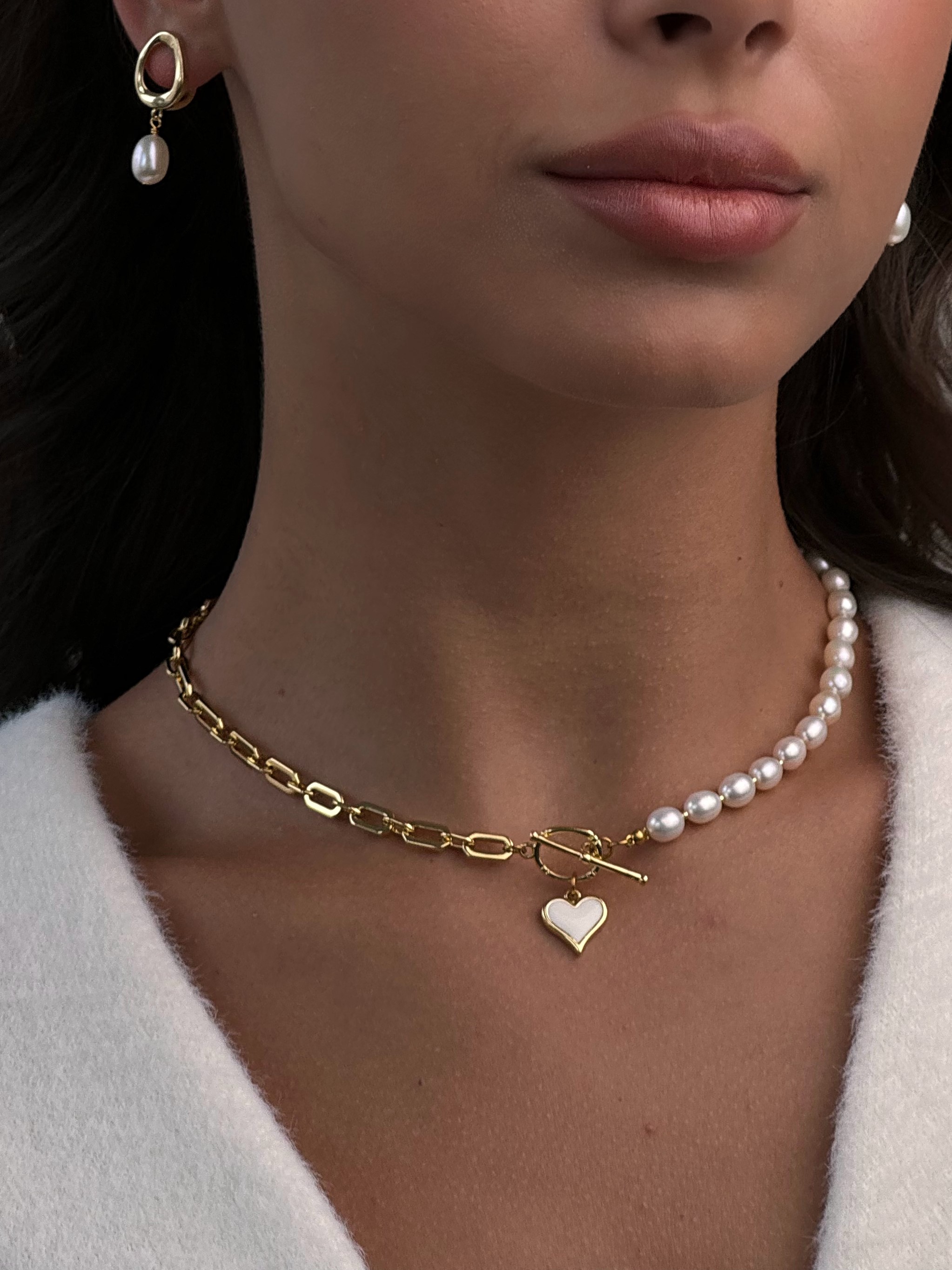 Кольє з натуральних перлин та ланцюжка з білим серцем