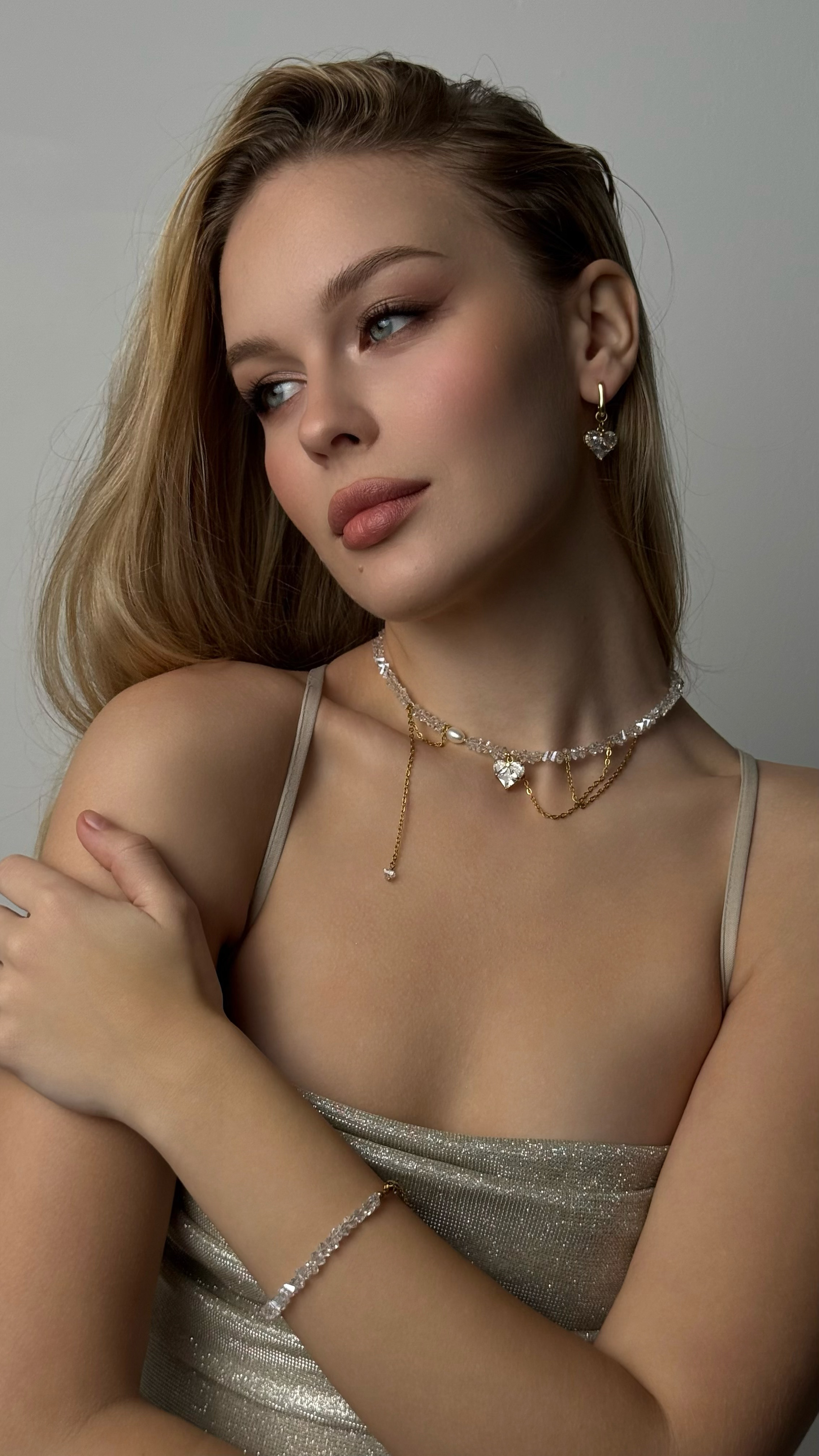 Кольє з прозорого кришталю та ланцюжка з кулоном серце
