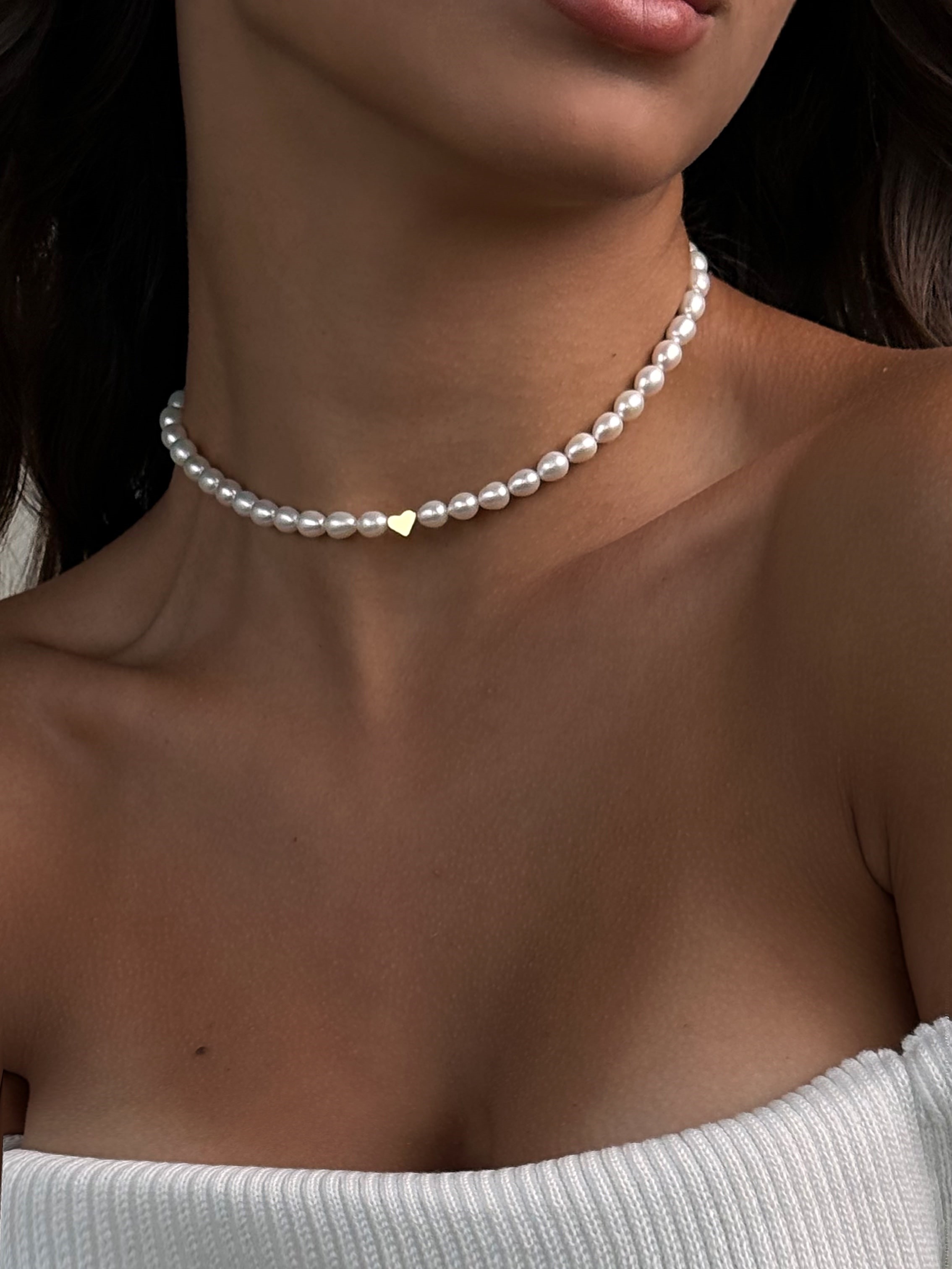 Чокер з натуральних перлин з додаванням позолоченого серця. Матеріал фурнітури латунь з покриттям позолоти 18 карат (у золотому кольорі). Замір шиї моделі 32 см впритул. Стандартна довжина 36 см + 6 см подовжувач.
