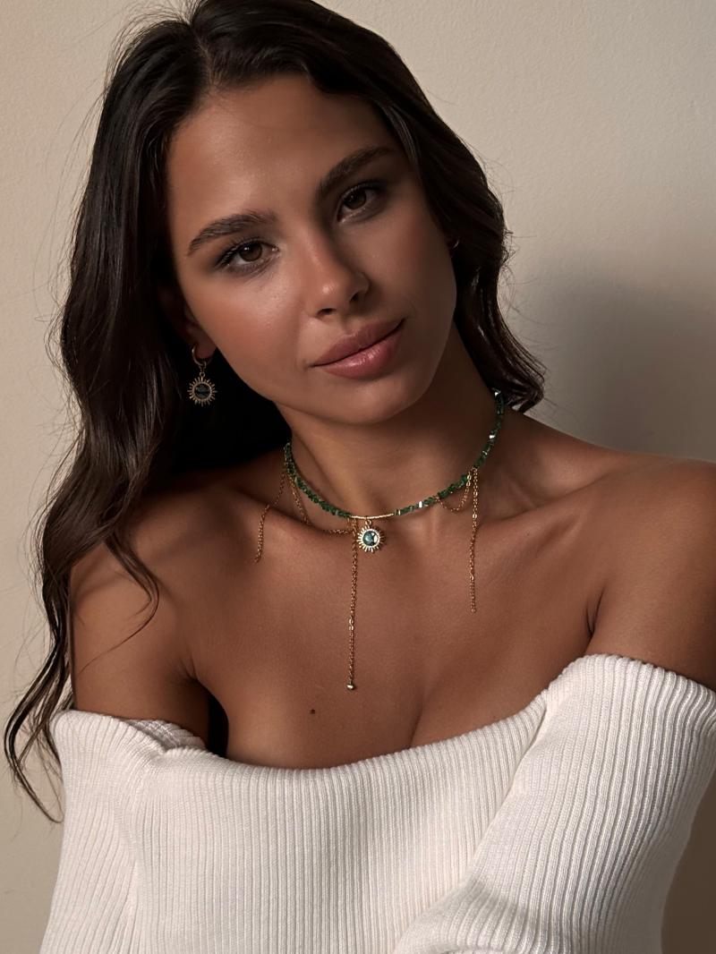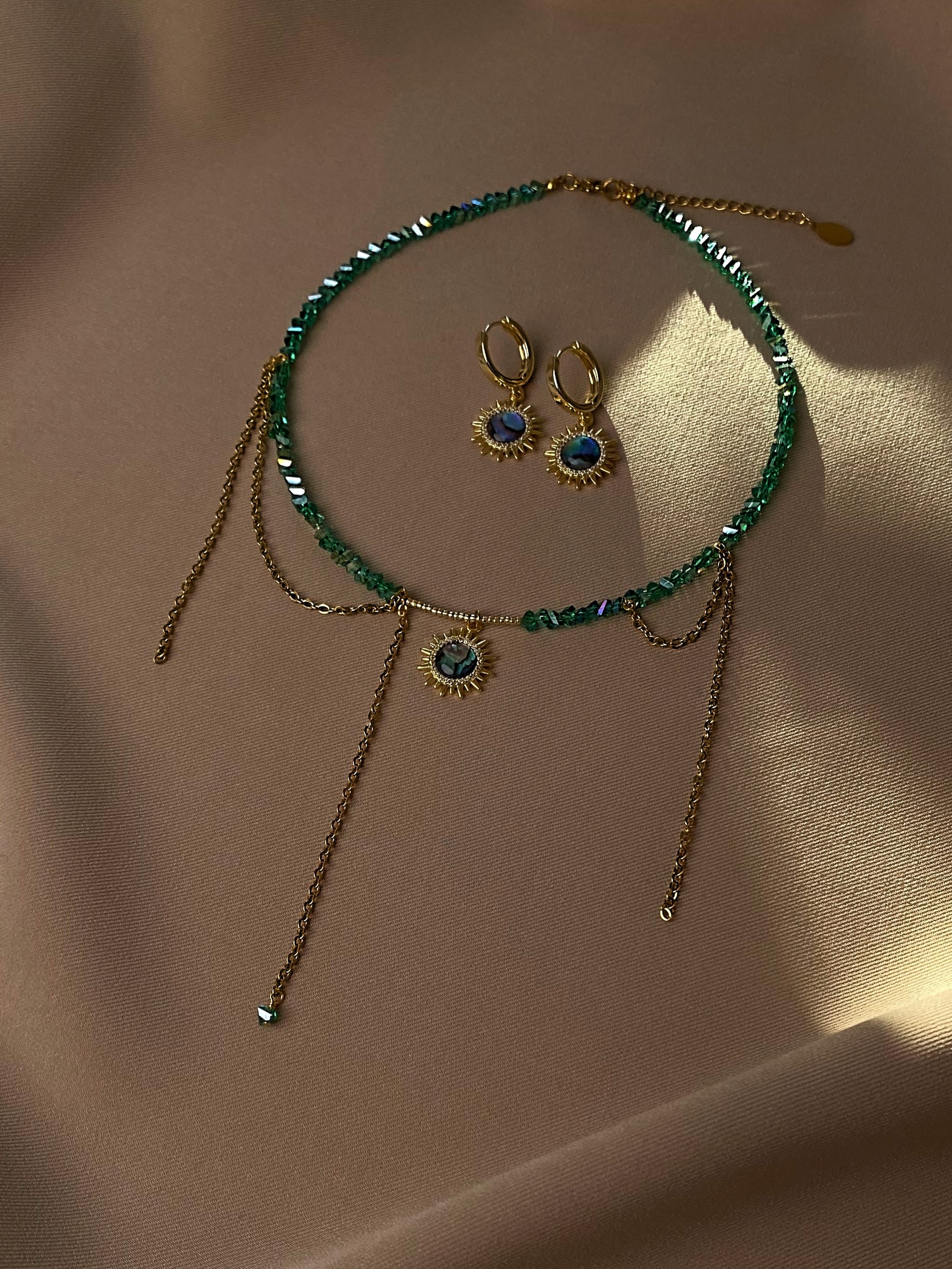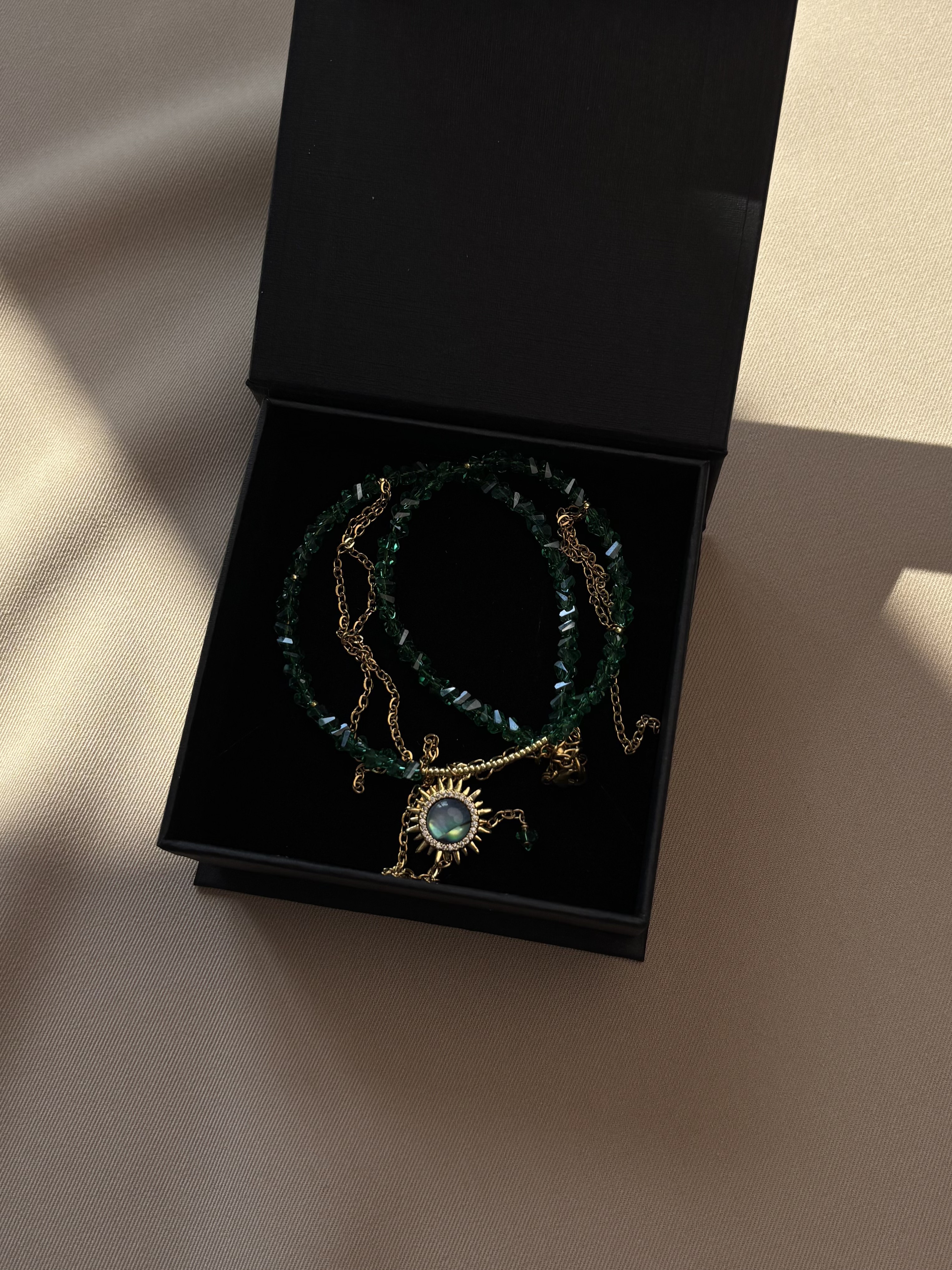Кольє з відбірного кришталю зеленого кольору, з додаванням ланцюжків та кулону. Матеріал фурнітури: ювелірна сталь з позолотою (у золотому кольорі) Стандартна довжина 36 см та 6 см подовжувач. Замір шиї моделі впритул 29 см.