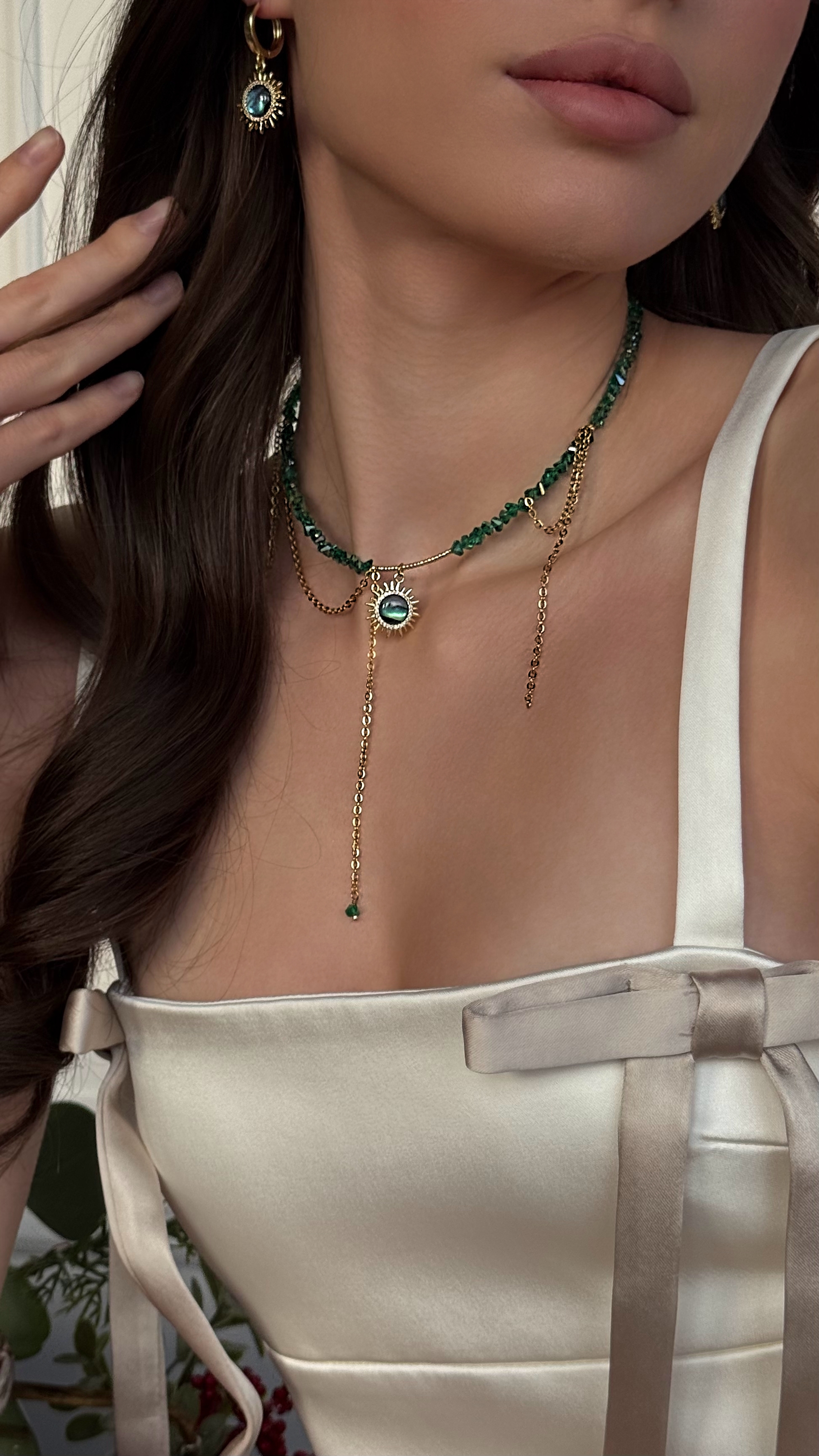 Кольє з відбірного кришталю зеленого кольору, з додаванням ланцюжків та кулону. Матеріал фурнітури: ювелірна сталь з позолотою (у золотому кольорі) Стандартна довжина 36 см та 6 см подовжувач. Замір шиї моделі впритул 29 см.