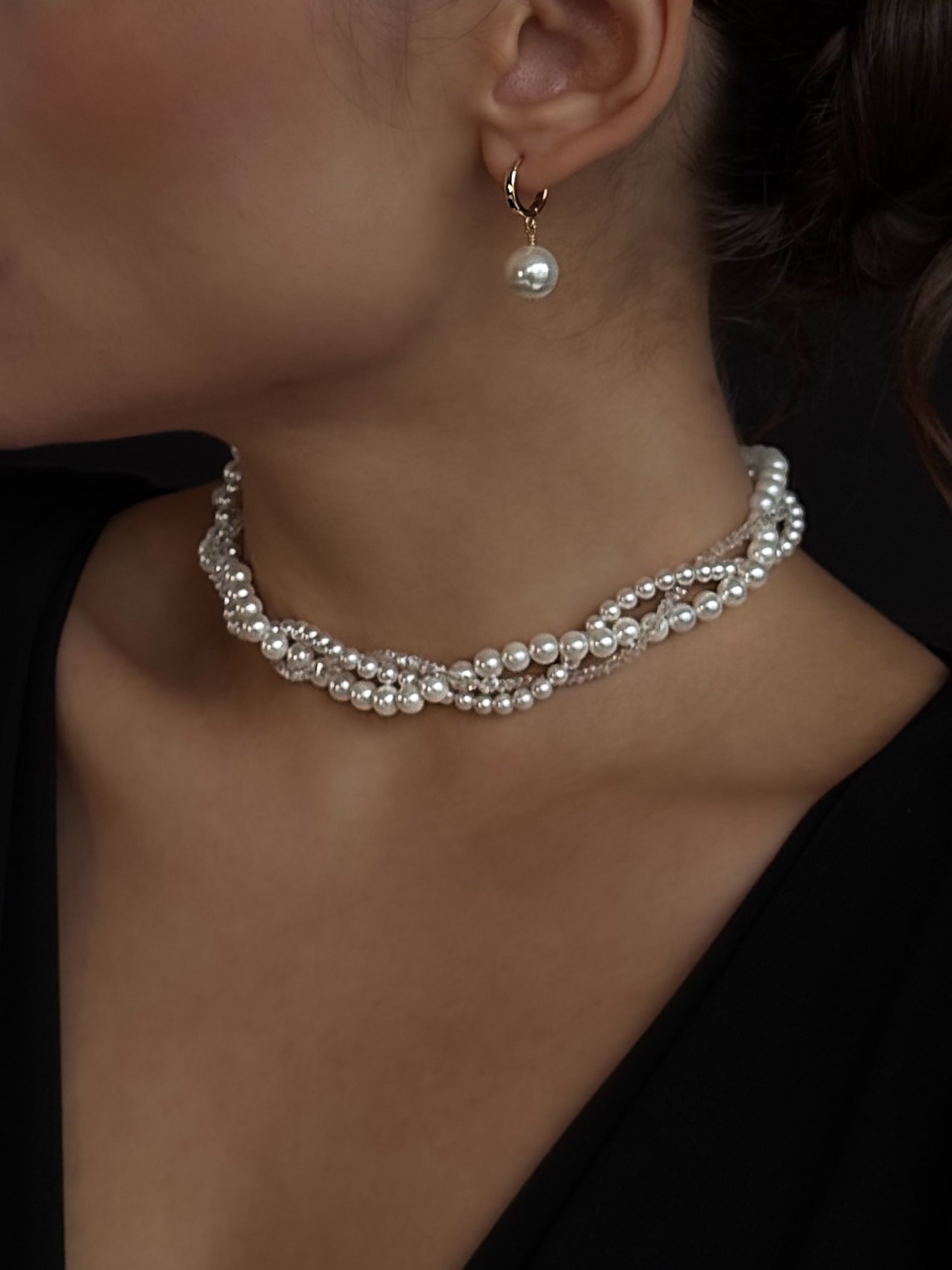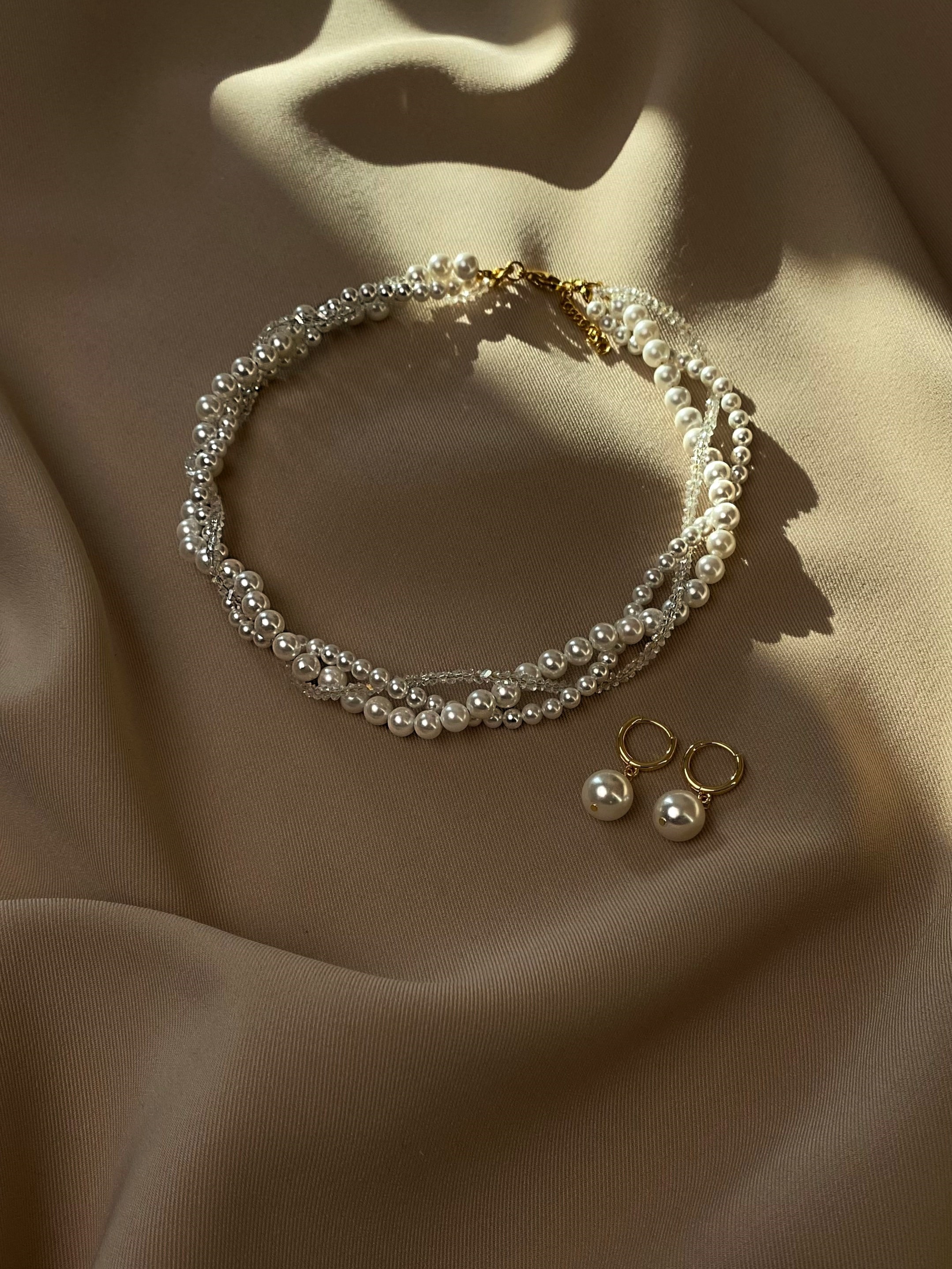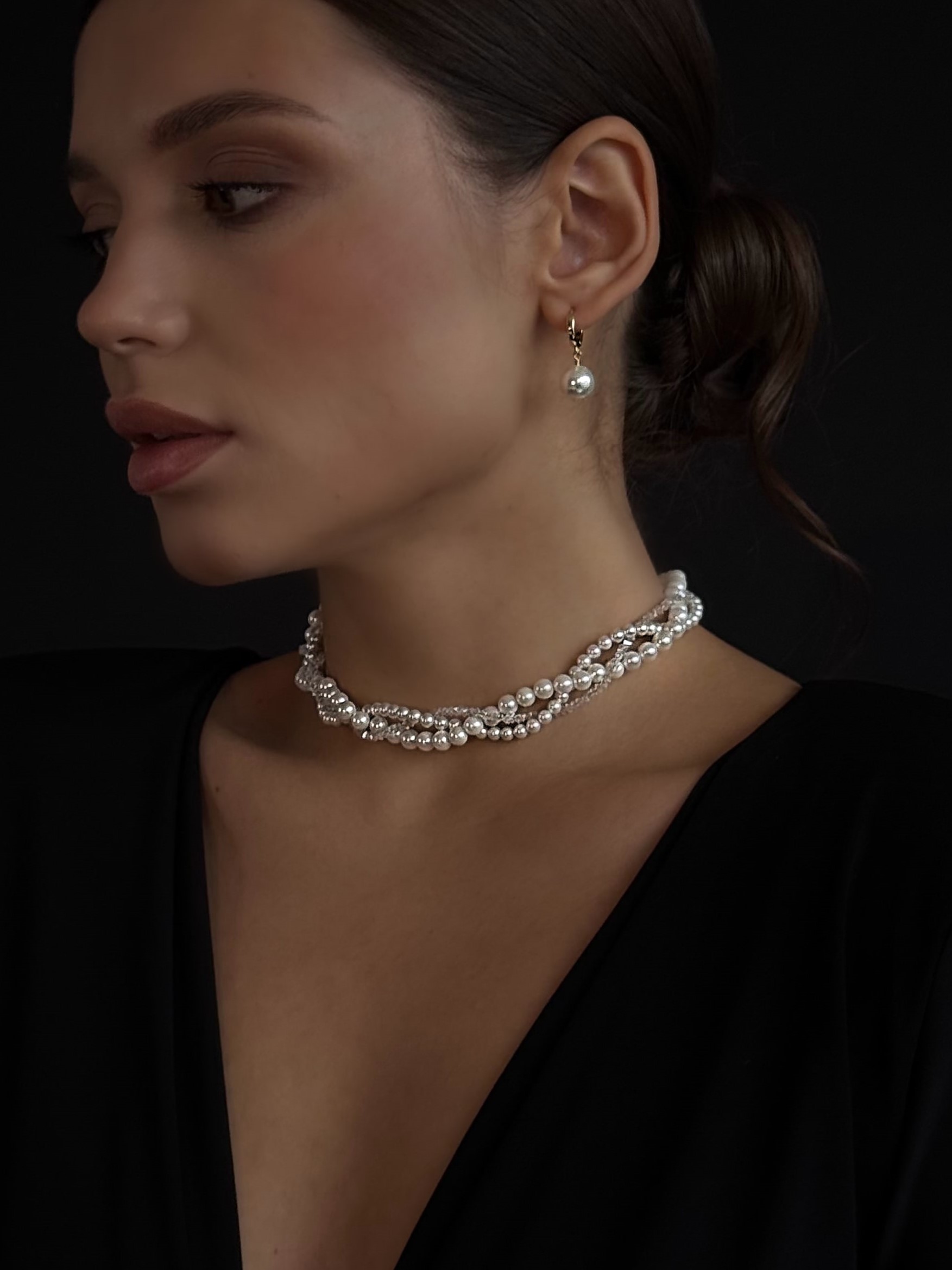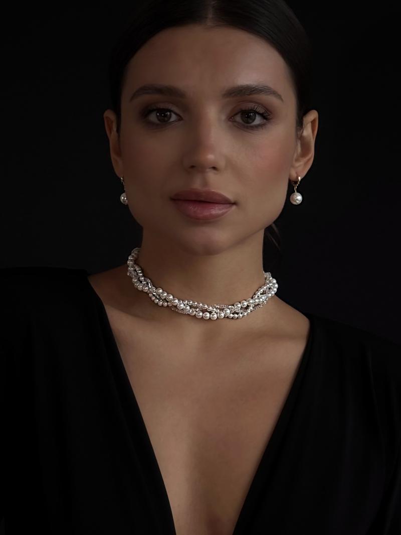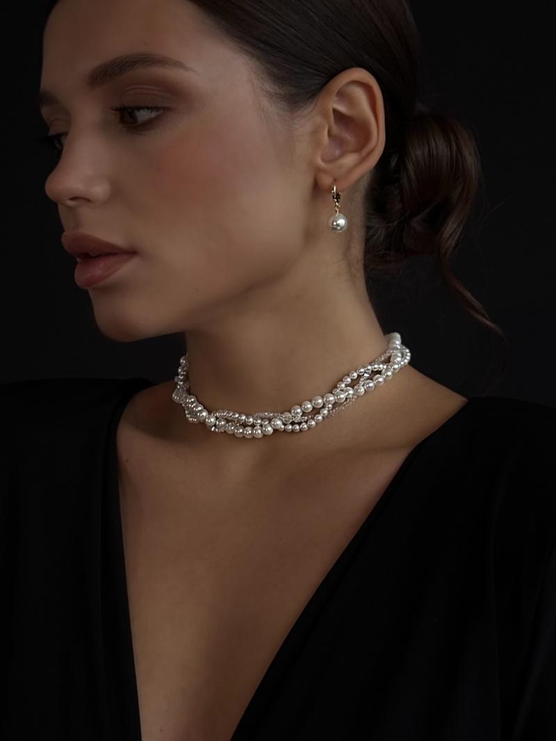 Потрійне кольє з перлин Майорка та відбірного прозорого кришталю. Фурнітура нержавіюча ювелірна сталь з позолотою (у золотому кольорі). Стандартна довжина 37 см та 6 см подовжувач. Замір шиї моделі впритул 29 см.