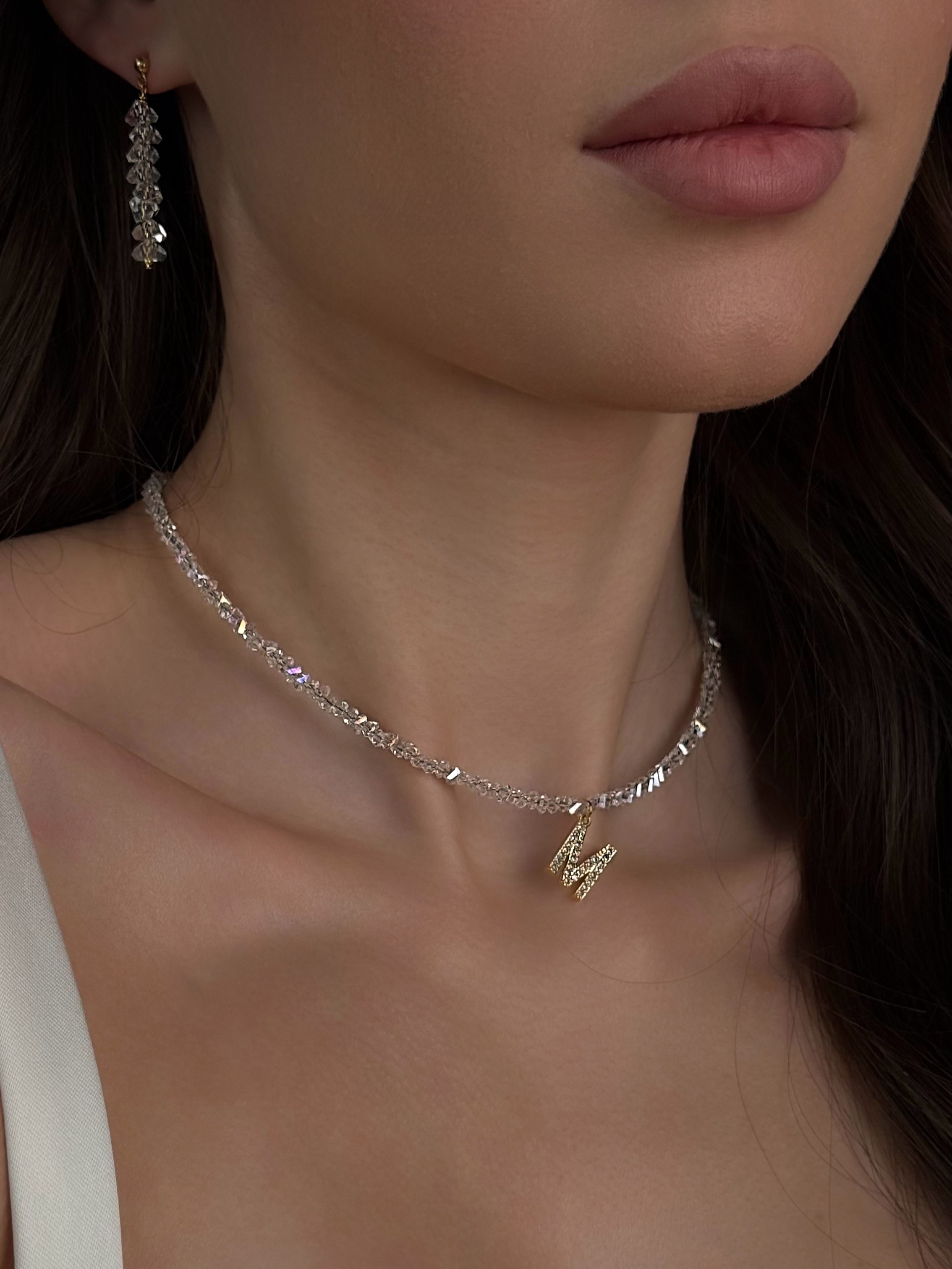 Чокер з прозорого кришталю з додаванням літери. Матеріал фурнітури ювелірна нержавіюча сталь (у золотому кольорі). Стандартна довжина 36 см та 6 см подовжувач. Замір шиї моделі впритул 29 см.
