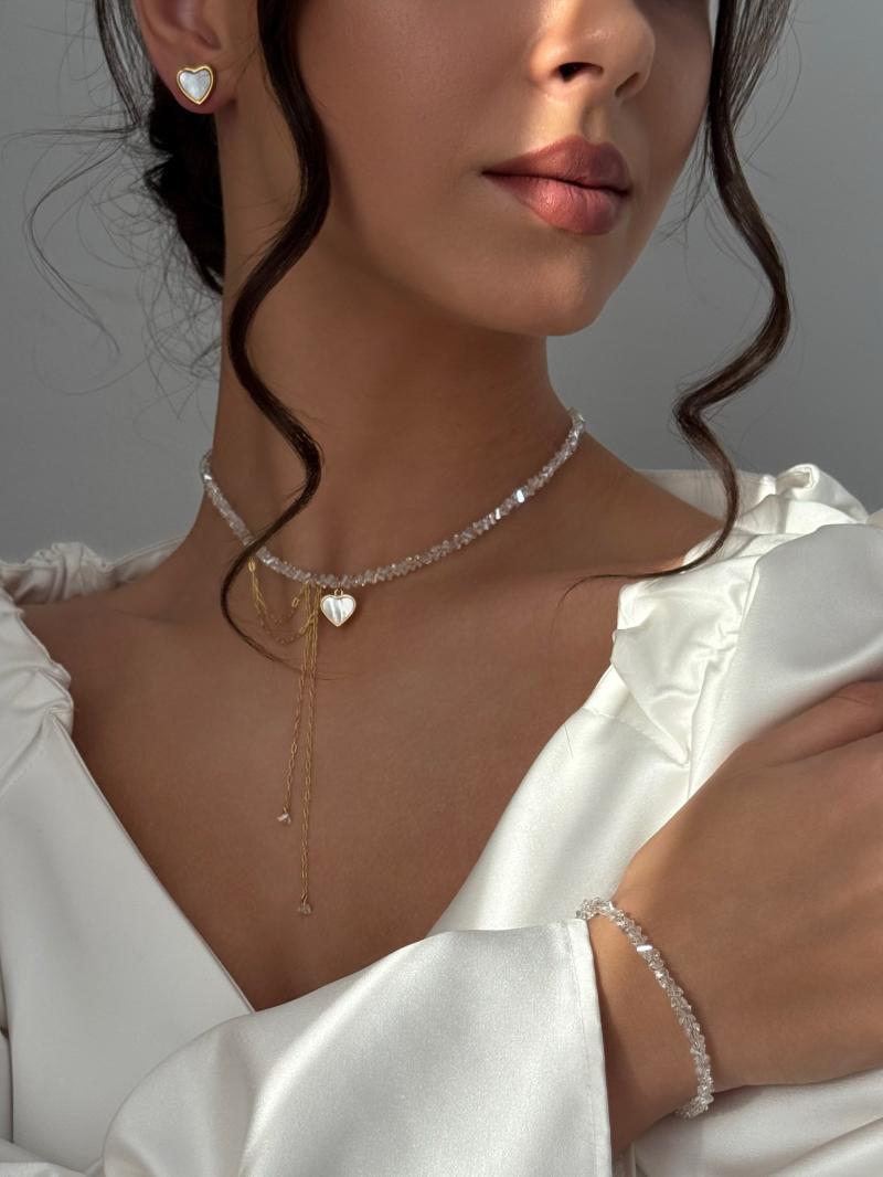 Чокер з прозорого кришталю з додаванням літери. Матеріал фурнітури ювелірна нержавіюча сталь (у золотому кольорі). Стандартна довжина 36 см та 6 см подовжувач. Замір шиї моделі впритул 29 см.