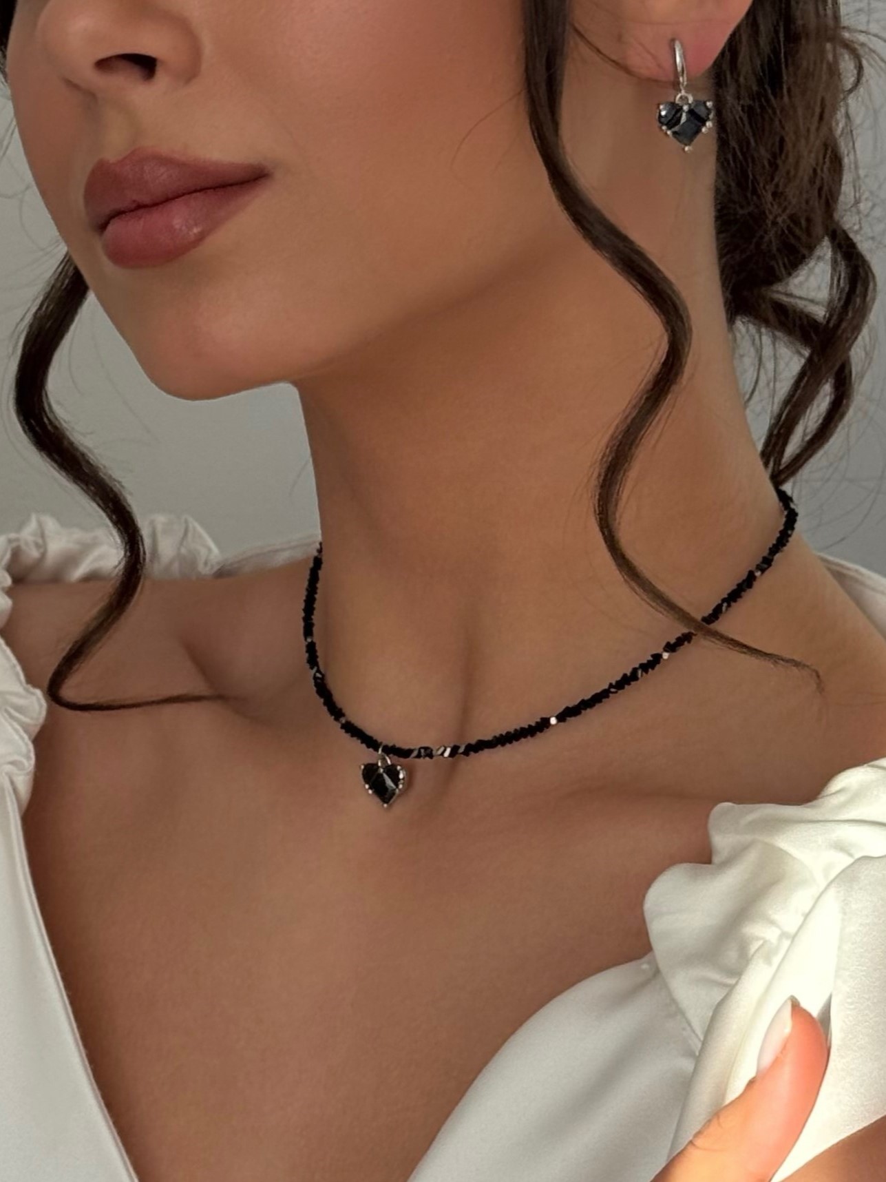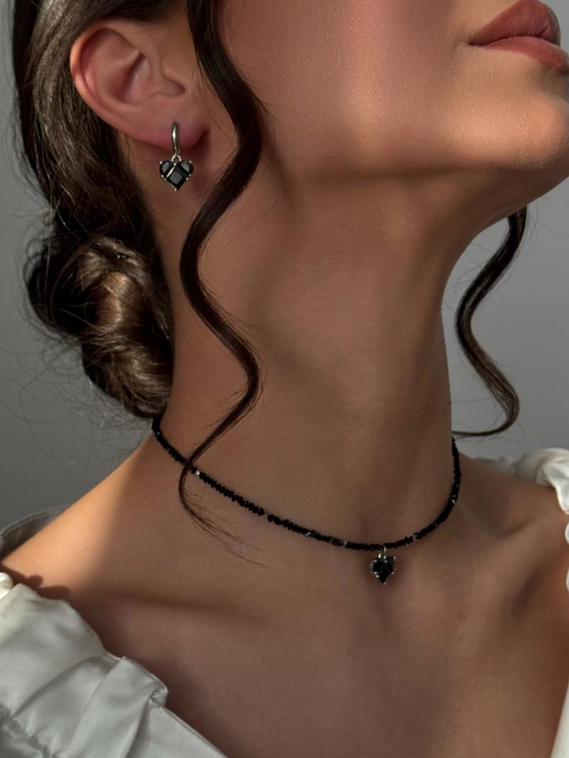 Вишукані сережки з серцями чорного кольору. Основа зручна та надійна. Матеріал латунь з покриттям родій (у срібному кольорі).