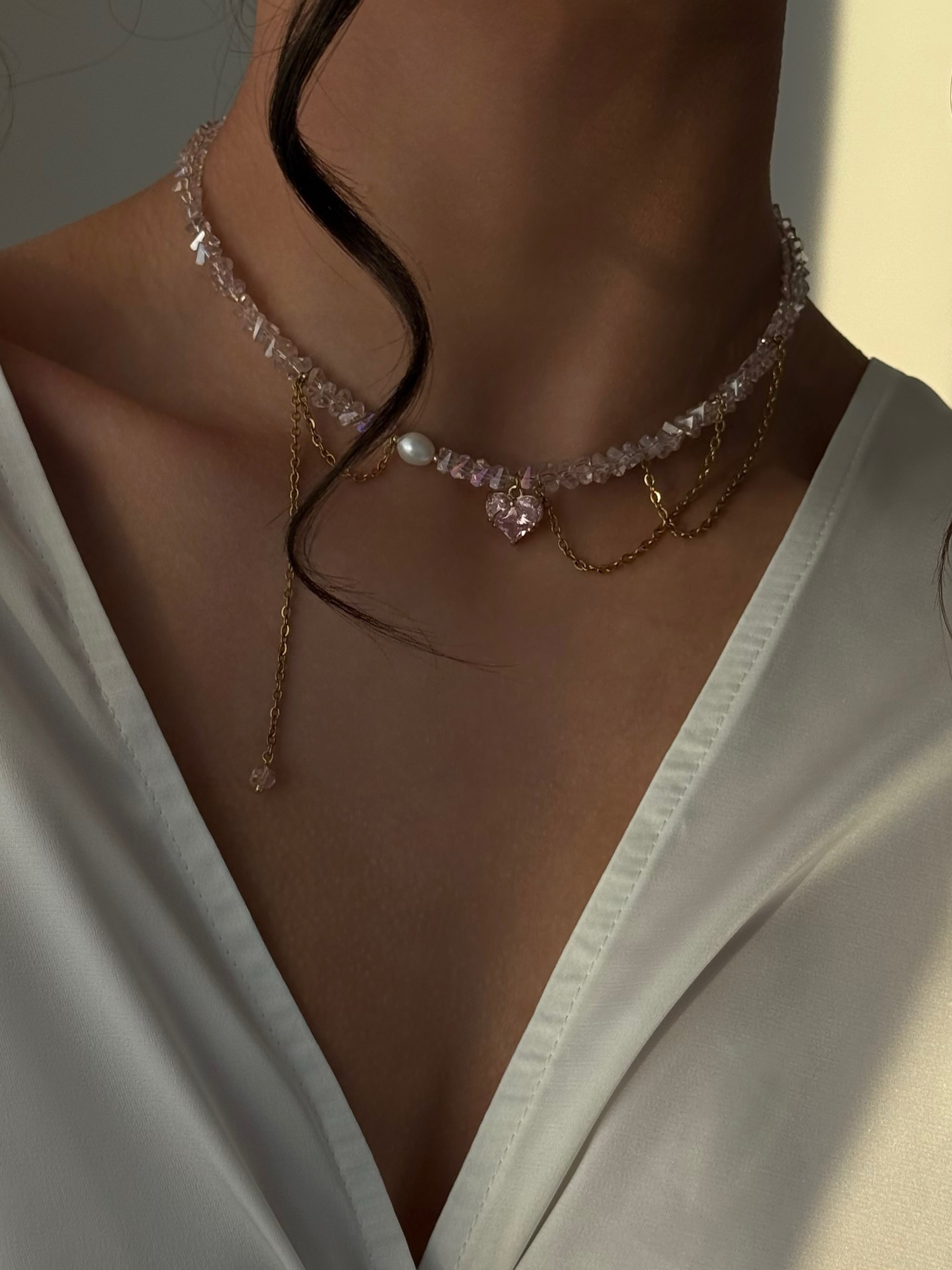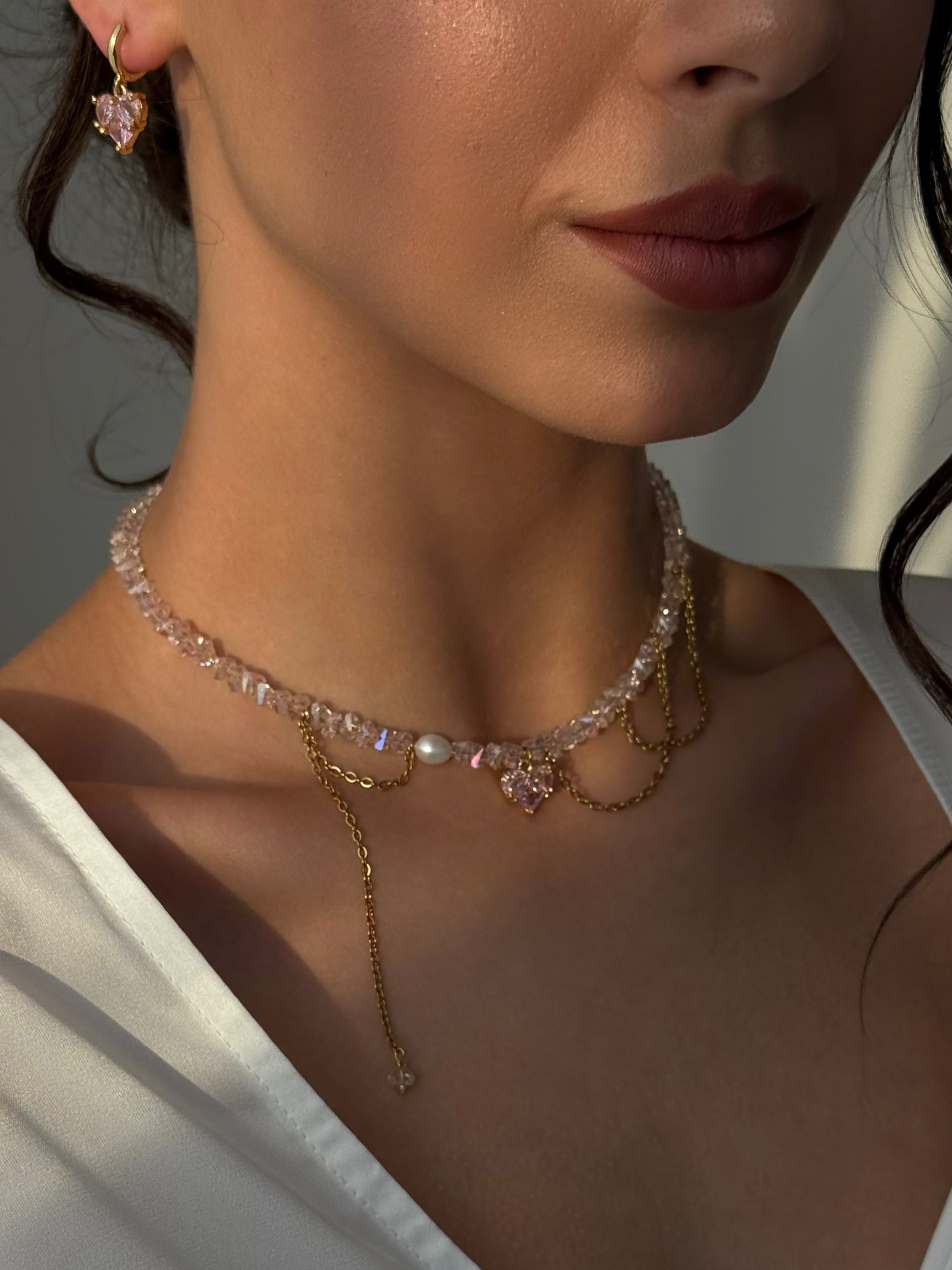 Кольє з рожевого кришталю та ланцюжка з кулоном серце