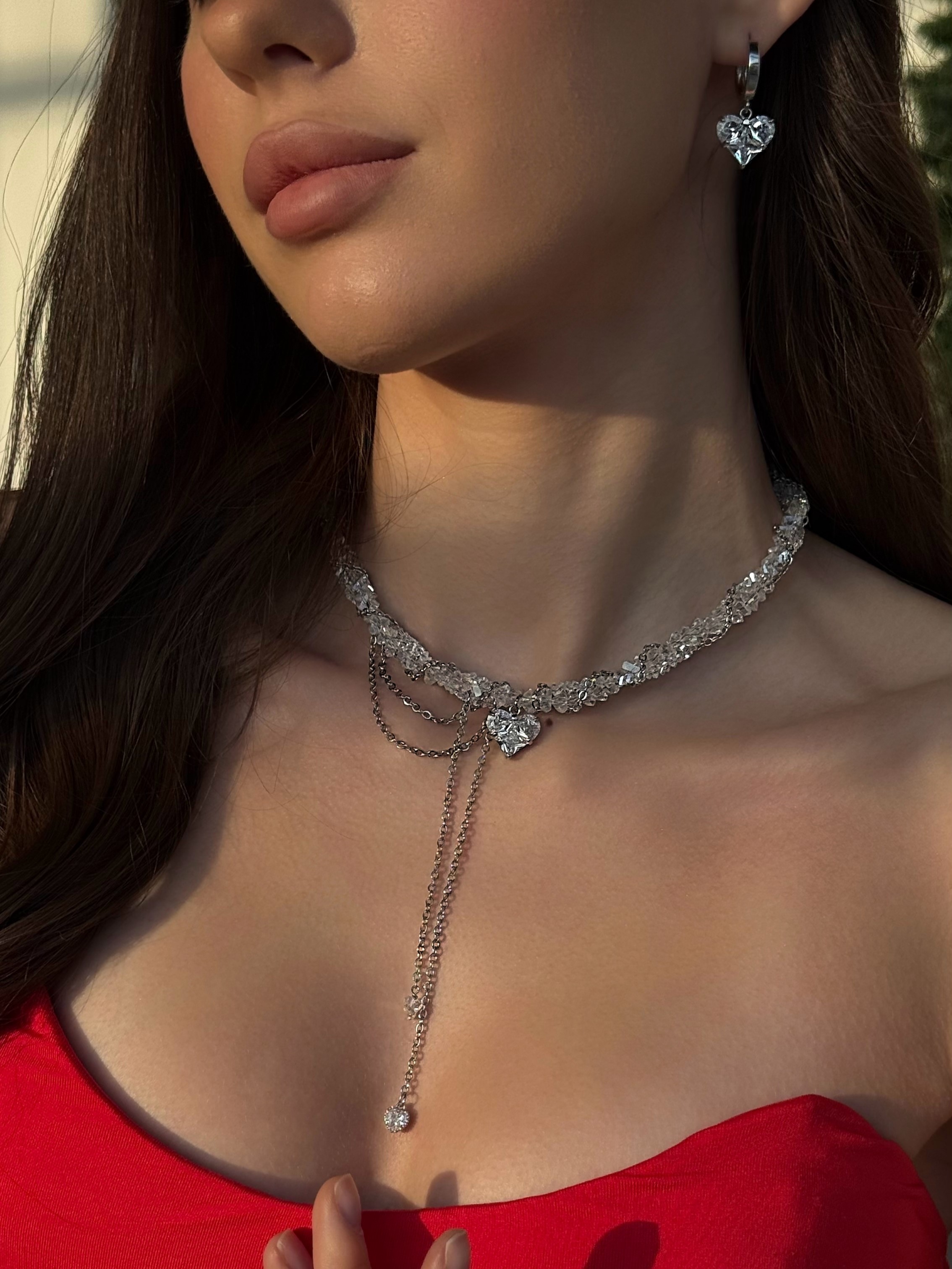 - Кольє з прозорого кришталю та ланцюжка з кулоном серце