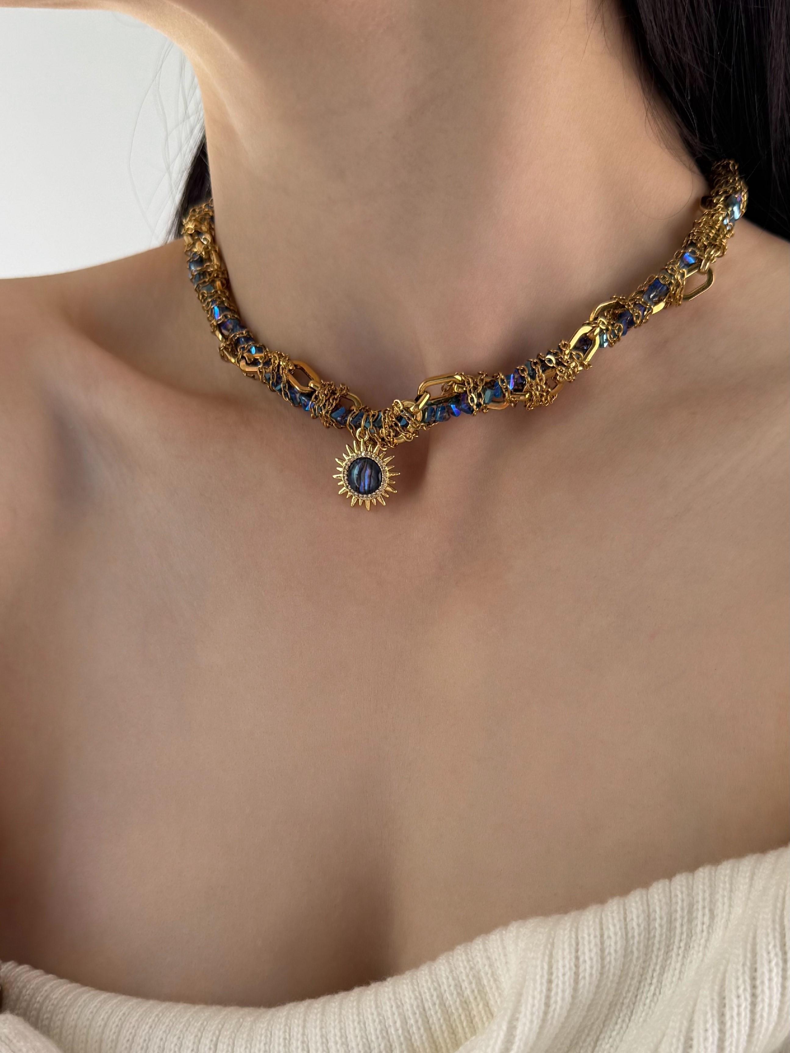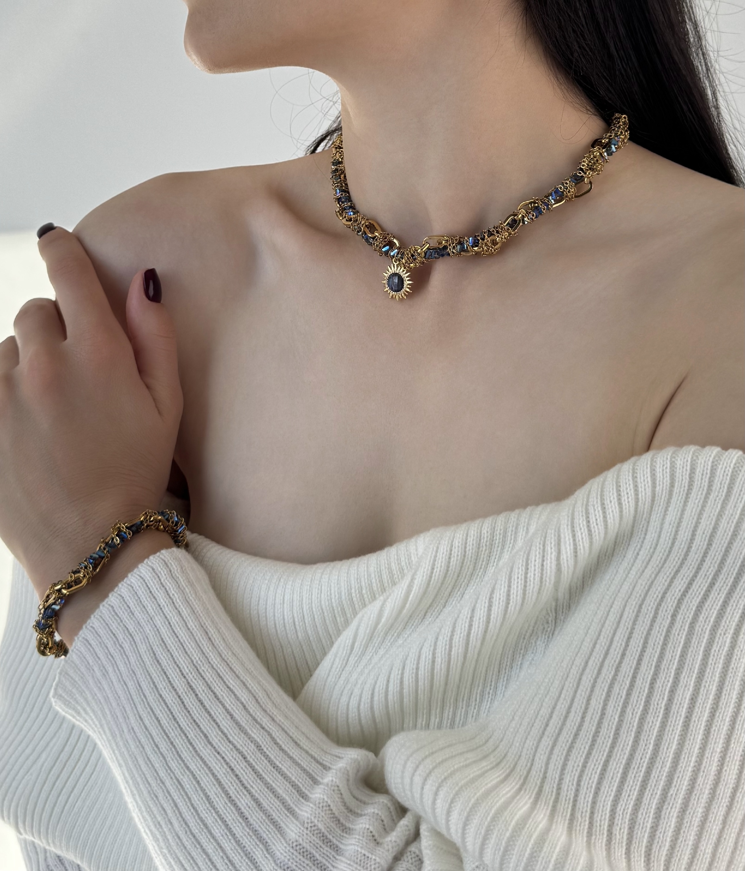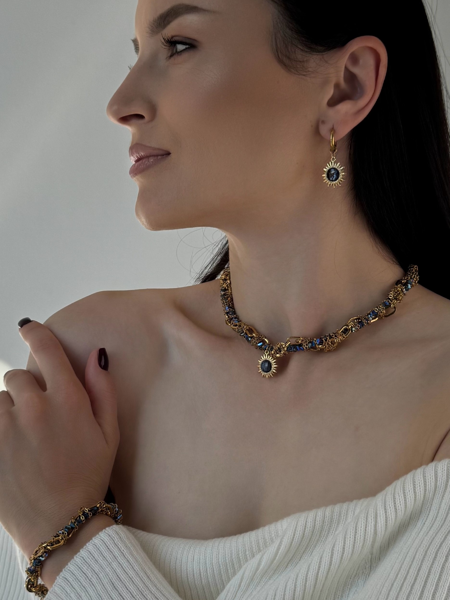Кольє з відбірного кришталю космічного кольору, з додаванням ланцюжків та кулону. Матеріал фурнітури: ювелірна сталь з позолотою (у золотому кольорі) Стандартна довжина 37 см та 6 см подовжувач. Замір шиї моделі впритул 29 см.