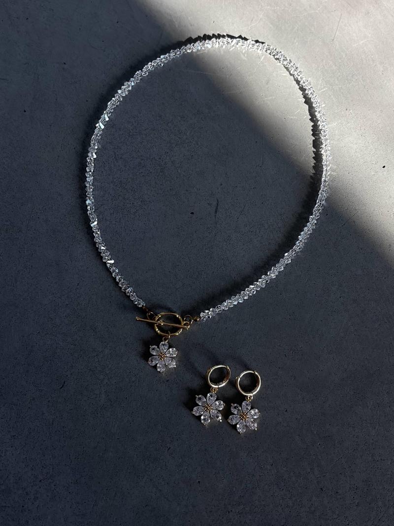 Кольє з відбірного прозорого кришталю з квіткою. Матеріал фурнітури: латунь з покриттям позолоти (у золотому кольорі). Стандартна довжина 43 см. Замір шиї моделі впритул 29 см.