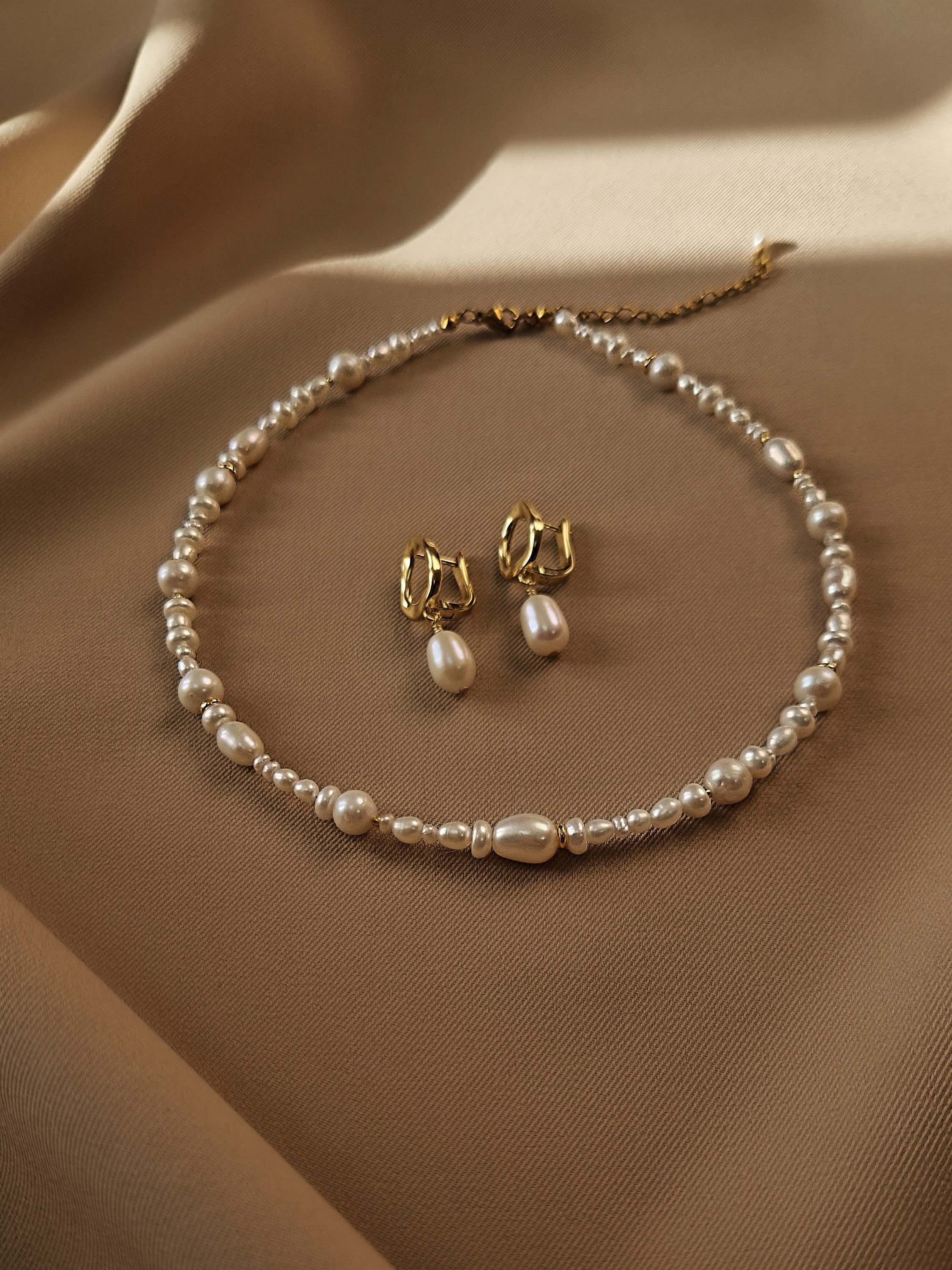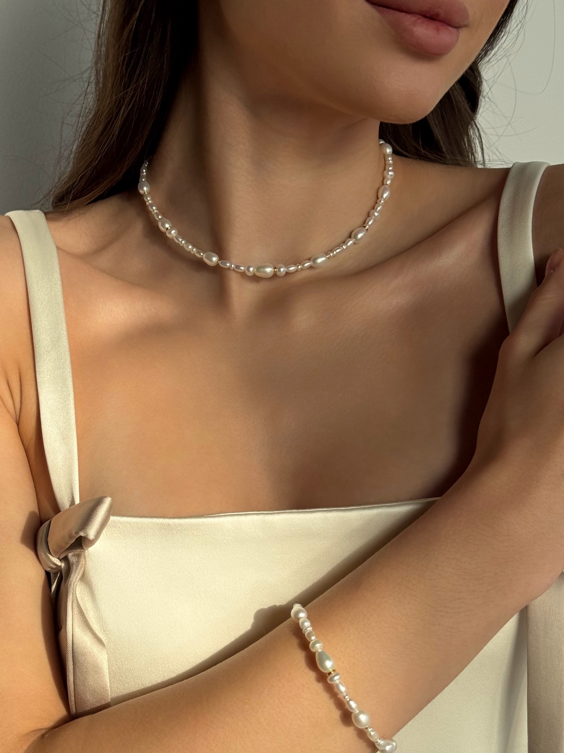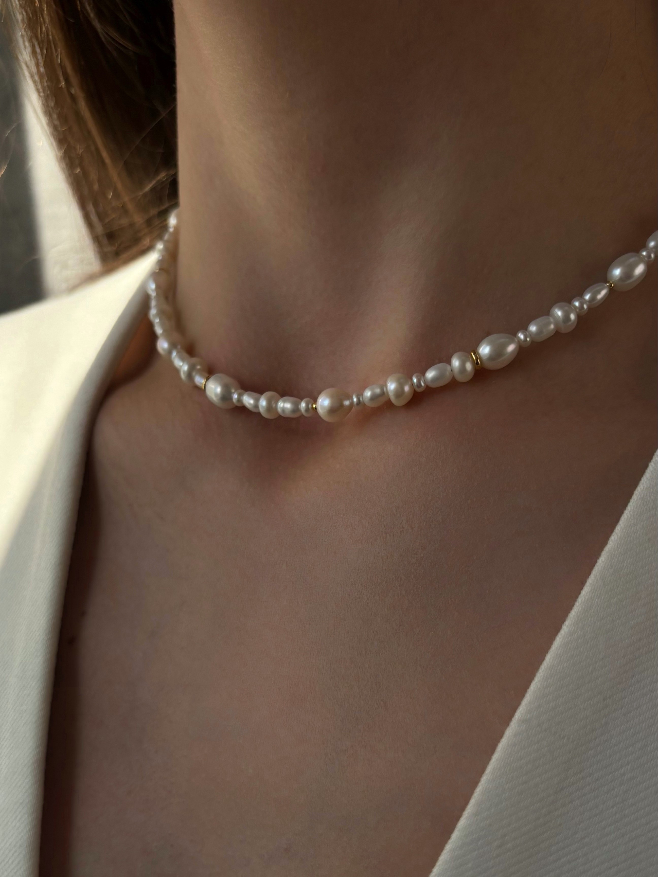 Чокер з міксу різних натуральних перлин, доповнений позолоченими елементами. Матеріал фурнітури ювелірна нержавіюча сталь (у золотому кольорі). Стандартна довжина чокеру навколо шиї 36 см та 6 см подовжувач. Замір шиї моделі - 29 см впритул.