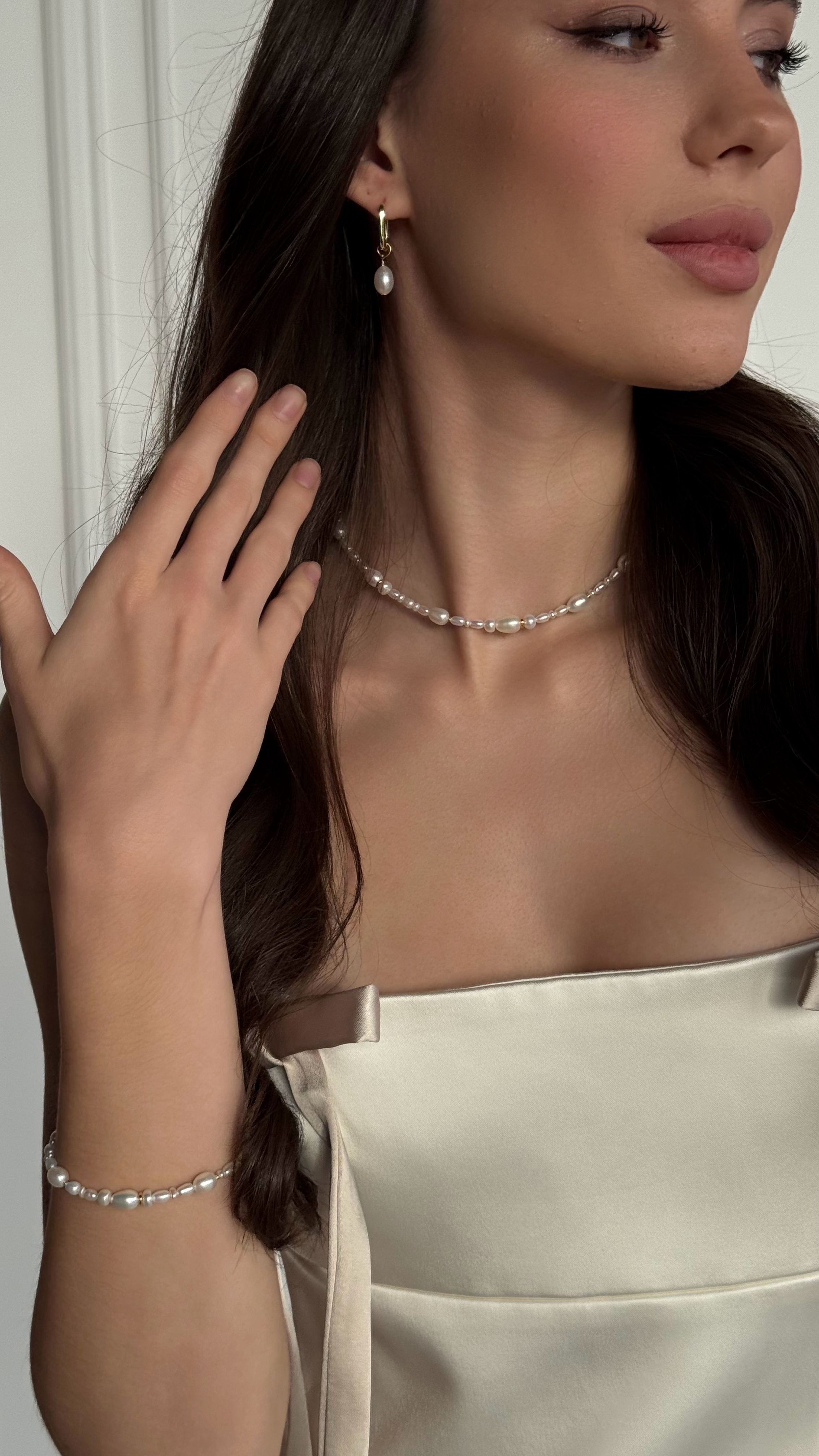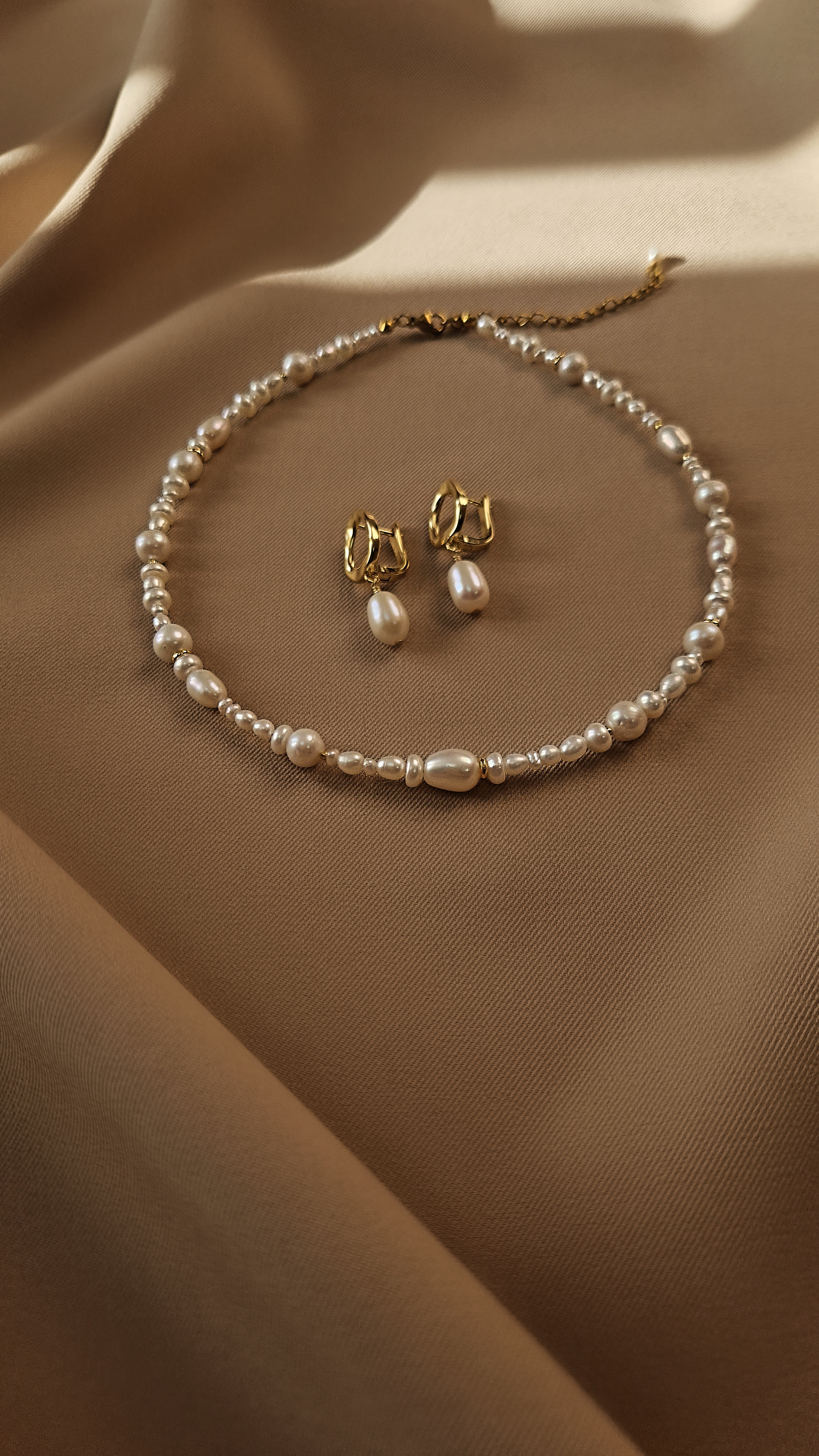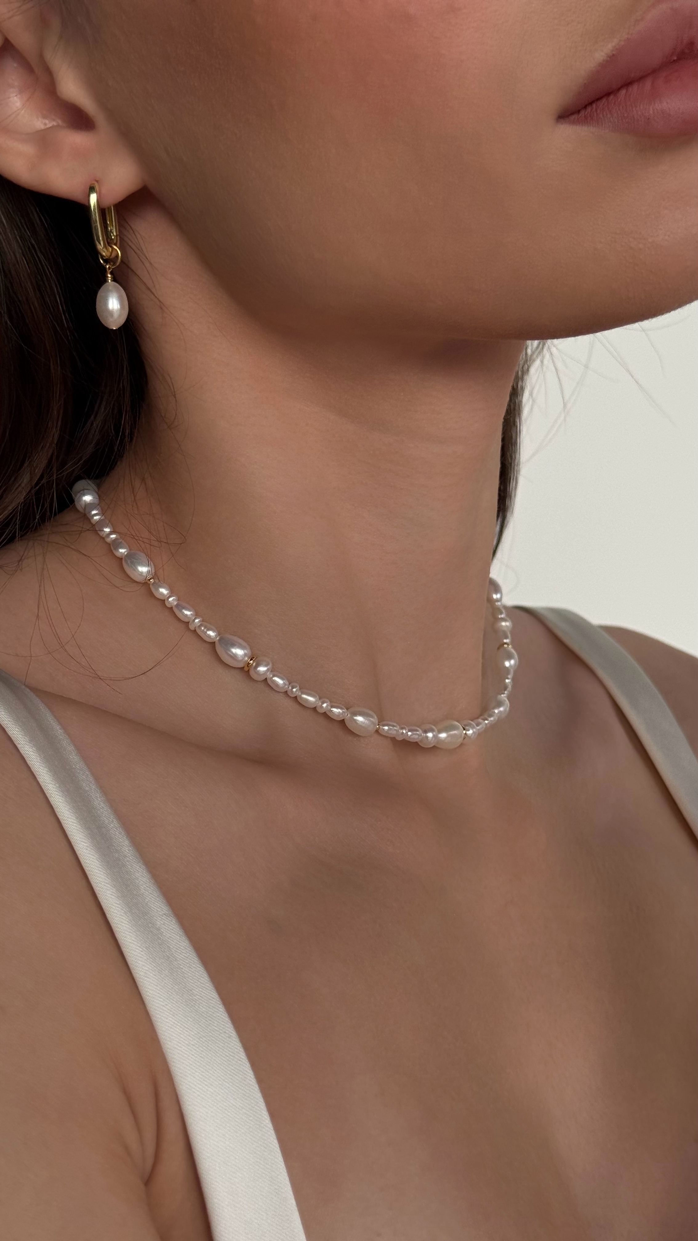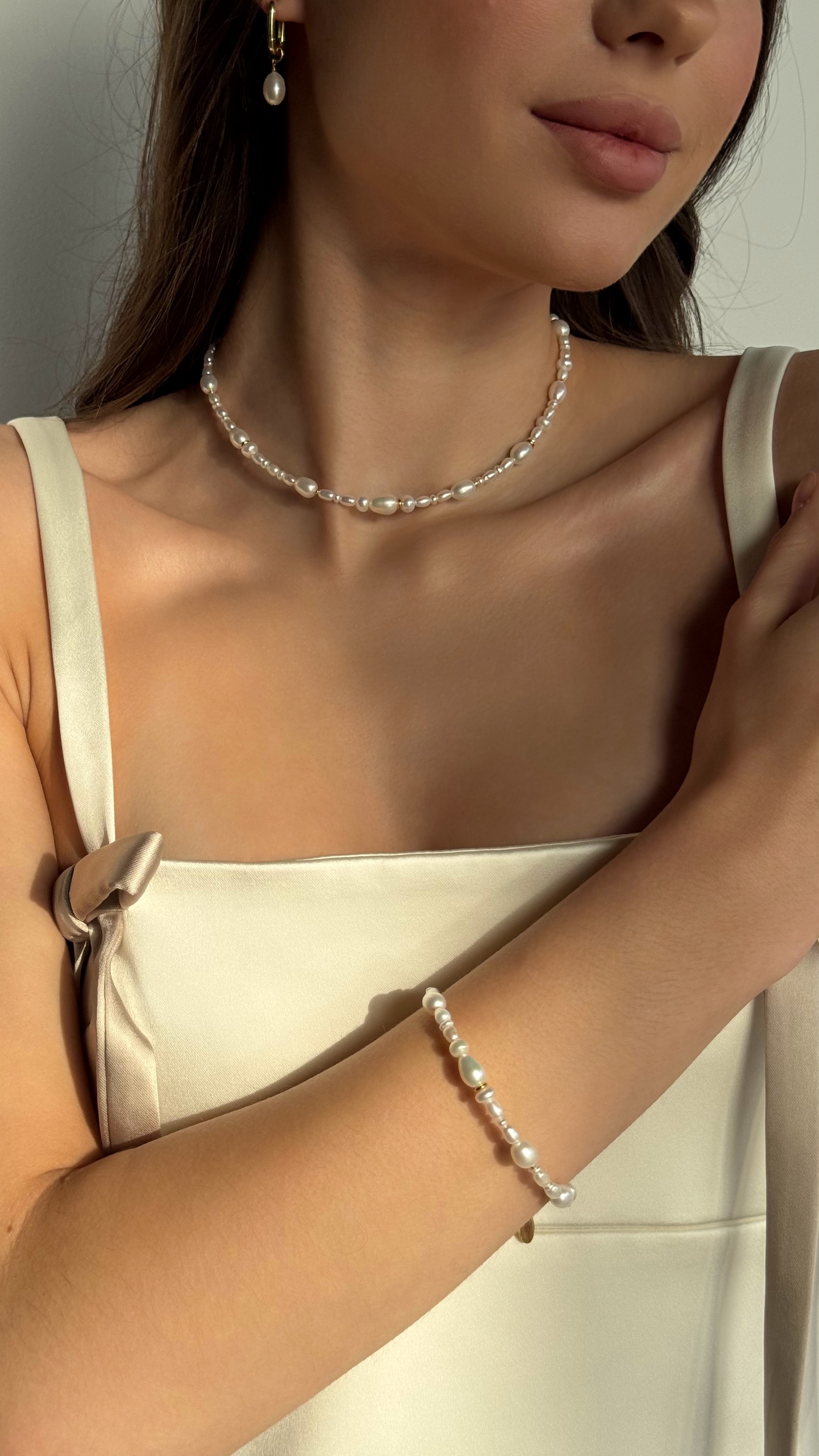 Чокер з міксу різних натуральних перлин, доповнений позолоченими елементами. Матеріал фурнітури ювелірна нержавіюча сталь (у золотому кольорі). Стандартна довжина чокеру навколо шиї 36 см та 6 см подовжувач. Замір шиї моделі - 29 см впритул.