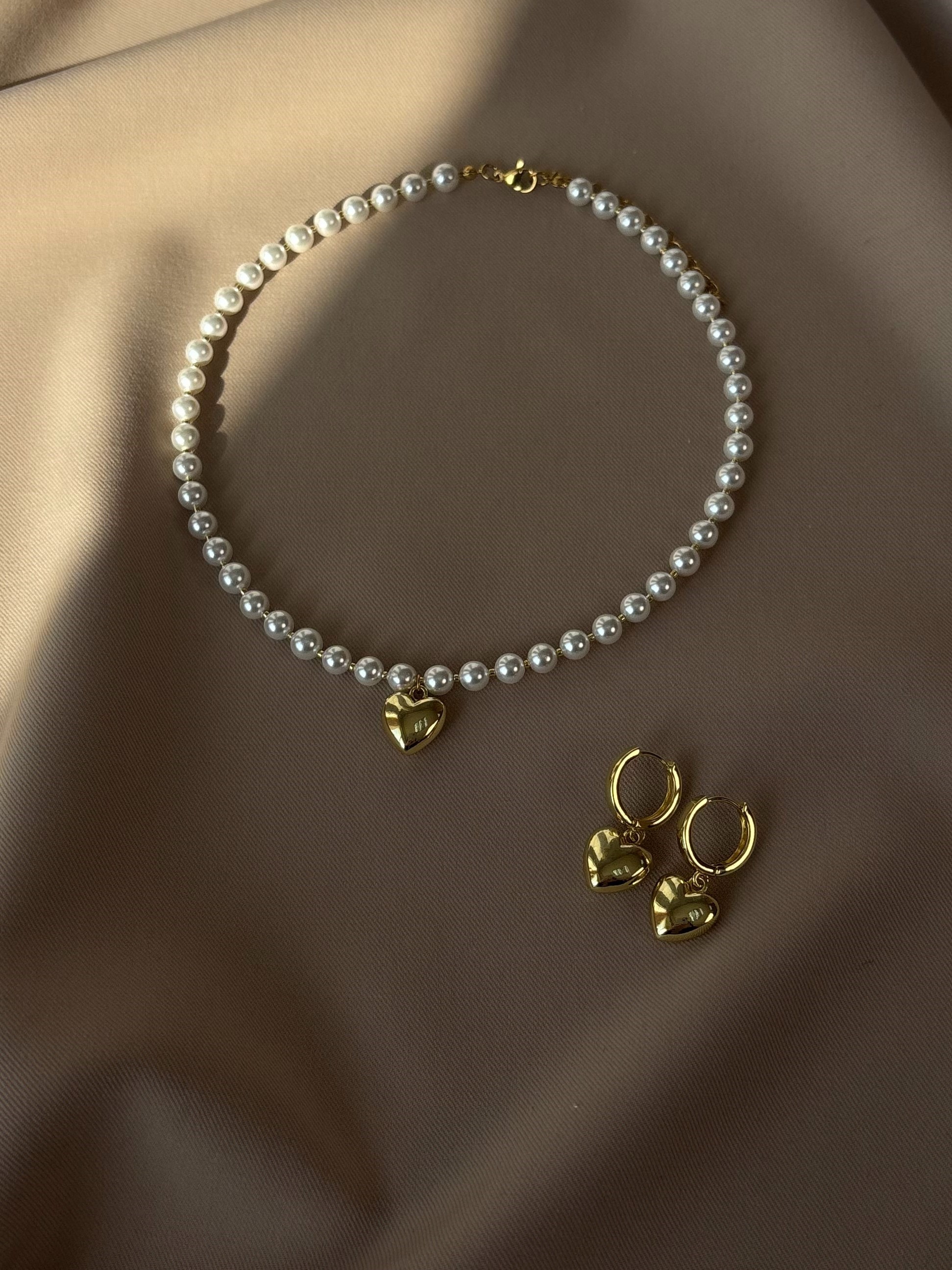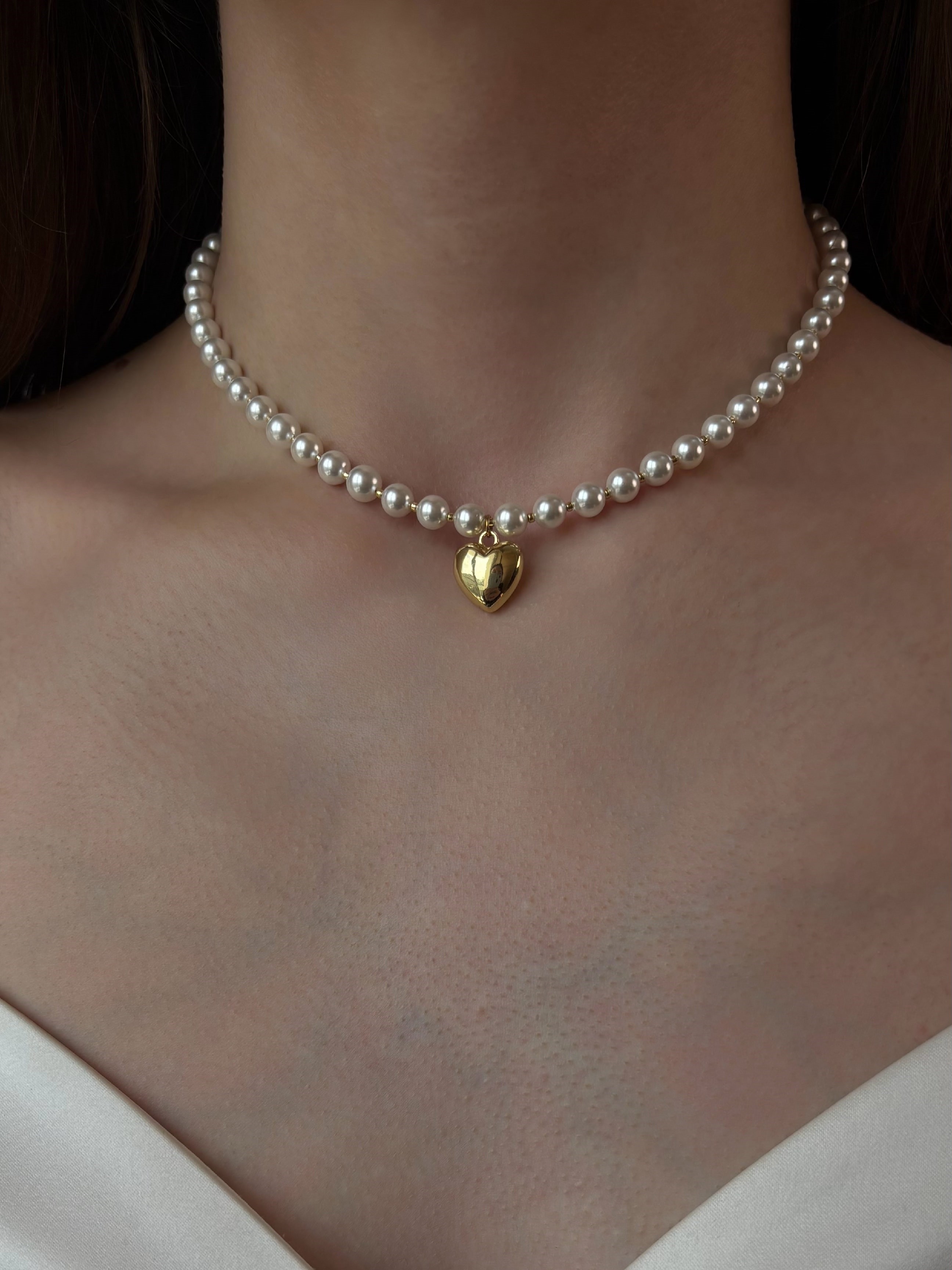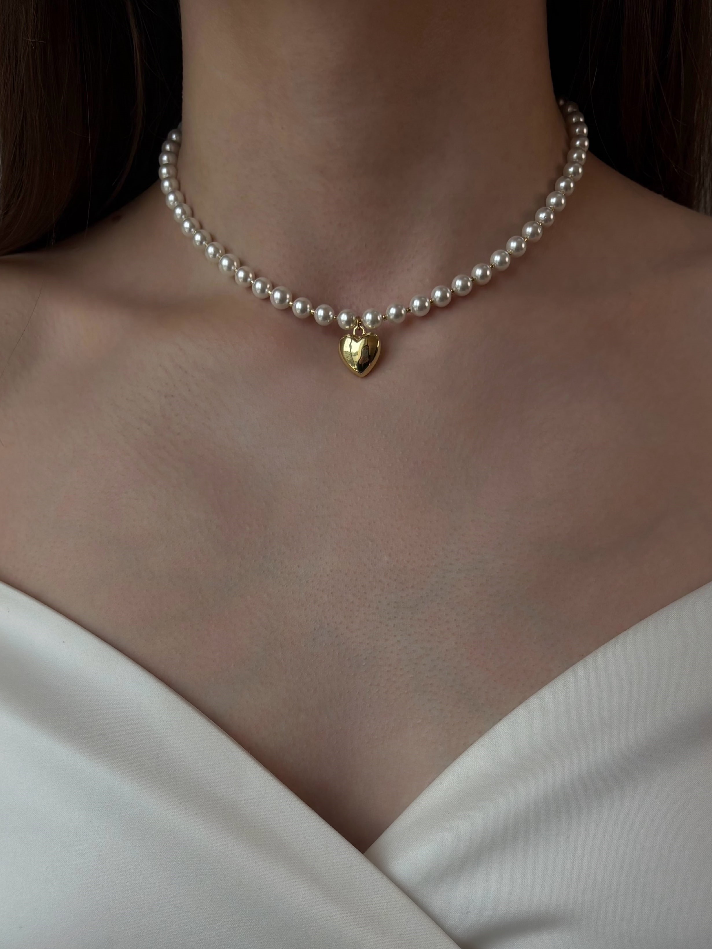 Кольє виготовлене з надзвичайно блискучих перлин Майорка. Матеріал фурнітури ювелірна нержавіюча сталь та латунь з покриттям позолоти 18 карат (у золотому кольорі). Стандартна довжина 36 см та 6 см подовжувач.